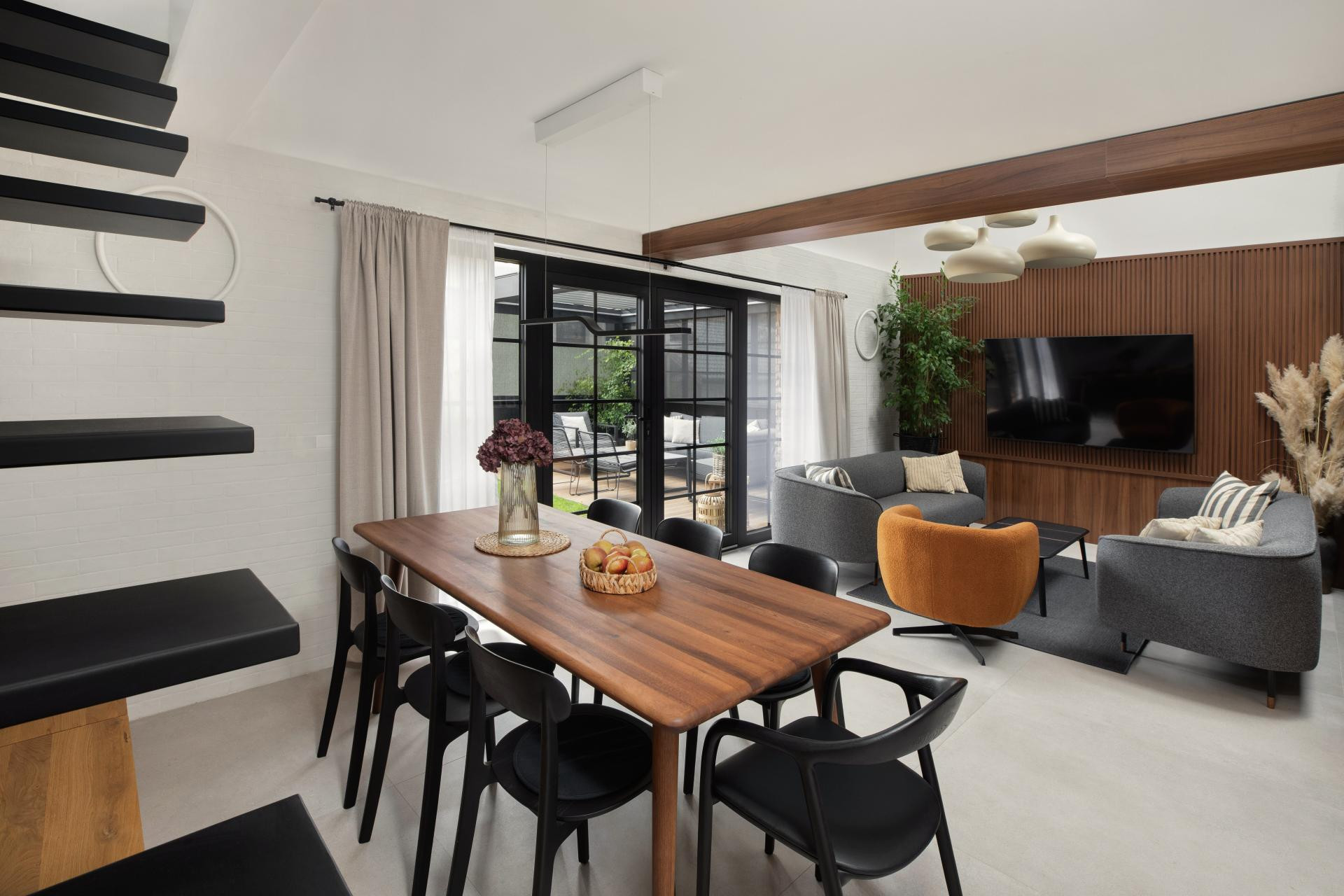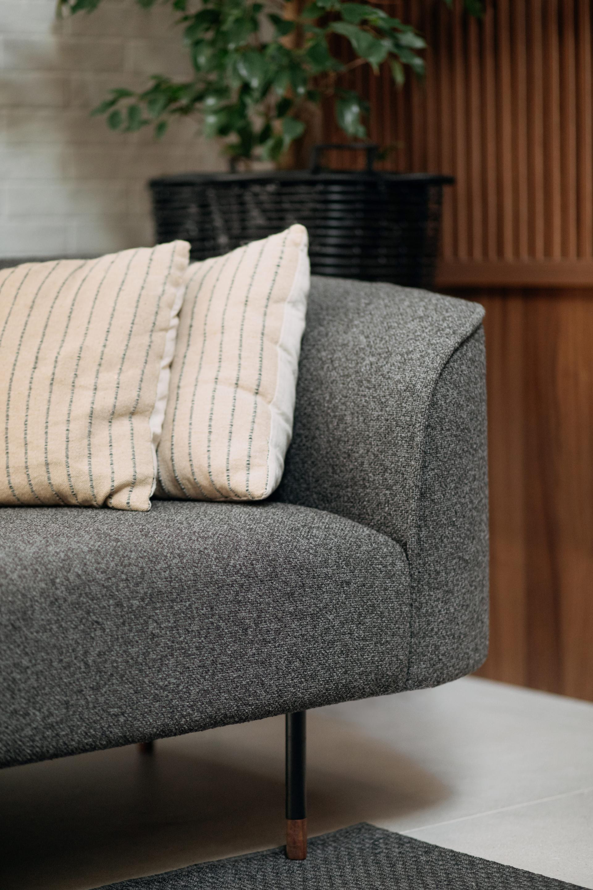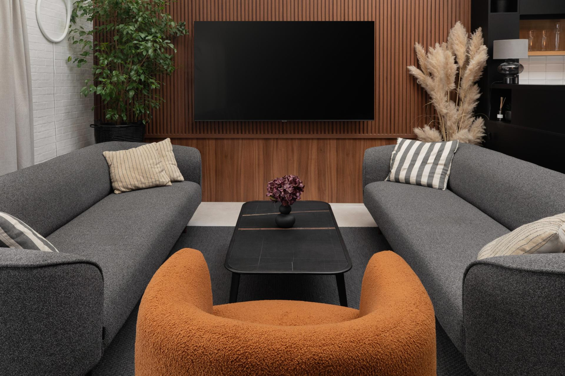 Materijali prevladavaju prirodni: drvo, cigla, keramika i crni detalji. Namještaj po mjeri provučen je kroz cijeli interijer, u suradnji s partnerima iz Visokog – Interiors by XY. Domaći brendovi imaju posebno mjesto: Artisan stolovi i stolice od punog drveta te sofe Le Mans domaćeg proizvođača Volumen po dizajnu Zorana Jedrejčića.