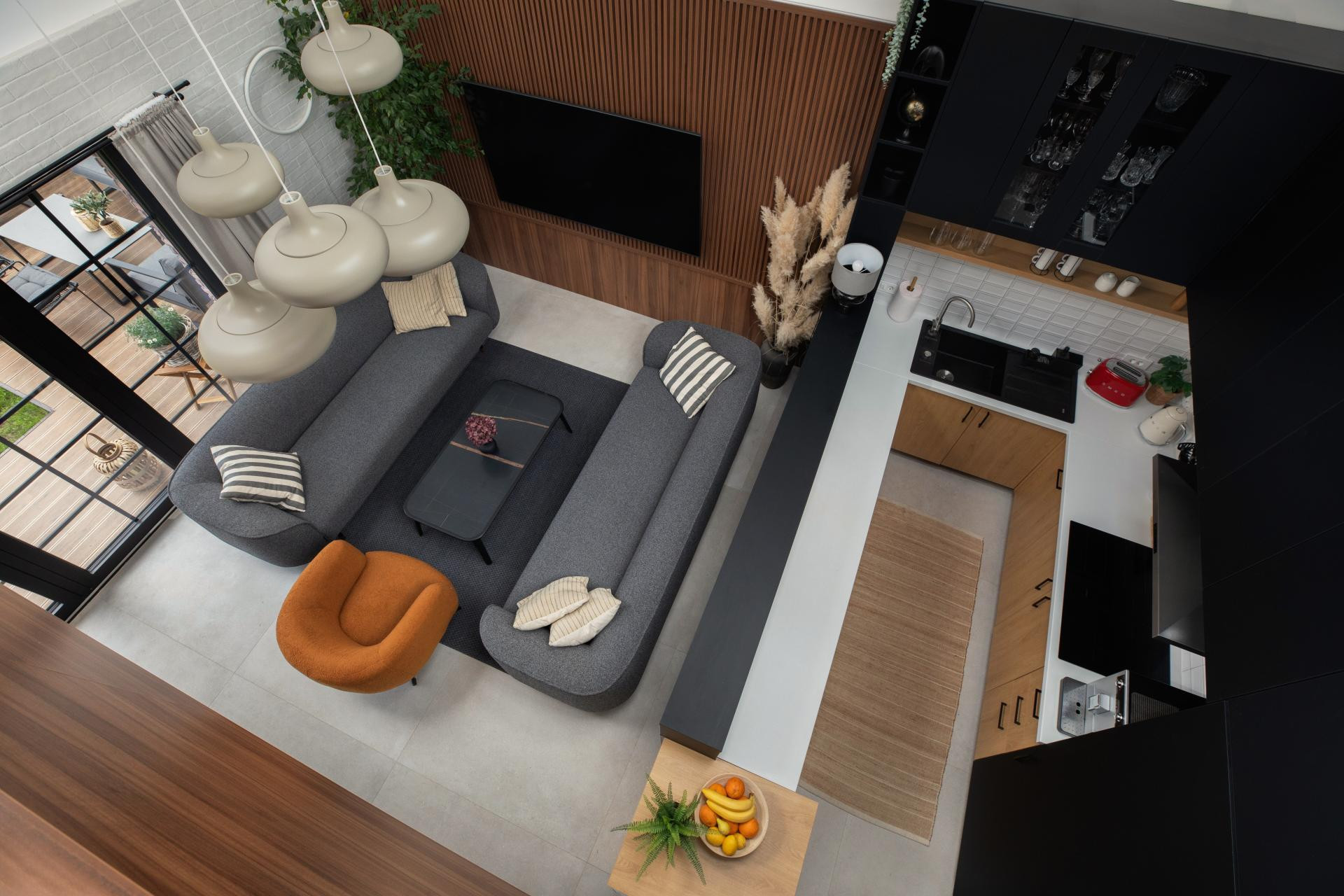 Dnevna zona open-space karaktera doima se iznimno prostrano zahvaljujući dvostrukoj visini stropa i krovnim prozorima. Kamin unosi toplinu pa je prostor ugodan i zimi.