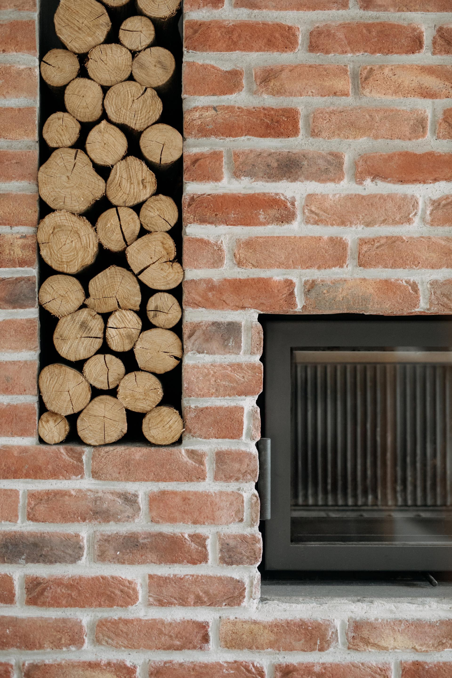 Paleta boja naglašava toplinu: drvo u dvije nijanse kombinira se s crnim detaljima stolarije i rasvjete, dok su zidovi uglavnom bijeli, ponegdje oplemenjeni ciglom. Kamin od iste cigle kao i fasada dodatno unosi domaćinsku atmosferu. Podovi su obloženi keramikom velikog formata svijetlosivog kamena, a dinamiku prostoru daju upečatljivi akcenti - narančasta fotelja, crveno kuhalo i zelenilo.