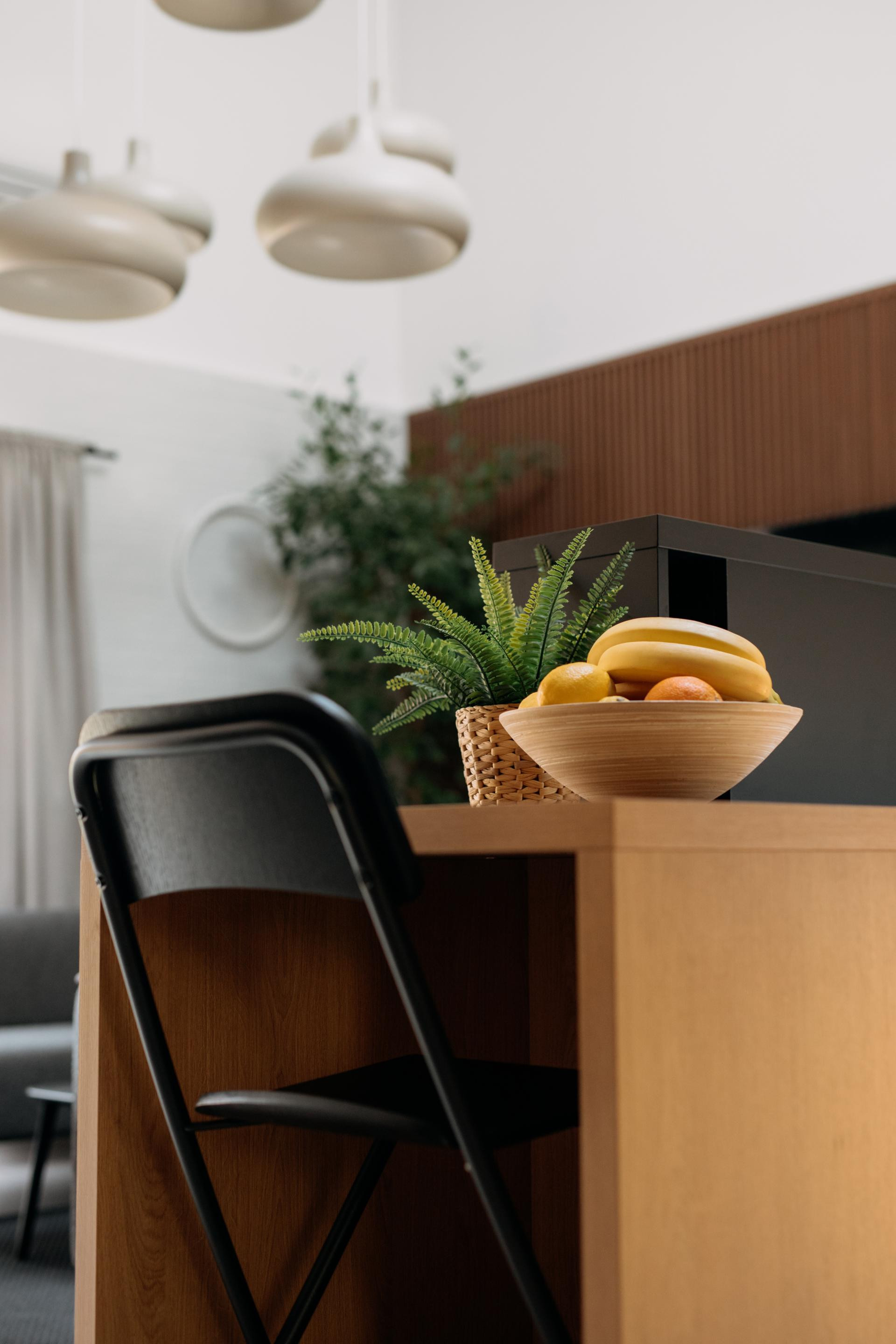 Kuhinja je oblikovana u slovo U, s povišenim pultom koji dijeli prostor od dnevne zone i istovremeno služi kao polica.