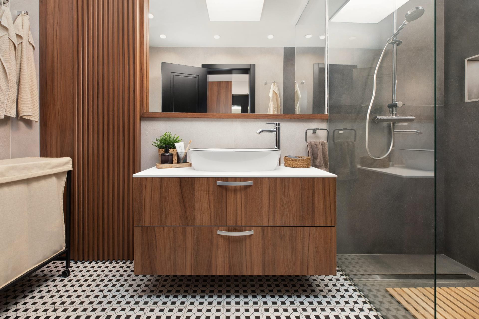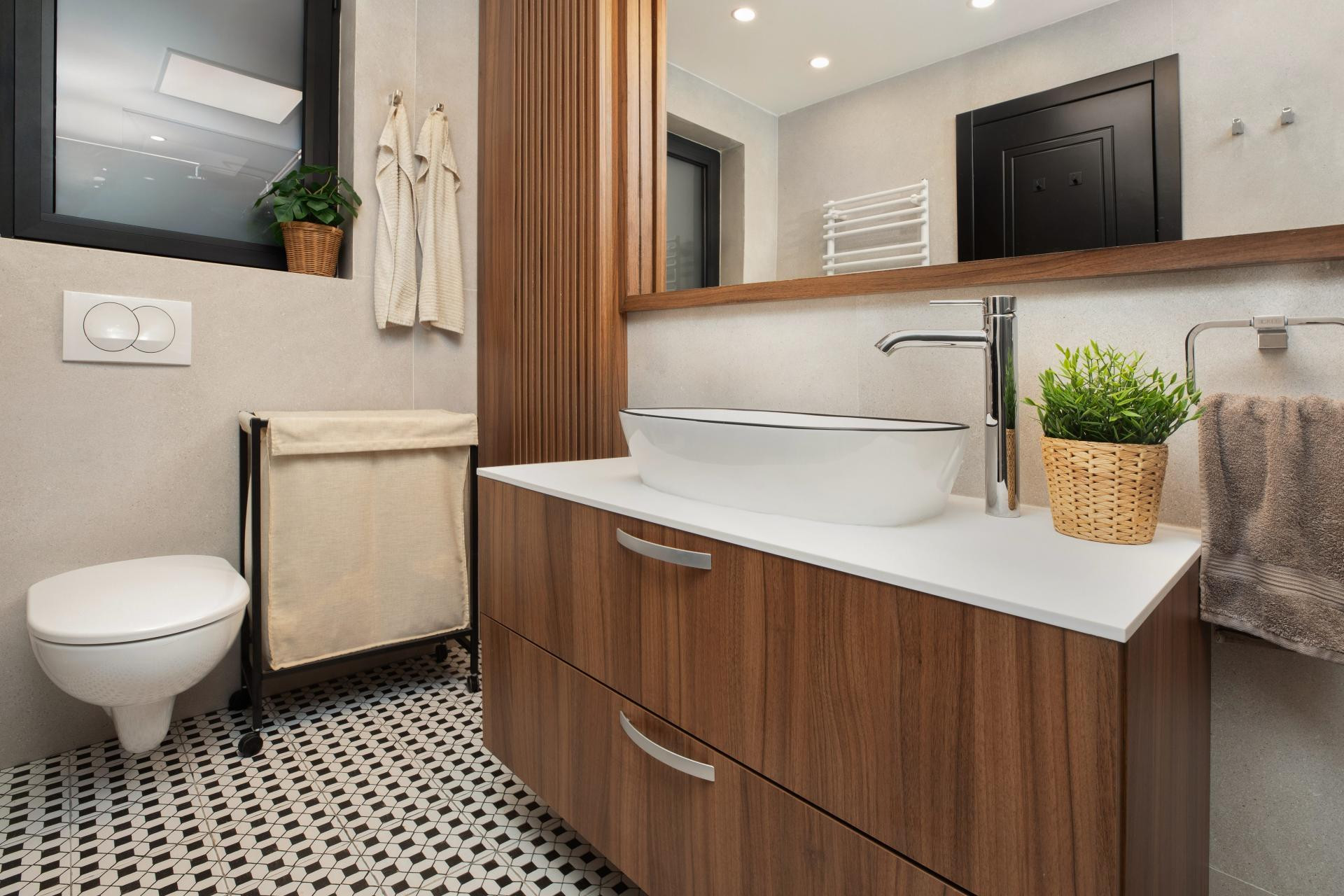 "Nije riječ o klasičnom obliku kuhinje, ali uz dobru ekipu sve je bilo izvedivo", kaže Šišul. Poseban detalj u kupaonici je pak skrivena perilica za rublje, vješto uklopljena iza zida s letvicama.