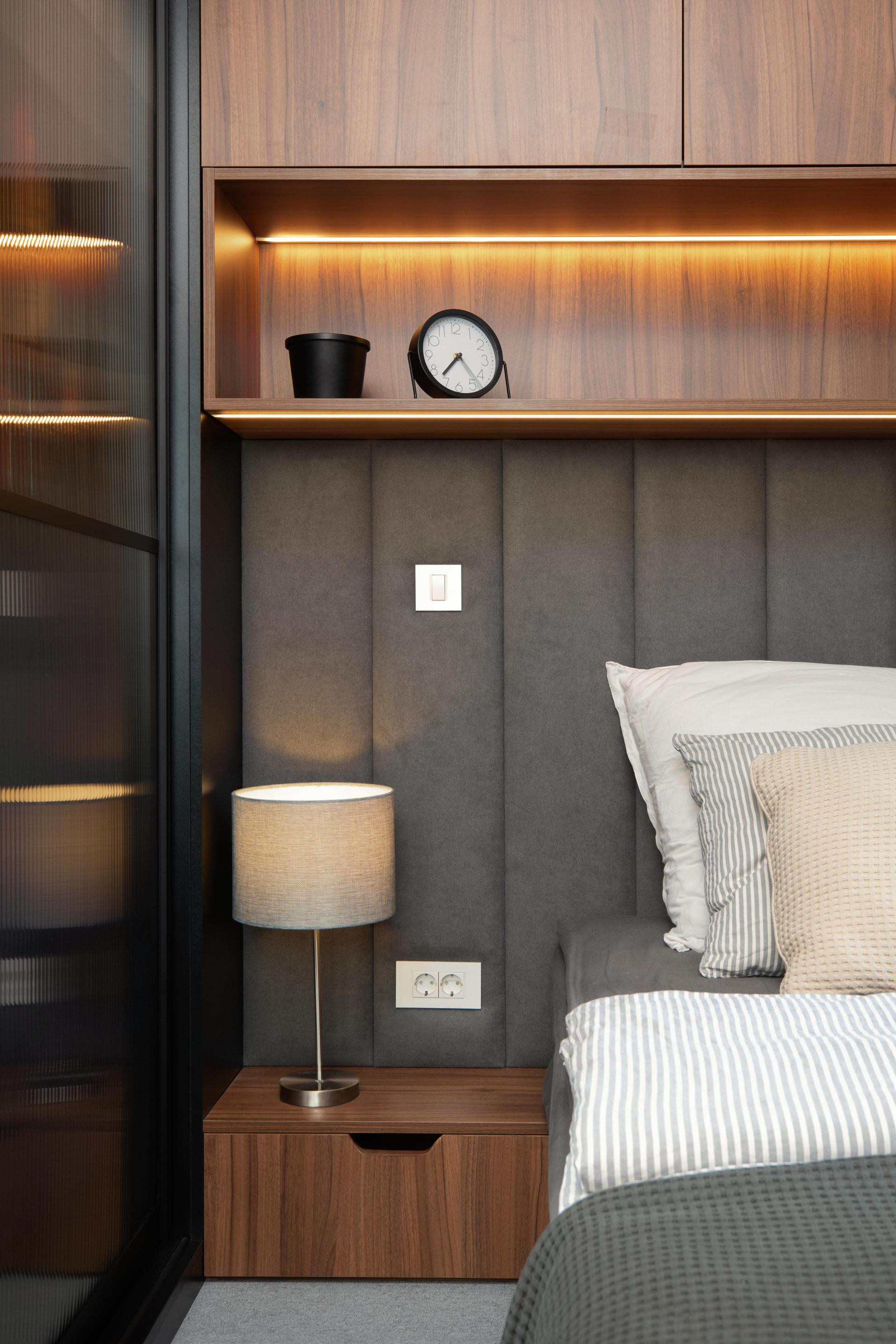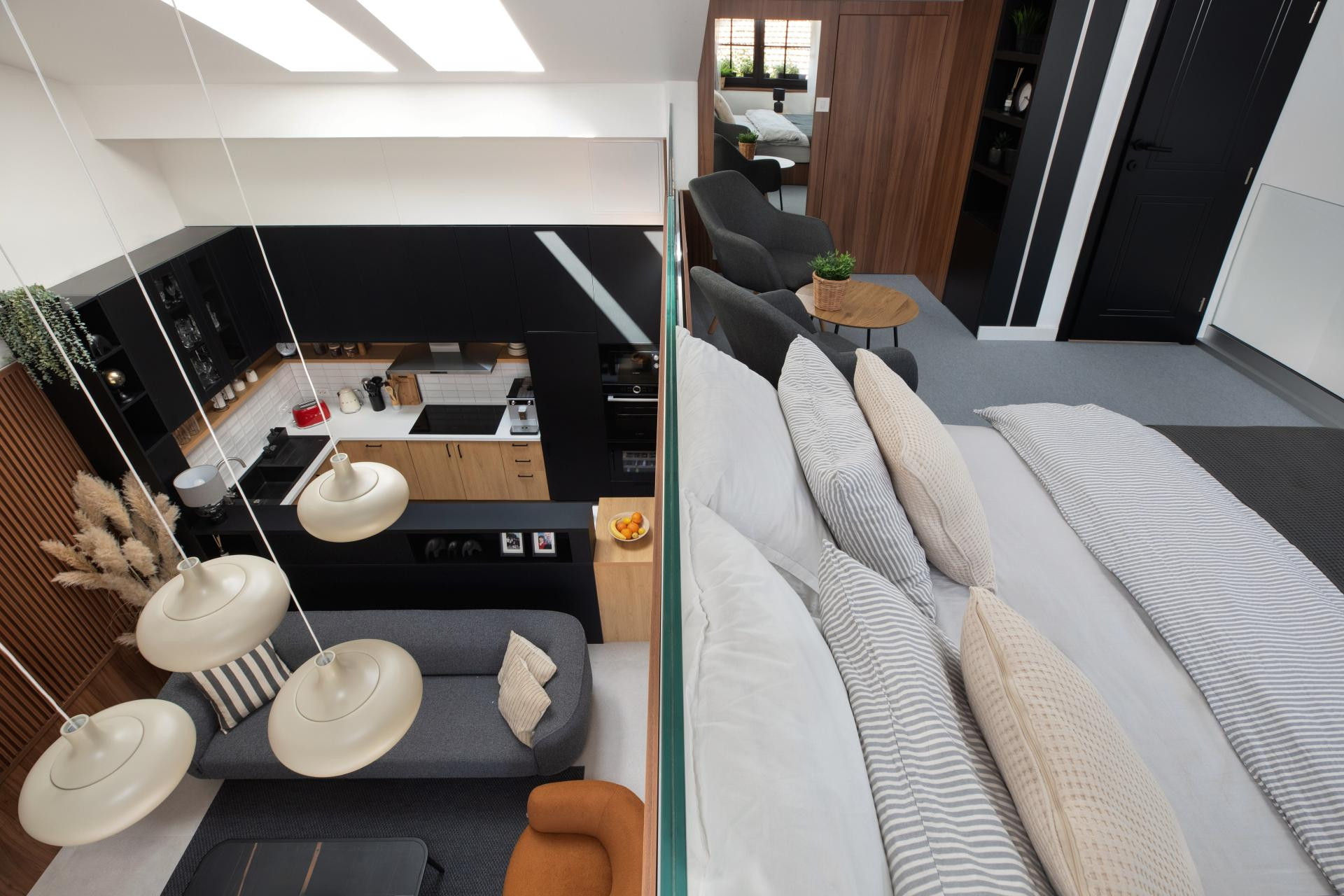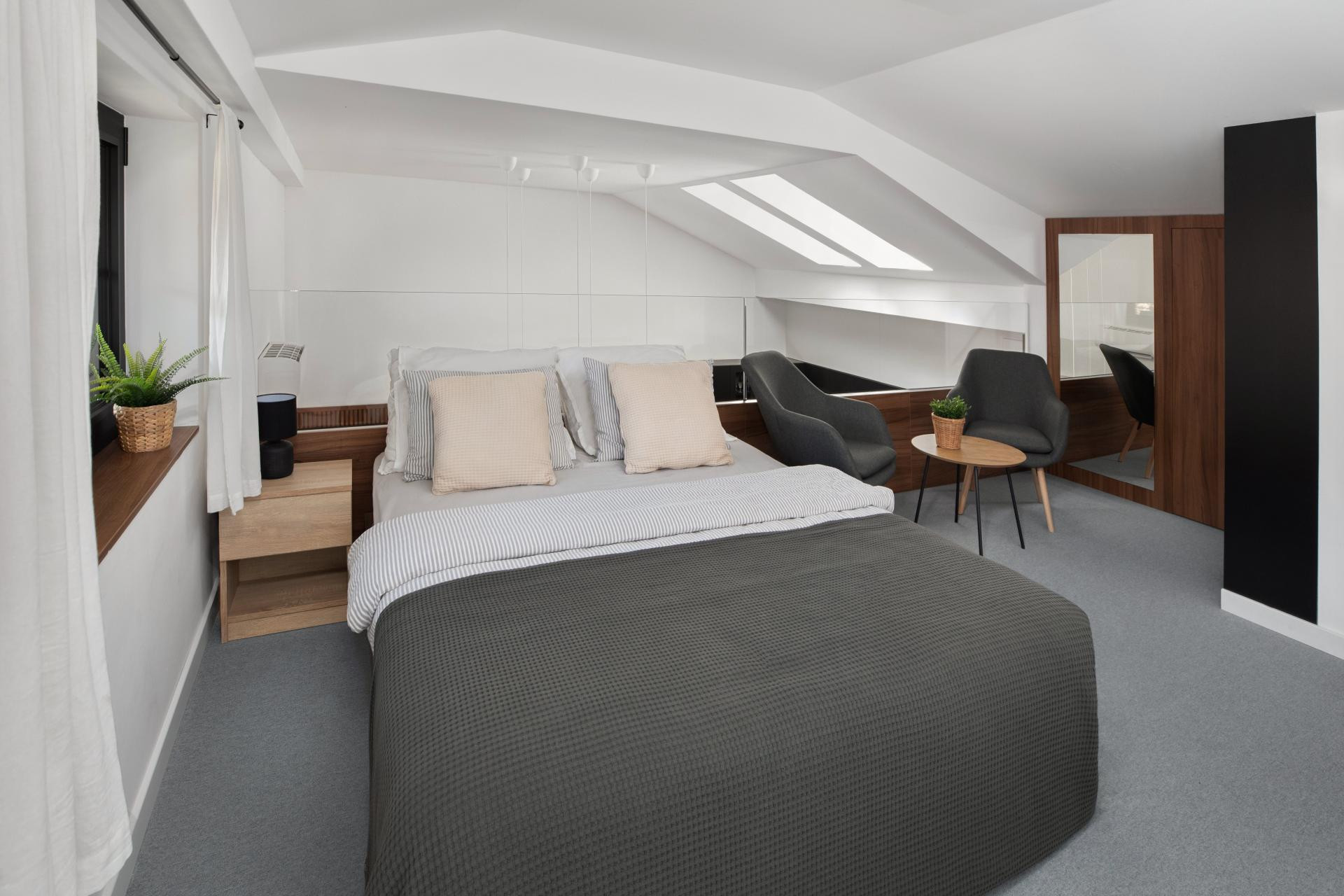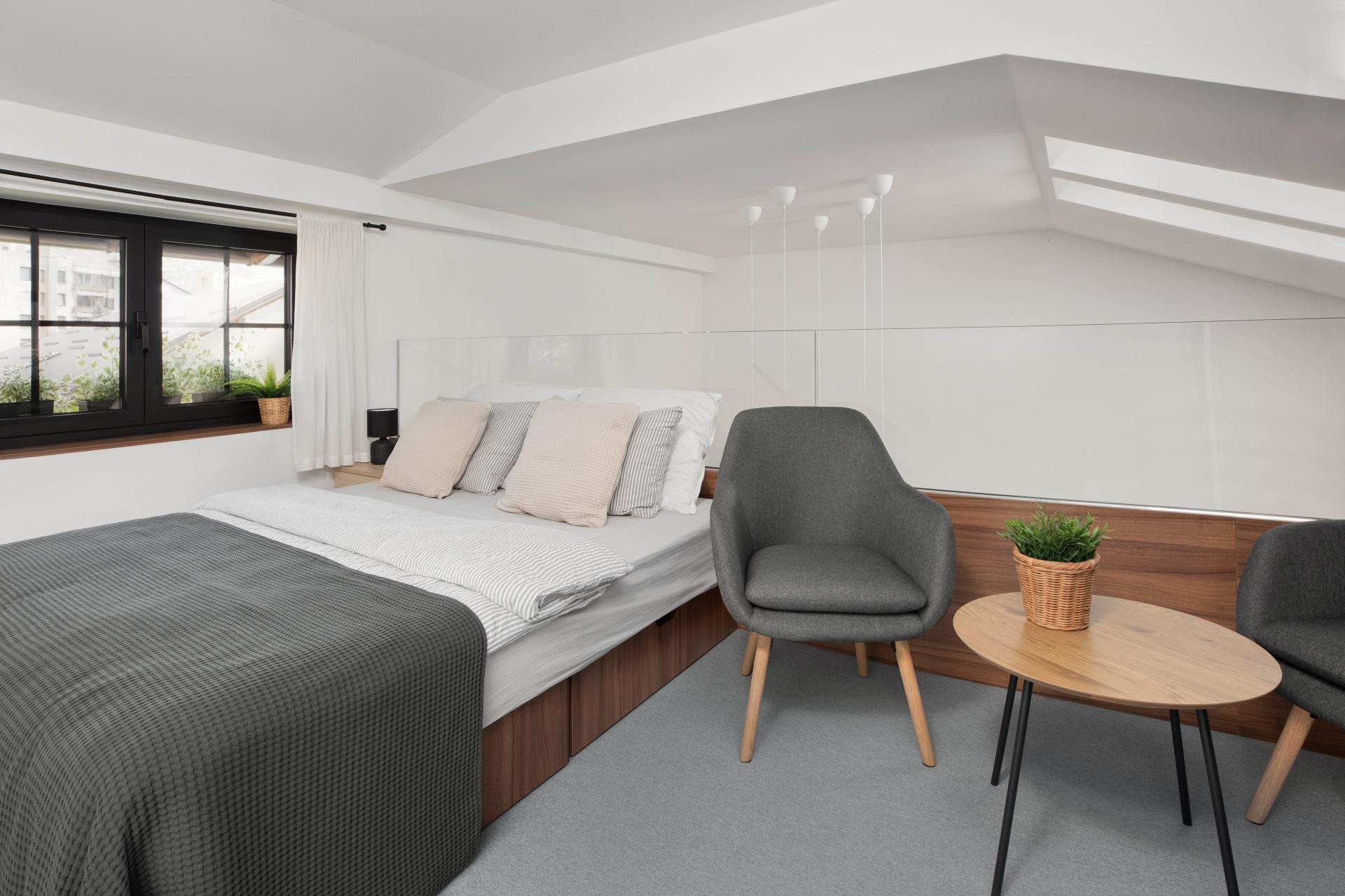 Spavaći prostori maksimalno su iskorišteni. U glavnoj sobi cijeli zid zauzima ugradbeni ormar, a prostor ispod kreveta iskorišten je za ladice. Galerijska spavaća soba doima se prozračno zahvaljujući staklenim stijenkama, ima vlastiti toalet, a prostor pod kosinom krova pretvoren je u veliki ugradbeni ormar i spremište.
