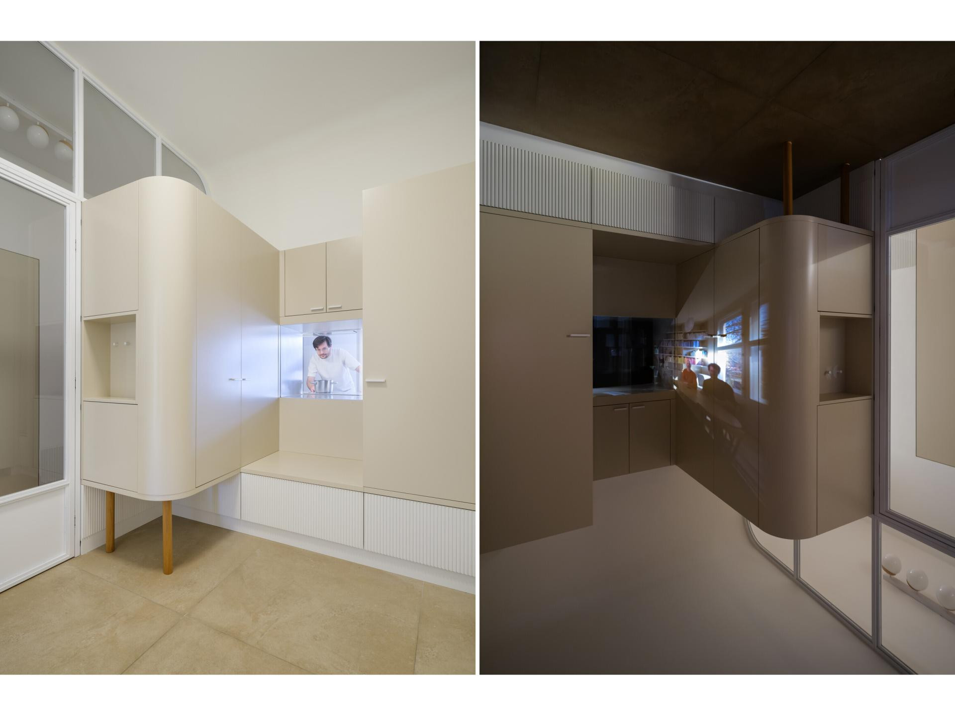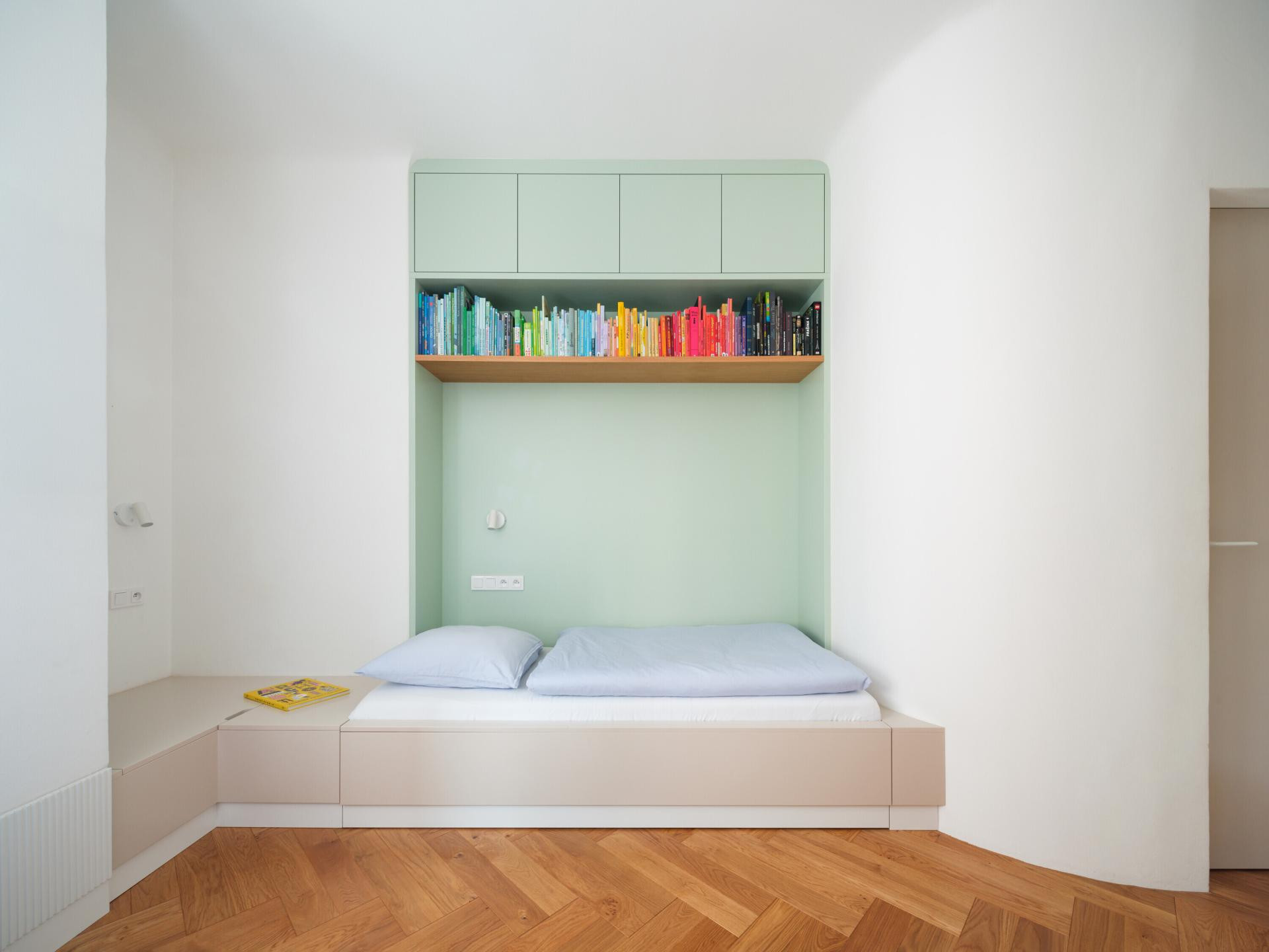 "Zbog osjećaja intimnosti i higijenskih razloga, stan smo zatim od hodnika pregradili ulaznim hodnikom, u koji smo dnevno svjetlo pustili i izravno kroz kuhinjski element i kroz velikodušnu staklenu stijenu. Dječje sobe orijentirali smo prema dvorištu, a roditeljsku spavaću sobu i radni prostor prema ulici. Kuhinjom dominira prozor prema hodniku, ali prije svega veliki okrugli stol. Dnevni boravak je podignut na podij uz prozor i smješten između polica za knjige, predstavljaući tako hibrid između boravka i knjižnice, dok u trenucima ugošćavanja prijatelja ili opuštanja pruža mogućnost širenja u veću lounge zonu", pojašnjavaju.