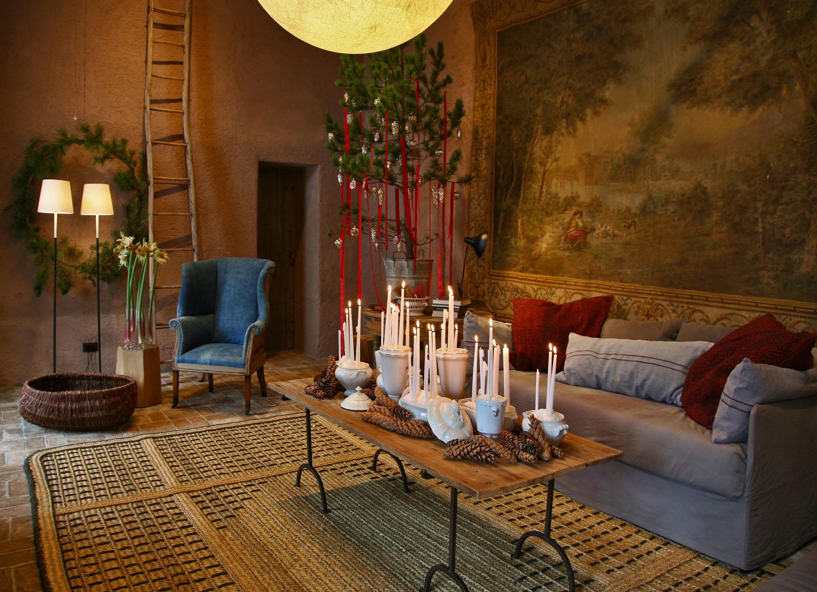 Kiteći kuću umjetnik se vodio osjećajem i duhom Božića koji mu je ostao iz djetinjstva, a to je značilo da bor mora biti velik, visok do krova! I naravno, na njemu su stare kuglice i s njega vise plišane crvene vrpce.