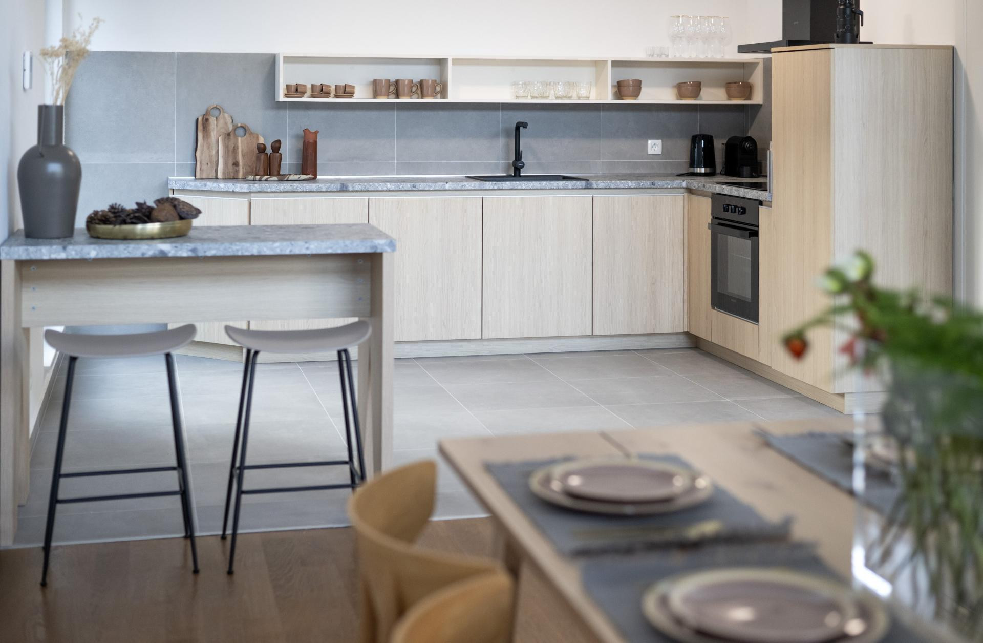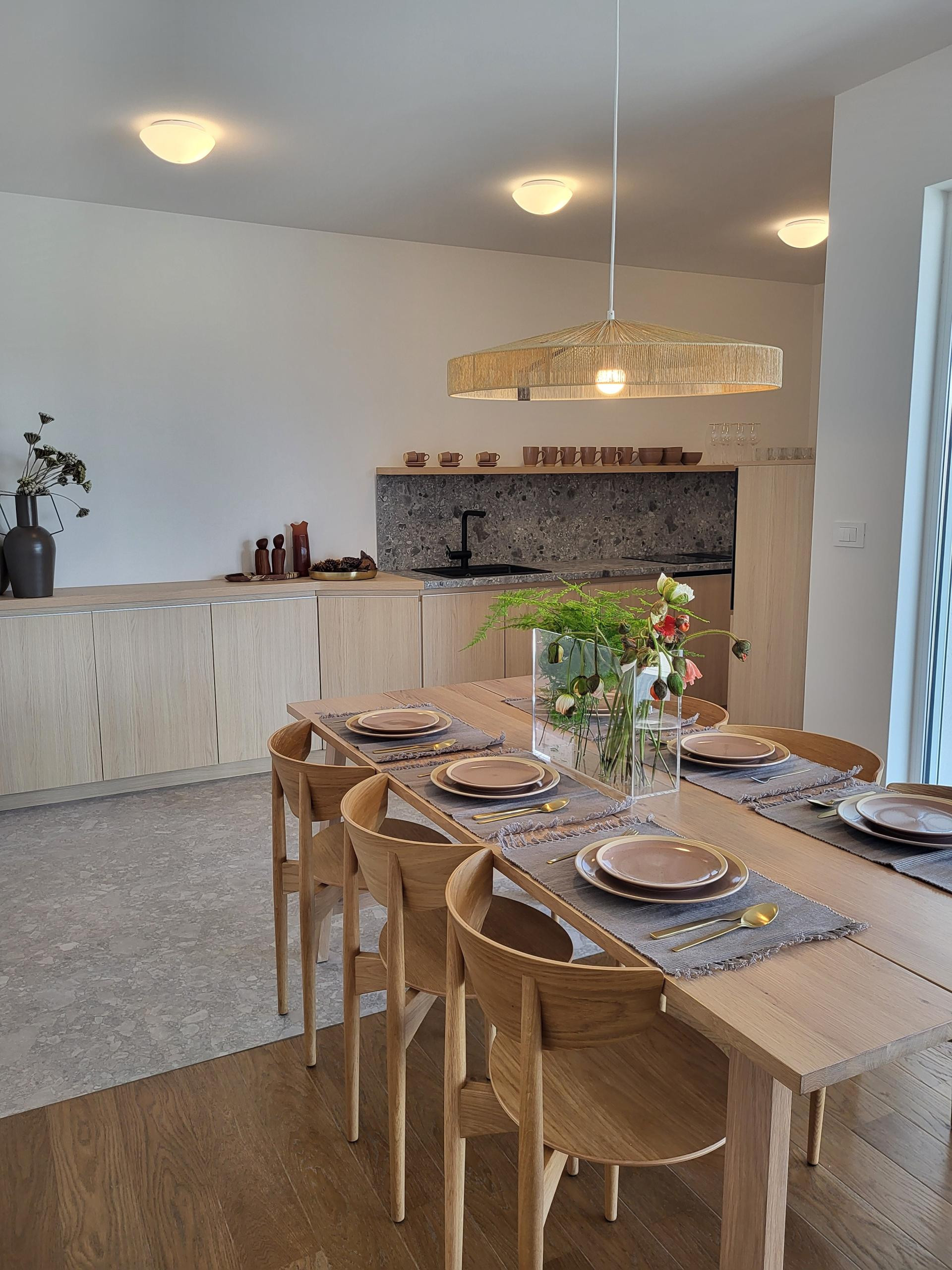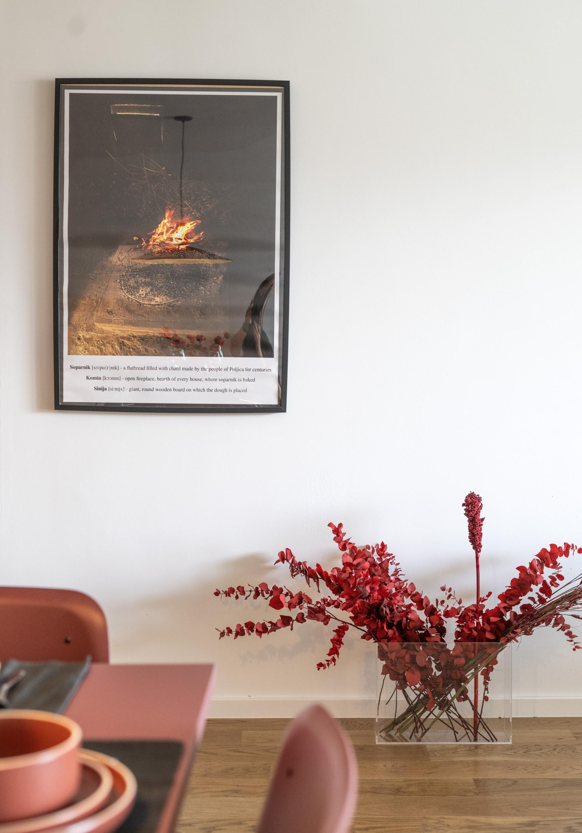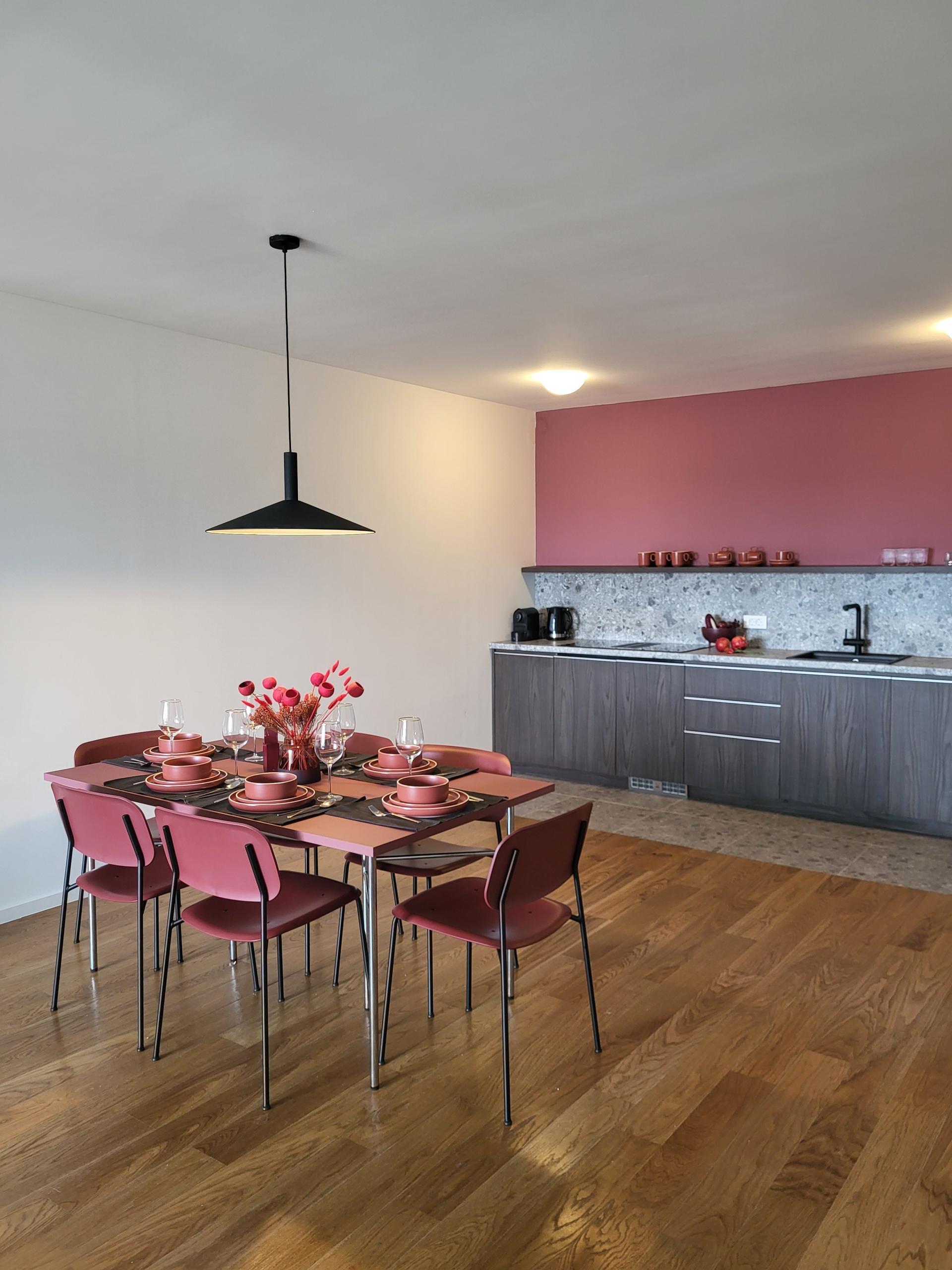 Prostor kuhinje i dnevnog boravka u svim je stanovima spojen, kao open-space, a u tematskom stanu Vatra njime dominira centralno postavljen stol okružen bordo stolcima. Dizajnerica ističe kako joj je bilo jako važno da u svakom stanu stolci budu dizajnerski, ugodni i kvalitetni.
