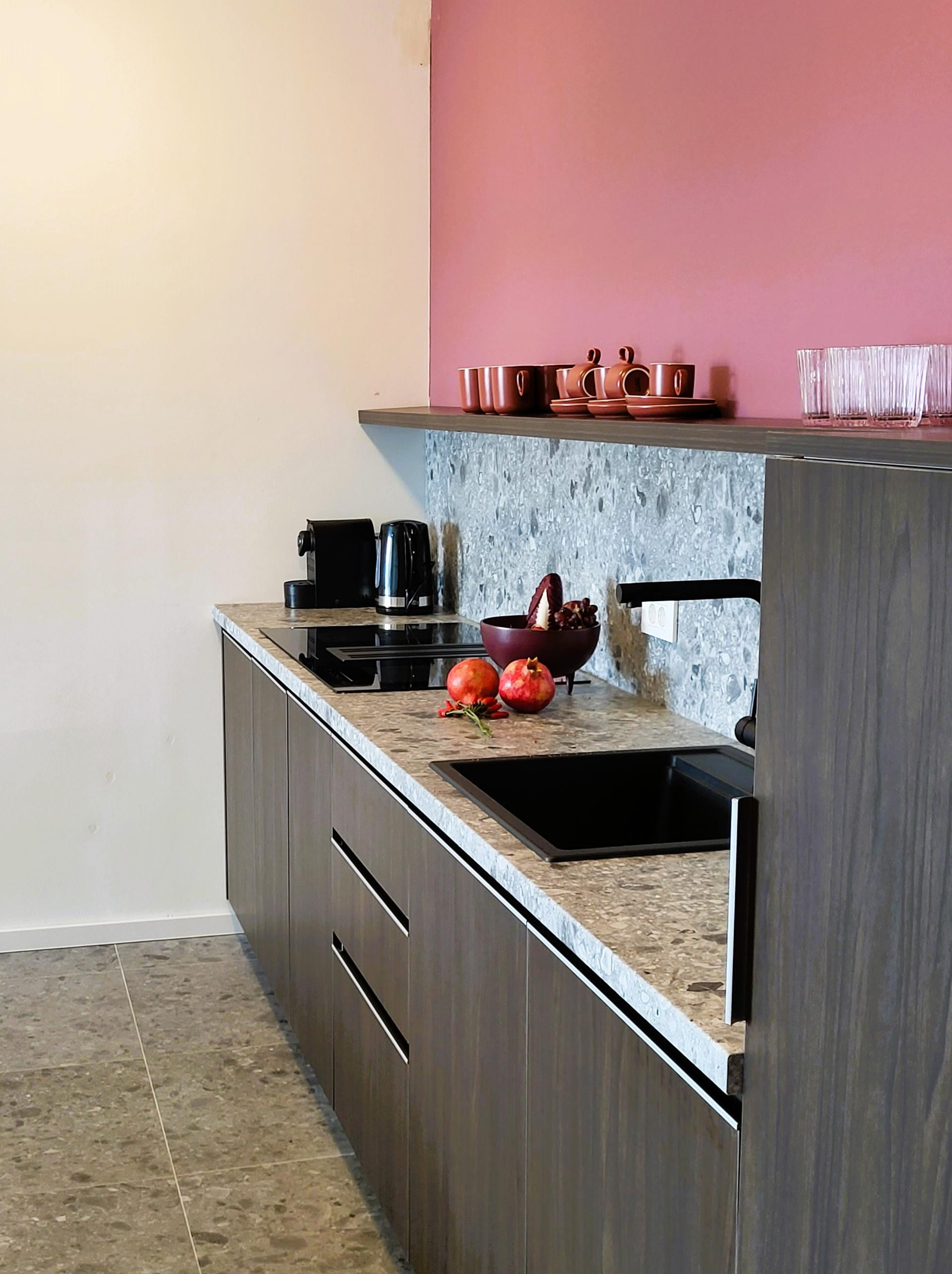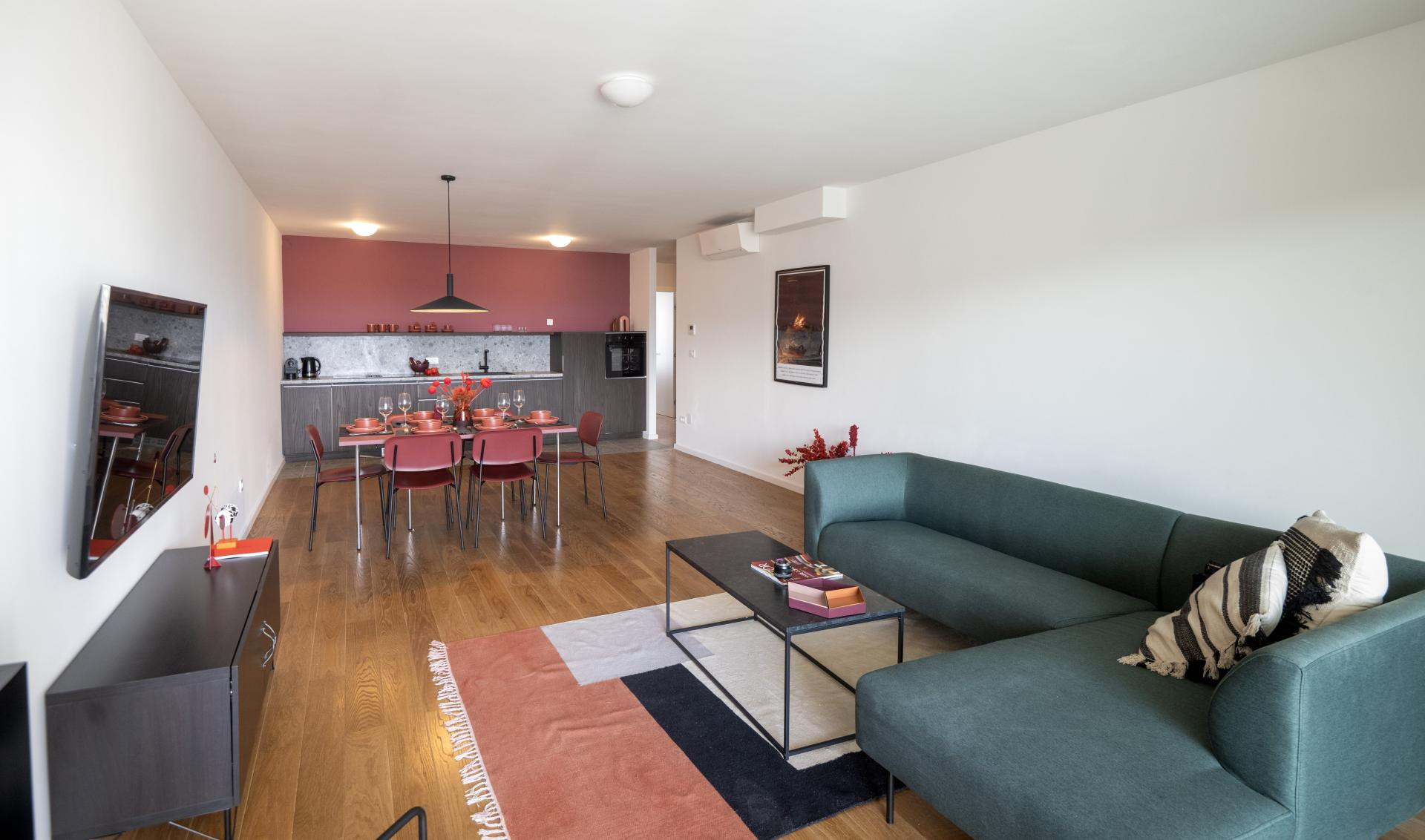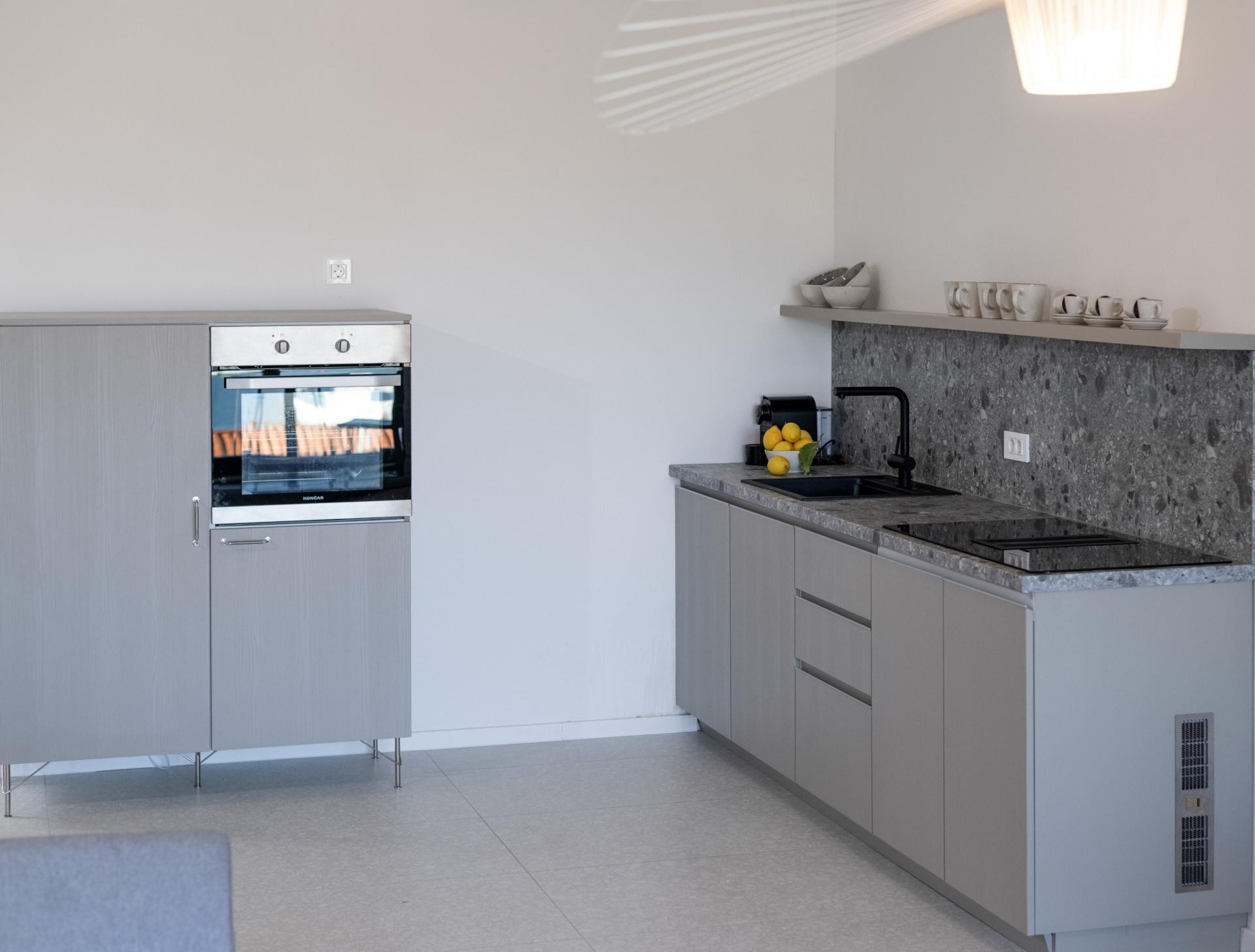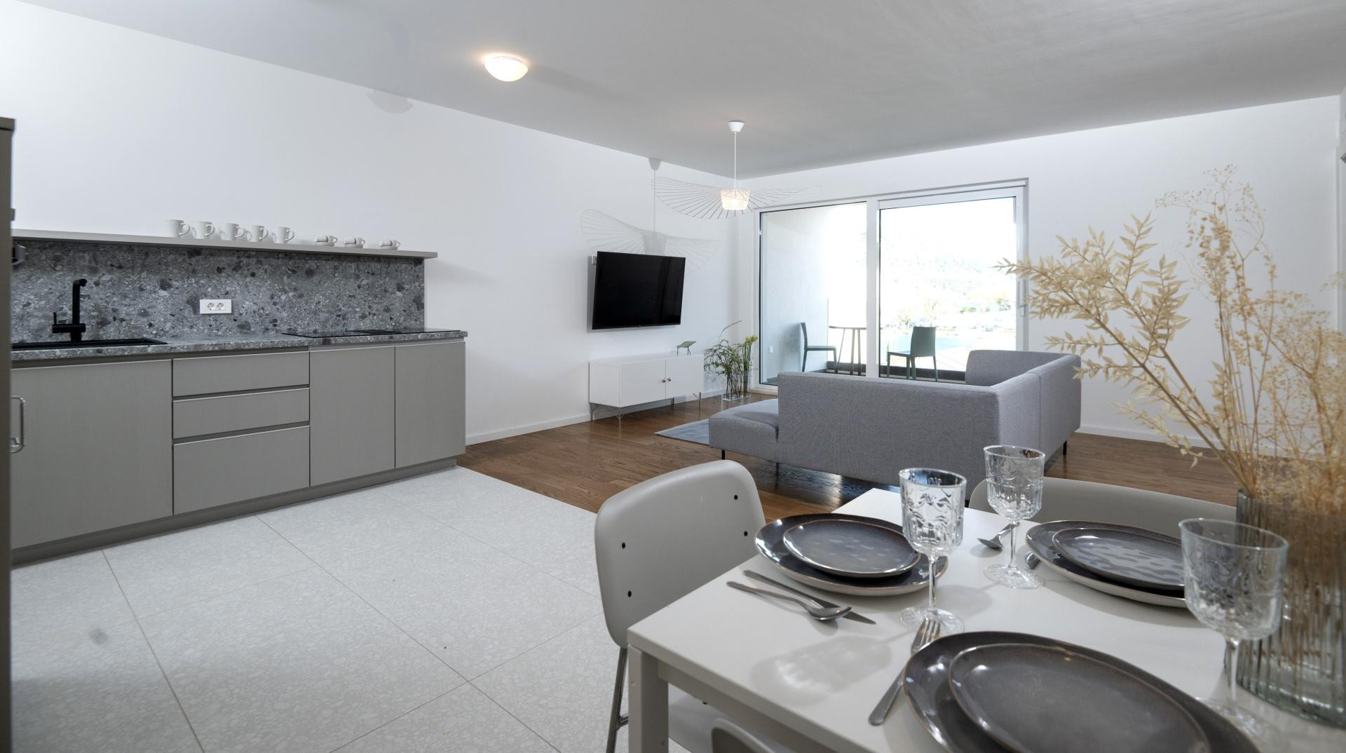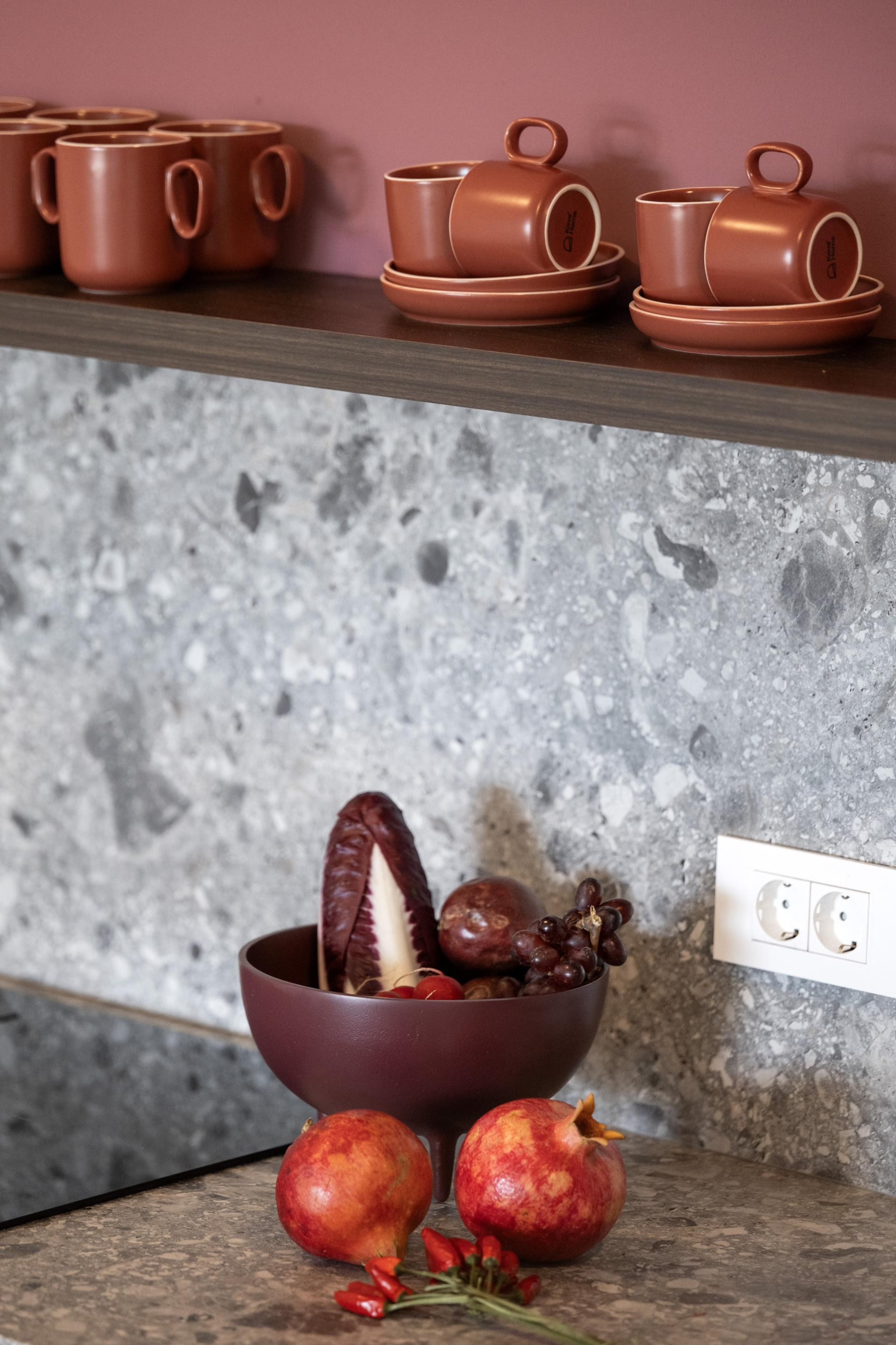 Prostor kuhinje i dnevnog boravka u svim je stanovima spojen, kao open-space, a u tematskom stanu Vatra njime dominira centralno postavljen stol okružen bordo stolcima. Dizajnerica ističe kako joj je bilo jako važno da u svakom stanu stolci budu dizajnerski, ugodni i kvalitetni.