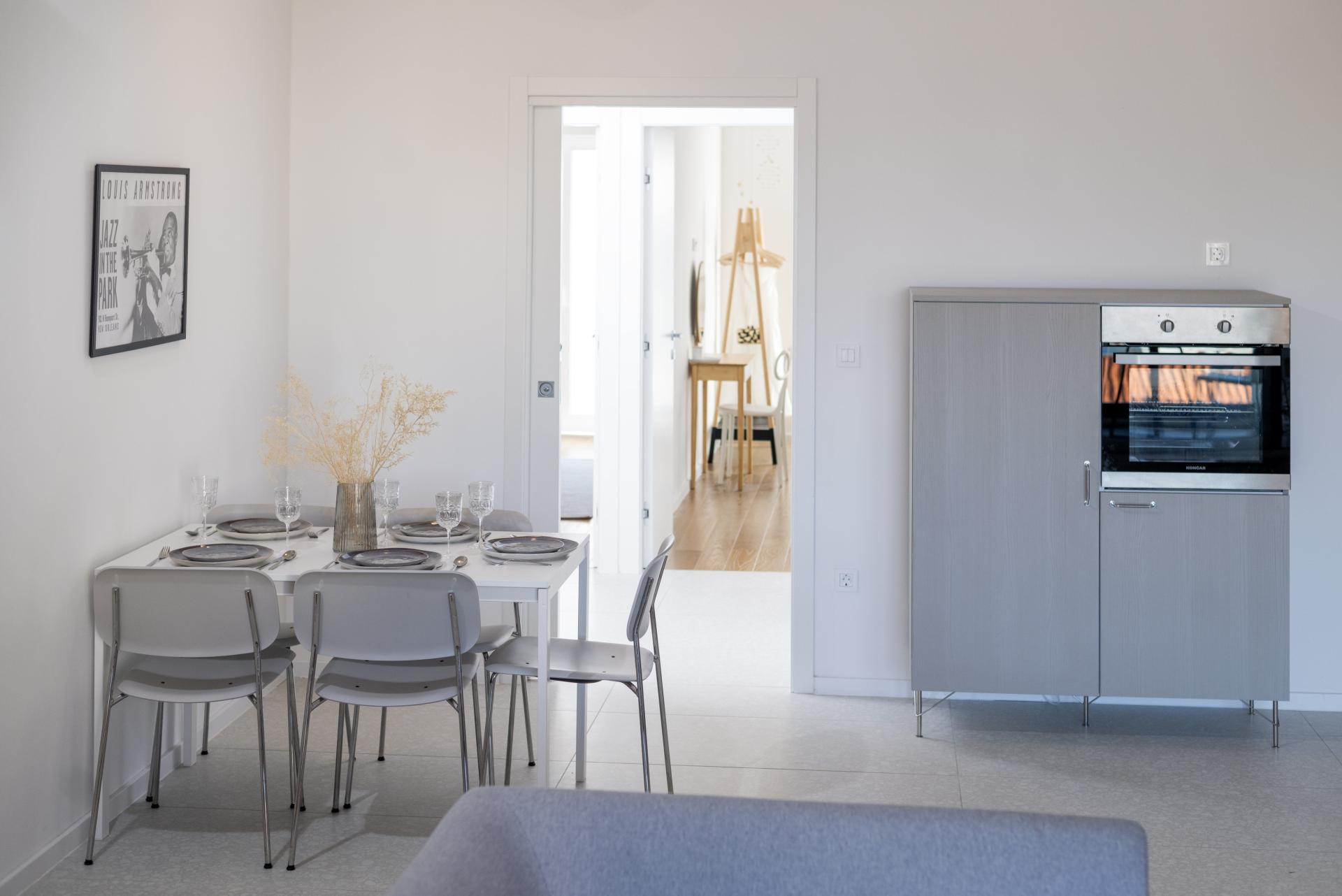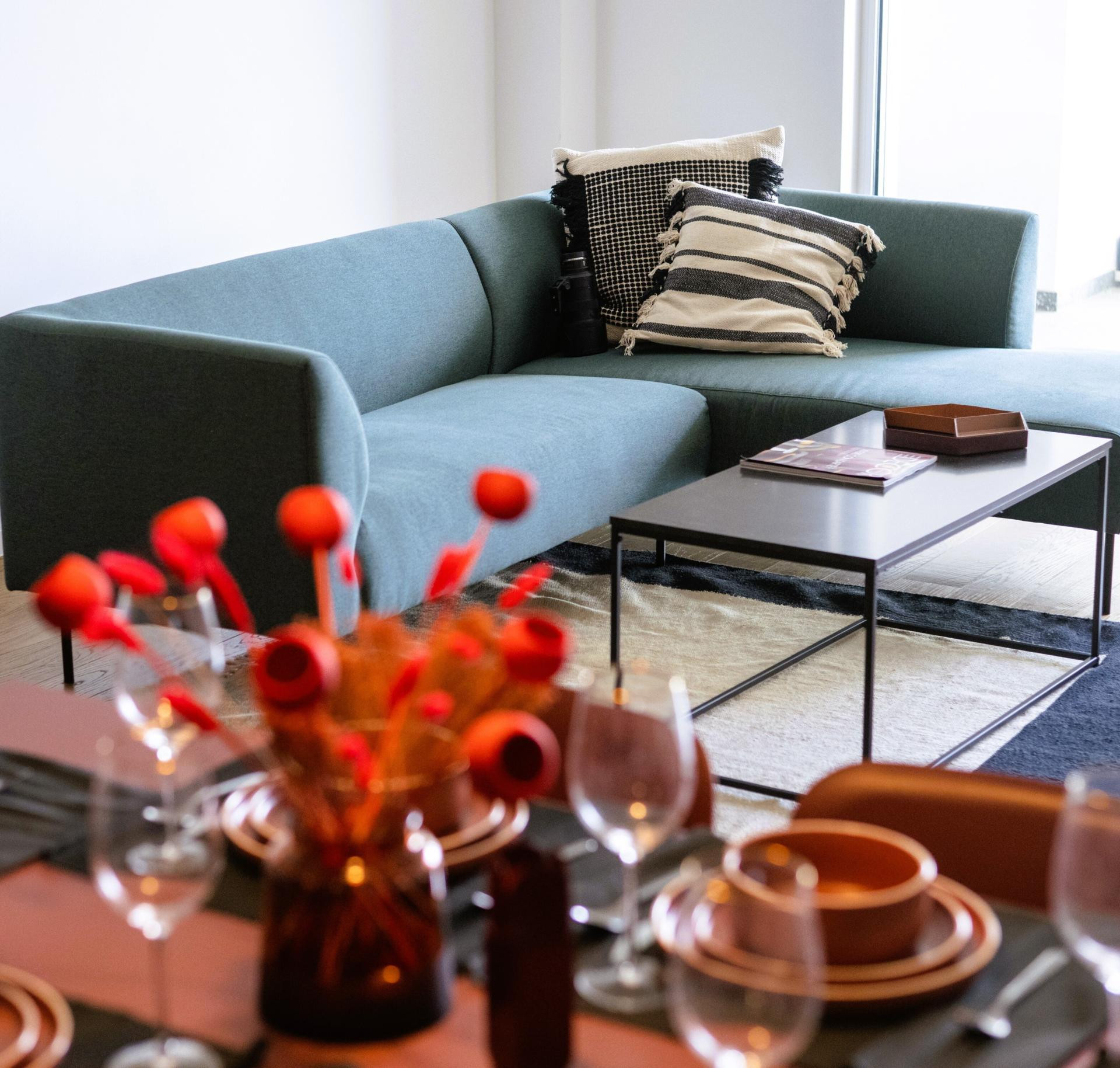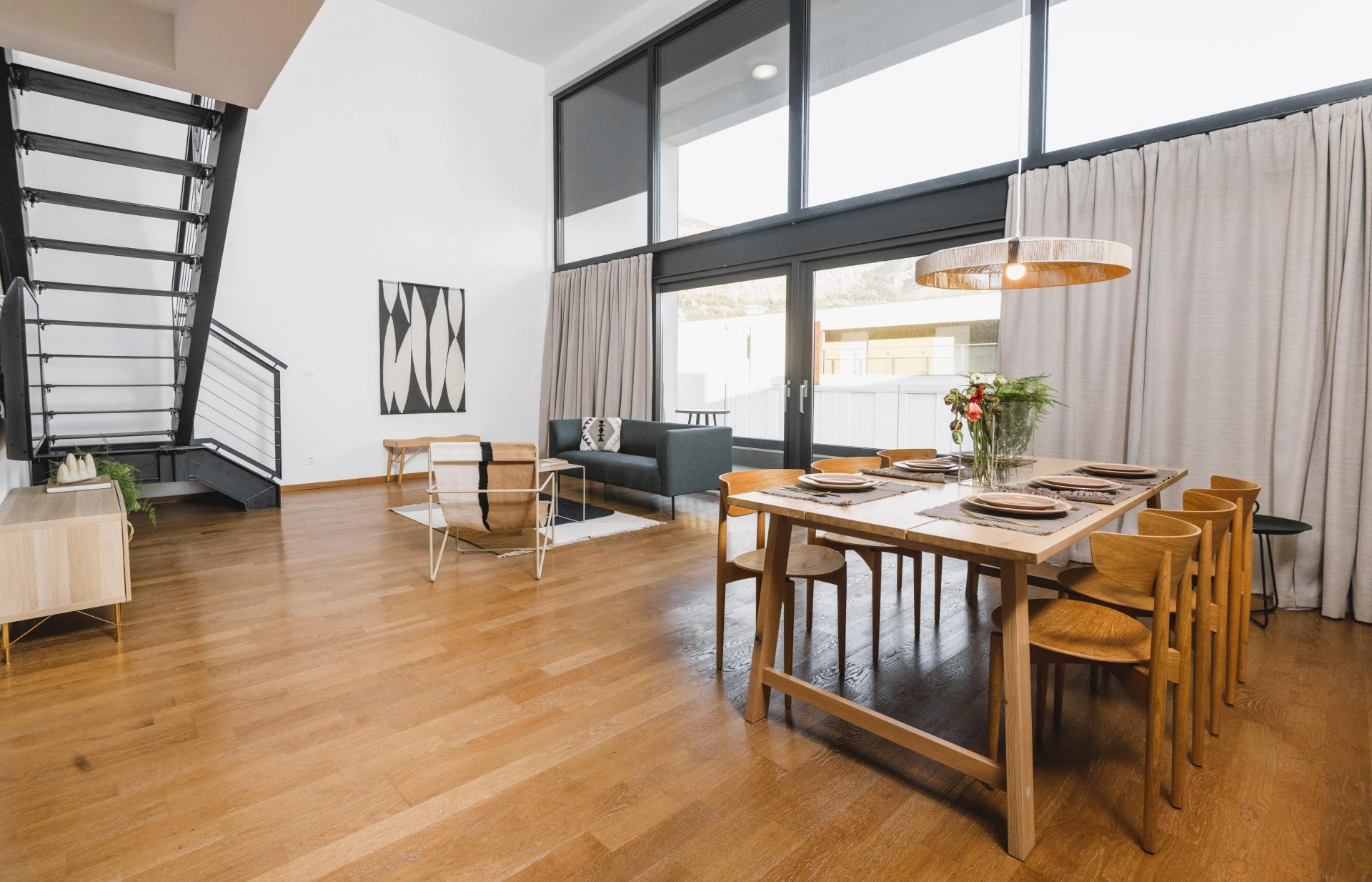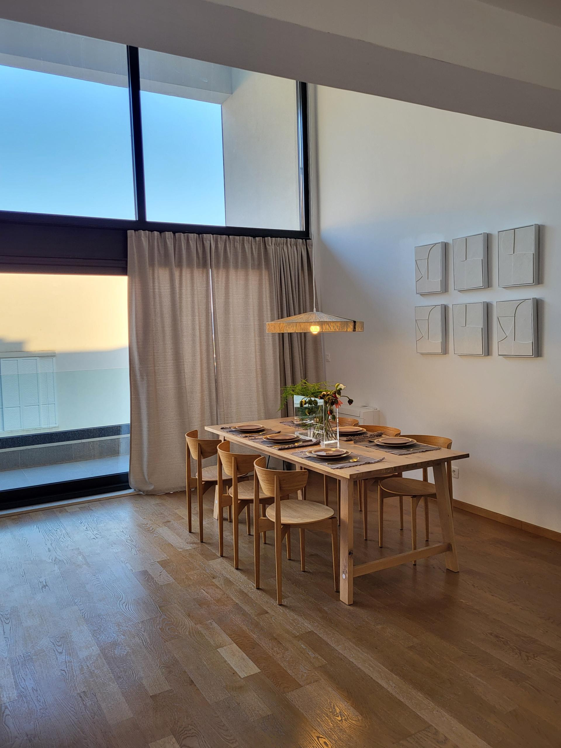 Prostor kuhinje i dnevnog boravka u svim je stanovima spojen, kao open-space, a u tematskom stanu Vatra njime dominira centralno postavljen stol okružen bordo stolcima. Dizajnerica ističe kako joj je bilo jako važno da u svakom stanu stolci budu dizajnerski, ugodni i kvalitetni.