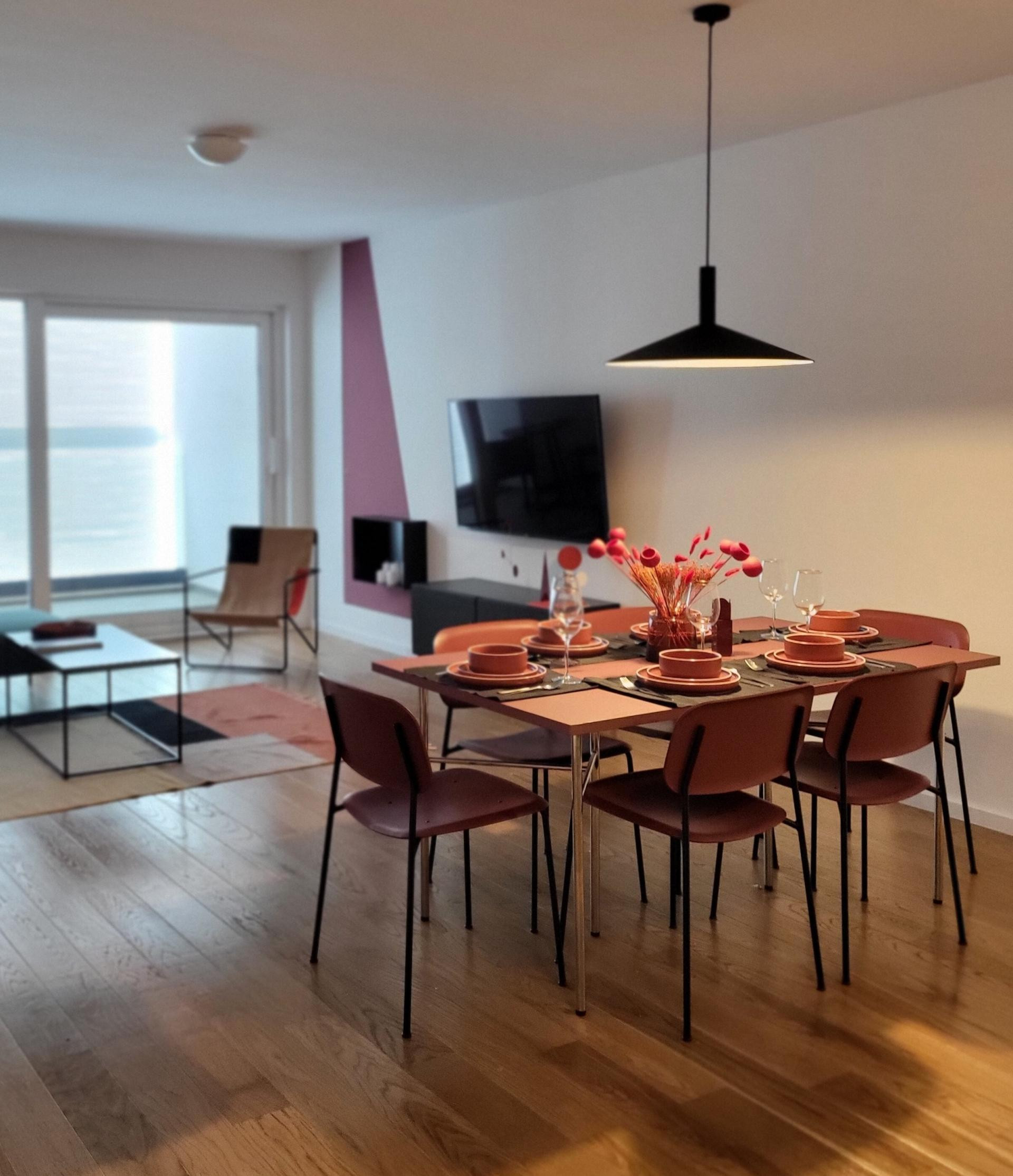 - Kada dizajniram, to je moje osnovno pravilo. Radije ću uštedjeti na nekim drugim komadima, ali stolci moraju biti beskompromisno najviše kvalitete. Ne samo da će tako trajati godinama, što svakom investitoru mora biti bitno, nego oni direktno utječu na naše zdravlje, odnosno posturu tijela. U ovom slučaju odabrala sam stolce Soft Edge koje je danski dizajnerski dvojac Iskos - Berlin dizajnirao za Hay. To su ugodni i izdržljivi stolci. Nadalje, kako nisam uspjela naći stol u bordo boji koji bi se uklopio u budžet, izradili smo ga sami, uz pomoć tvrtke Era grupa koja nam je odrađivala stolarski dio i kuhinje u svim stanovima. Za površinu stola sam odabrala Fenix, iznimno izdržljiv, taktilan materijal otporan na otiske prstiju u čijoj sam paleti našla idealnu boju te ga spojila sa zanimljivim nogama koje sam kupila u danskoj tvrtki Ferm Living. Od istog dobavljača odabrala sam neutralan, ali funkcionalan luster koji je idealan za blagovaonice jer usmjerava svjetlo tamo gdje treba - direktno na stol. Ferm Living bio je i moj odabir za neobičnu i pomalo ležernu fotelju, Desert lounge, koja je svojim geometrijskim uzorkom spojena s tepihom i tako dodaje dinamiku prostoru. Posebnost ove fotelje je što je sjedište u potpunosti izrađeno od PET boca, iako na dodir izgleda da se radi o tkanini. To ju ne čini samo ekološkim proizvodom, nego je i potpuno vodootporna te ju se može po potrebi iznijeti i na terasu - nabraja dizajnerica.