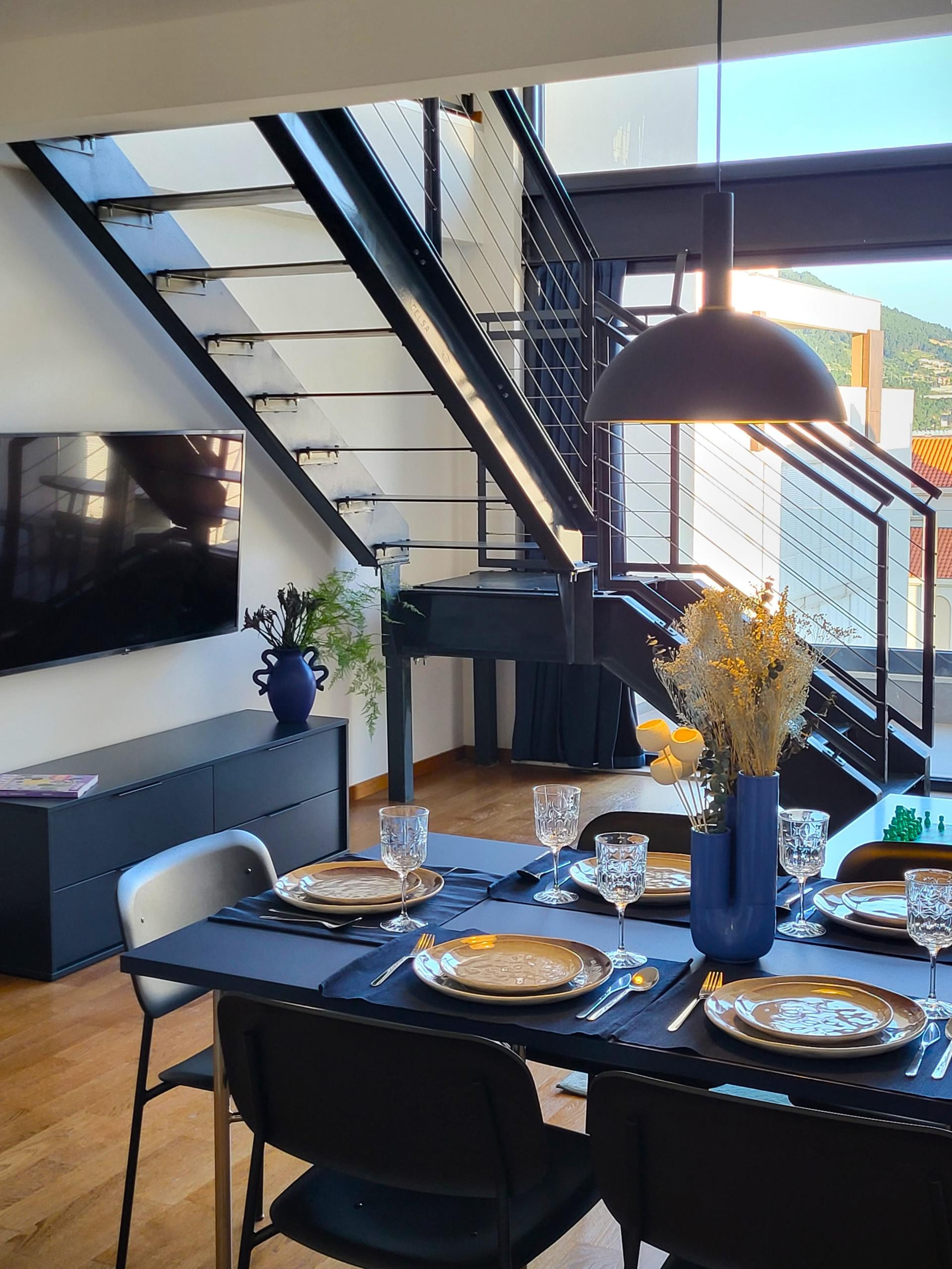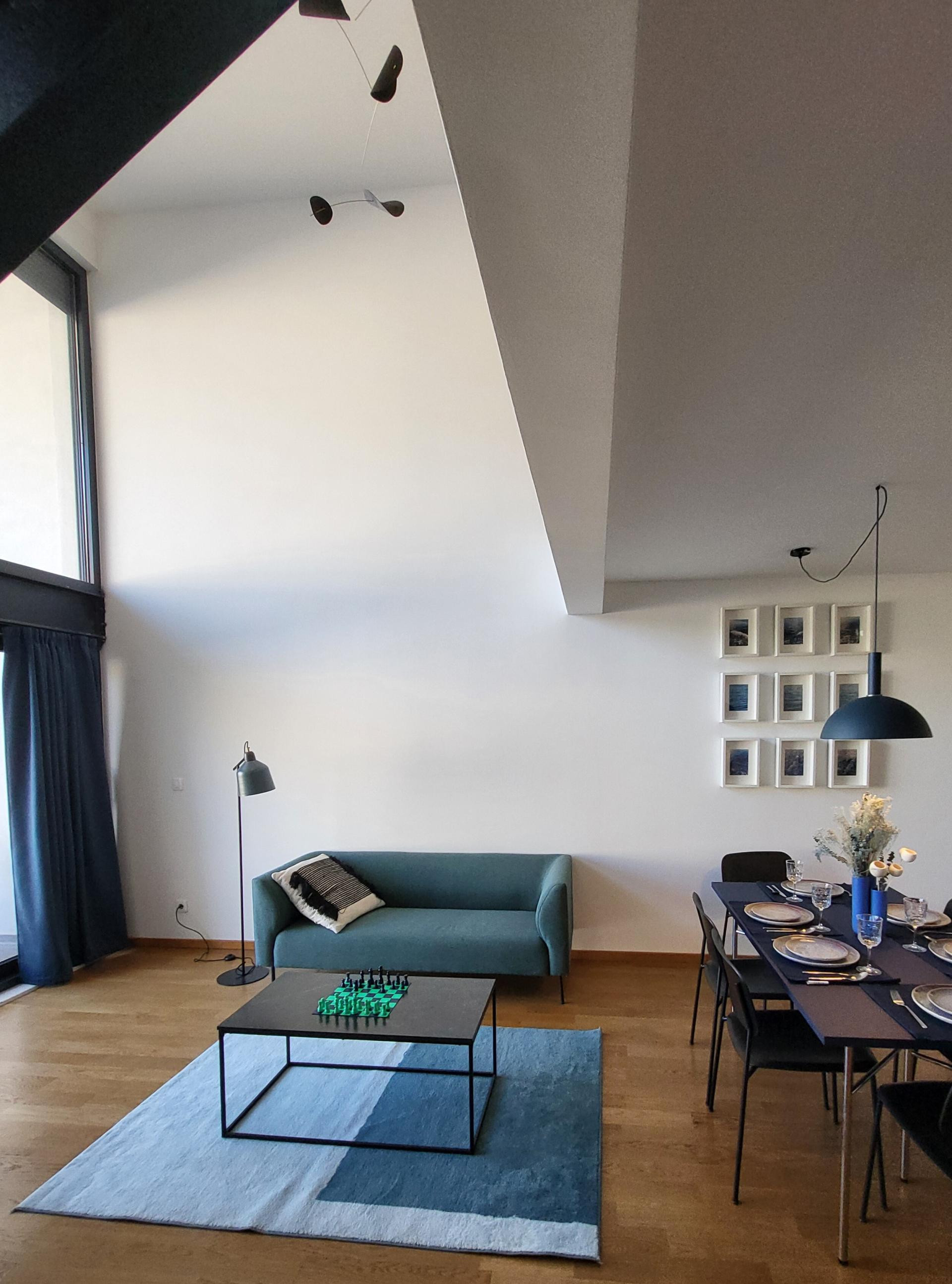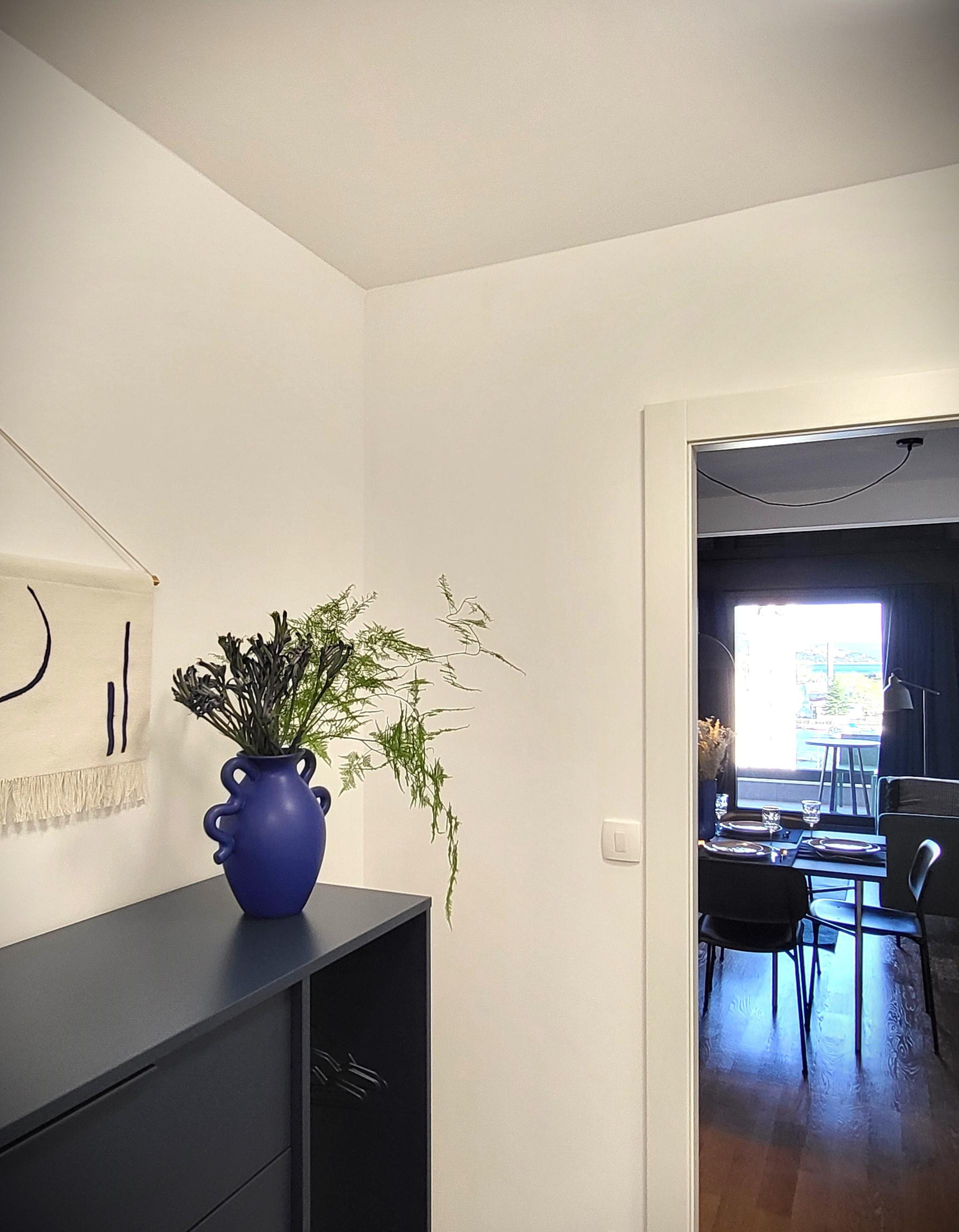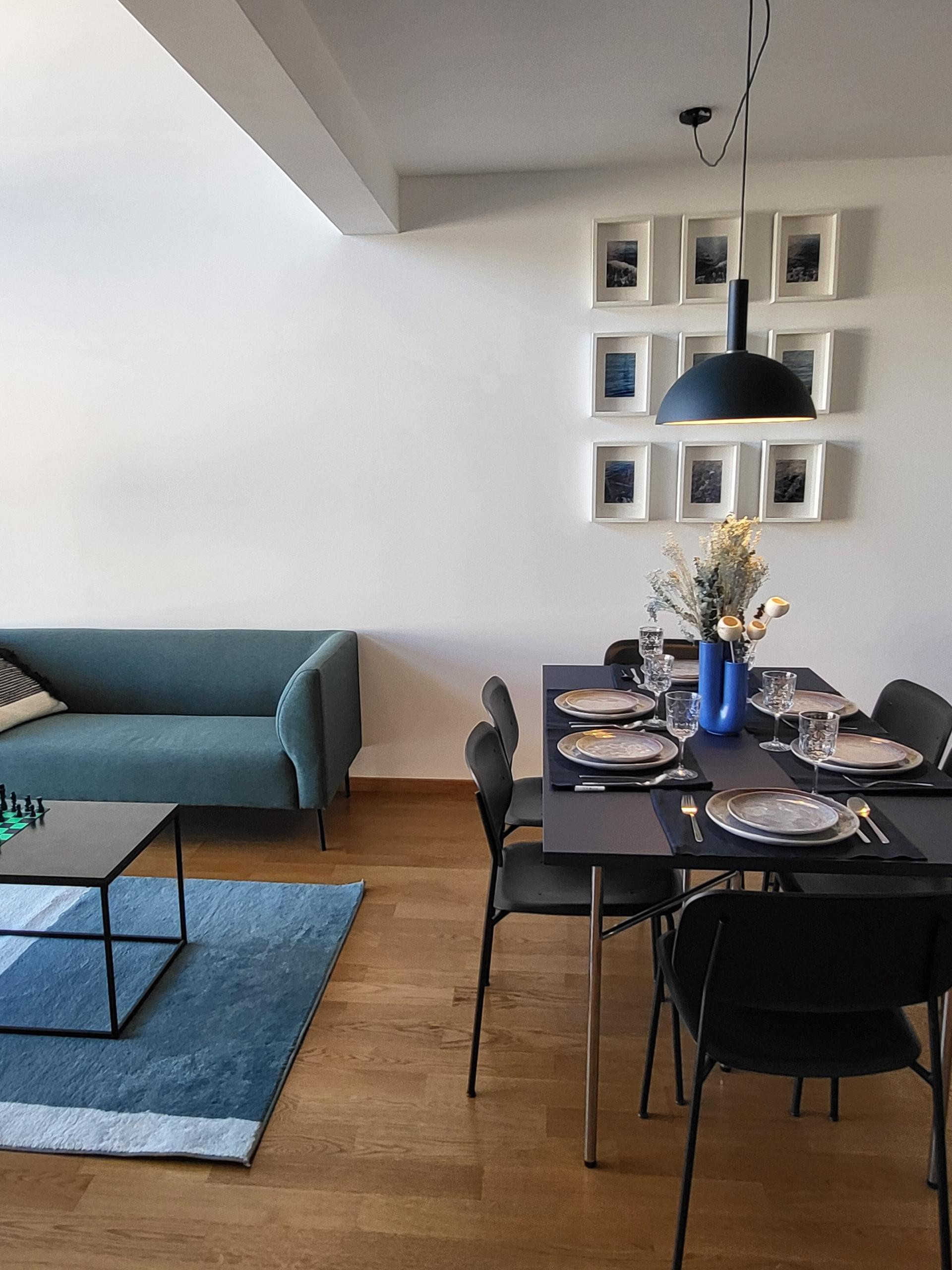 - Tu nam je ponovno pomogao Fenix, izdržljiv materijal otporan na otiske prstiju koji je u svojoj paleti imao upravo onaj ton plave koji sam željela. Površinu izrađenu od Fenixa spojila sam s dizajnerskim nogama u krom varijanti nabavljenim u danskoj tvrtki Ferm Living. Posebnost ovih nogu, osim što lijepo izgledaju, je što su postavljene trokutno, tako da osoba koja sjedi na čelu ima dovoljno mjesta za noge. Iznad stola sam postavila ponovno jednostavnu svjetiljku iz serije Collect tvrtke Ferm Living u plavoj boji jer nisam htjela da visilica odvlači pažnju oka. Tek da bude prvenstveno funkcionalna, odnosno da osvjetljava isključivo površinu stola za kojim se jede i druži. Stolci su, kao i u svim ostalim stanovima, osim teme Zemlja, Soft Edge danskog dizajnerskog dvojca Iskos - Berlin, ovaj put u crnoj.
