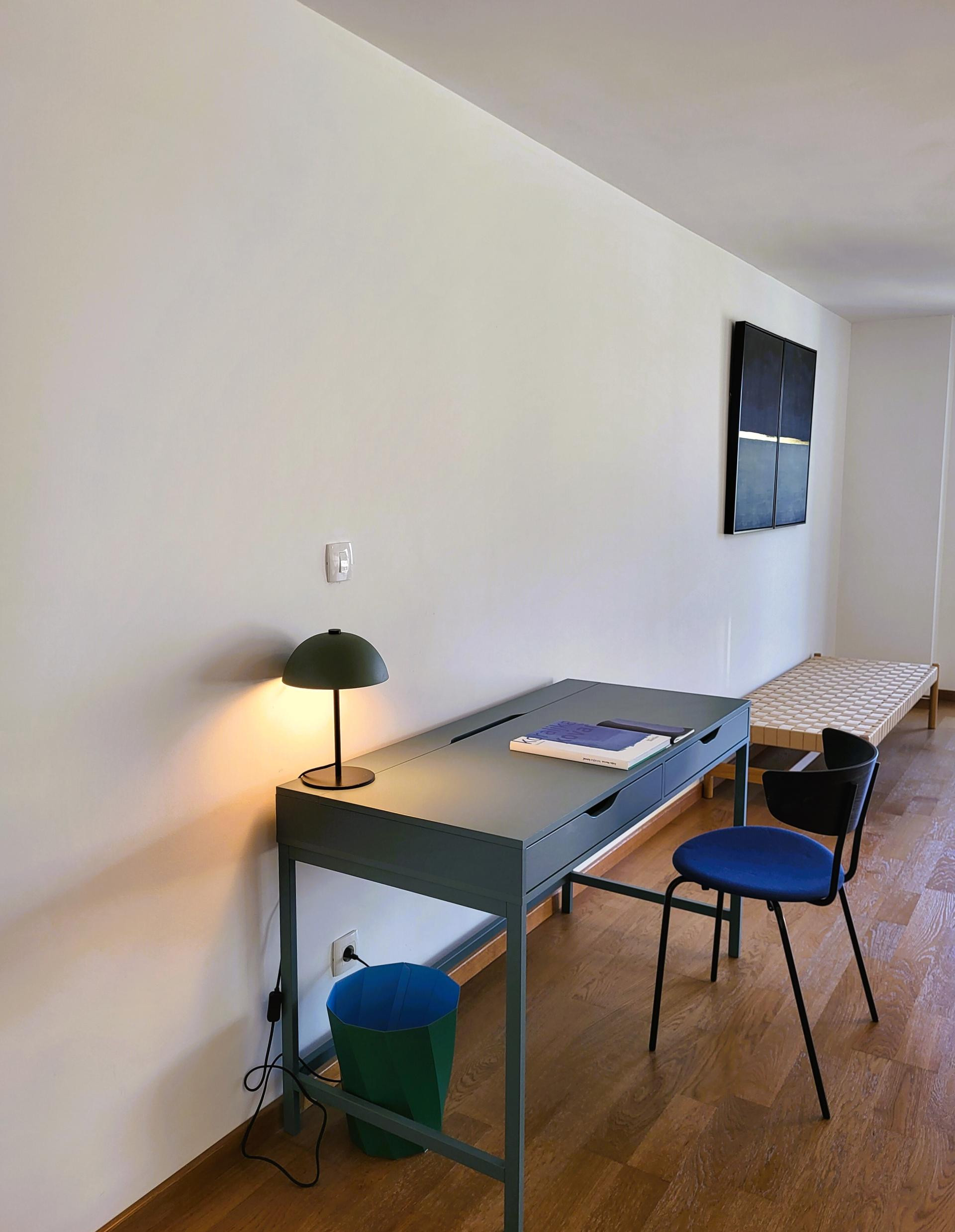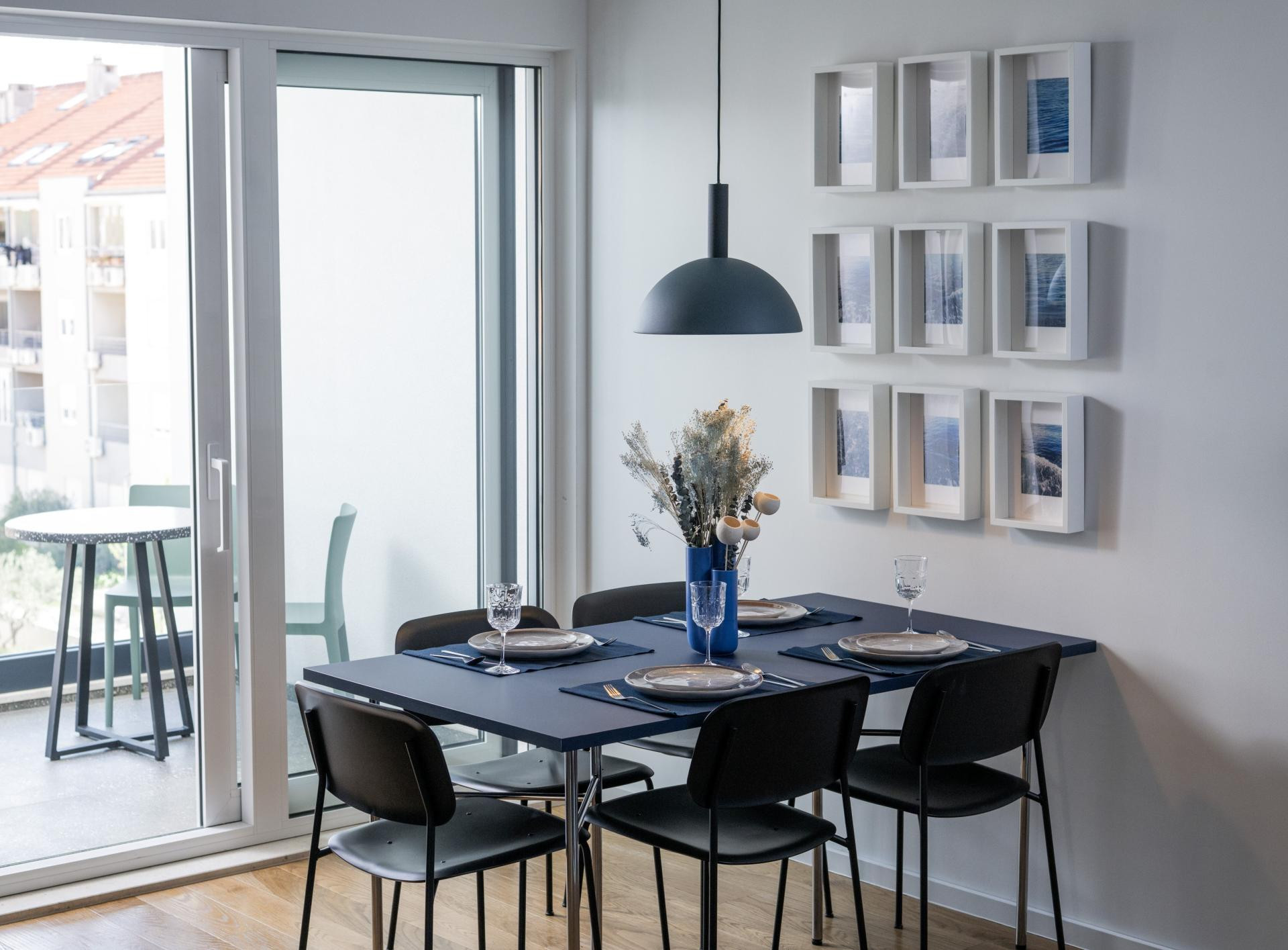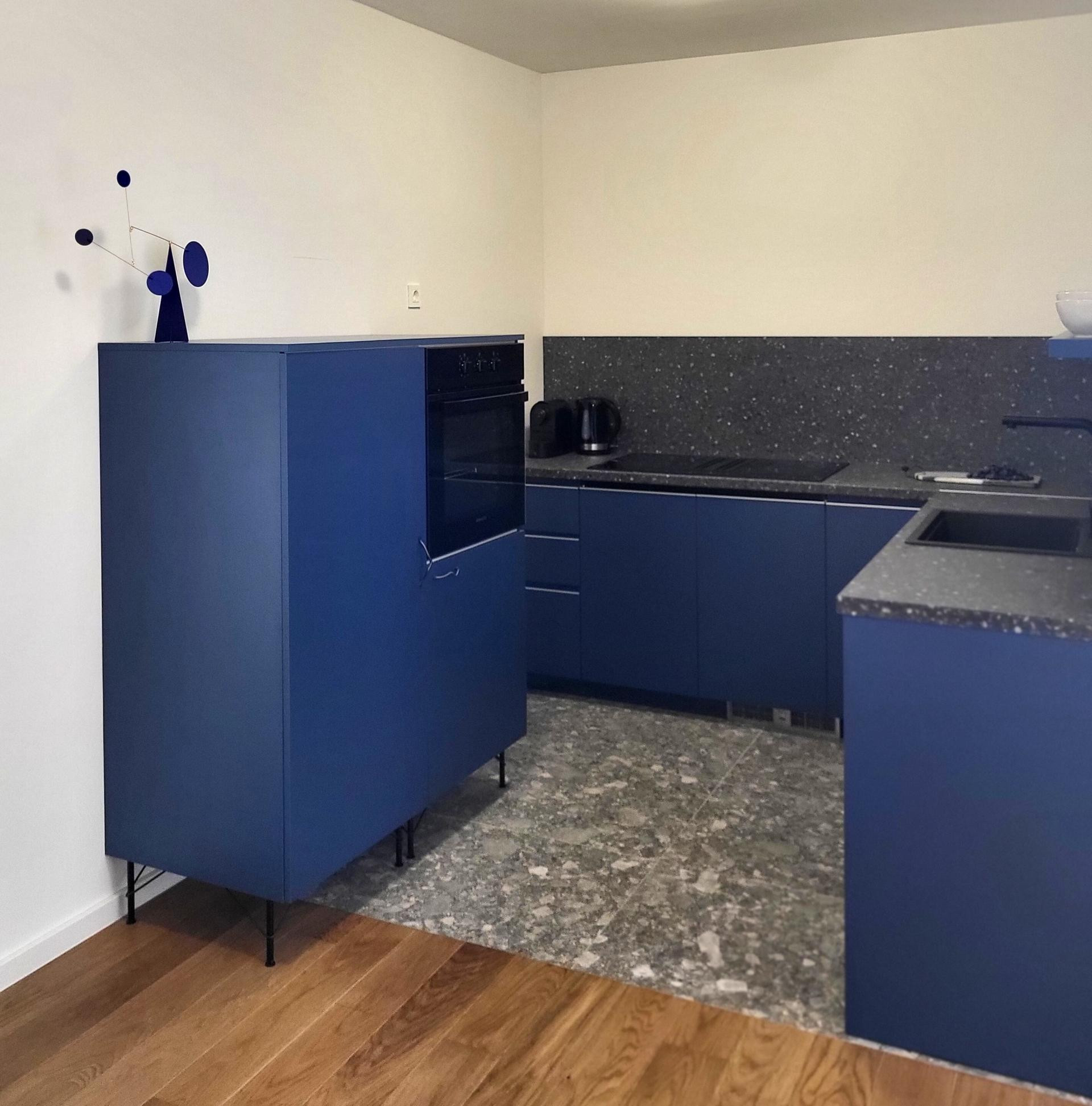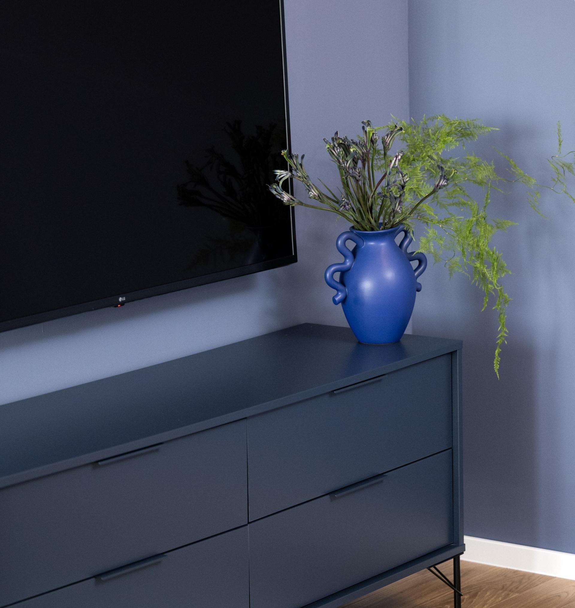 - Tu nam je ponovno pomogao Fenix, izdržljiv materijal otporan na otiske prstiju koji je u svojoj paleti imao upravo onaj ton plave koji sam željela. Površinu izrađenu od Fenixa spojila sam s dizajnerskim nogama u krom varijanti nabavljenim u danskoj tvrtki Ferm Living. Posebnost ovih nogu, osim što lijepo izgledaju, je što su postavljene trokutno, tako da osoba koja sjedi na čelu ima dovoljno mjesta za noge. Iznad stola sam postavila ponovno jednostavnu svjetiljku iz serije Collect tvrtke Ferm Living u plavoj boji jer nisam htjela da visilica odvlači pažnju oka. Tek da bude prvenstveno funkcionalna, odnosno da osvjetljava isključivo površinu stola za kojim se jede i druži. Stolci su, kao i u svim ostalim stanovima, osim teme Zemlja, Soft Edge danskog dizajnerskog dvojca Iskos - Berlin, ovaj put u crnoj.