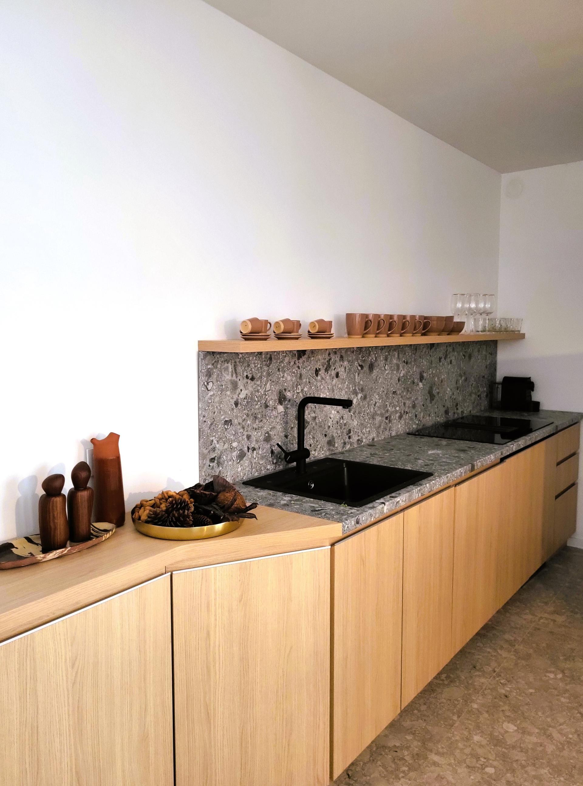 - Sama kuhinja izrađena je u dekoru drva, a njena posebnost je element za frižider, pećnicu i mikrovalnu koji stoji kao zasebni ormar u prostoru. Tako sam postigla da je kuhinja iste visine i da izgleda kontinuirano i prozračno. Isti dekor je korišten za radnu plohu i kao obloga zida.
