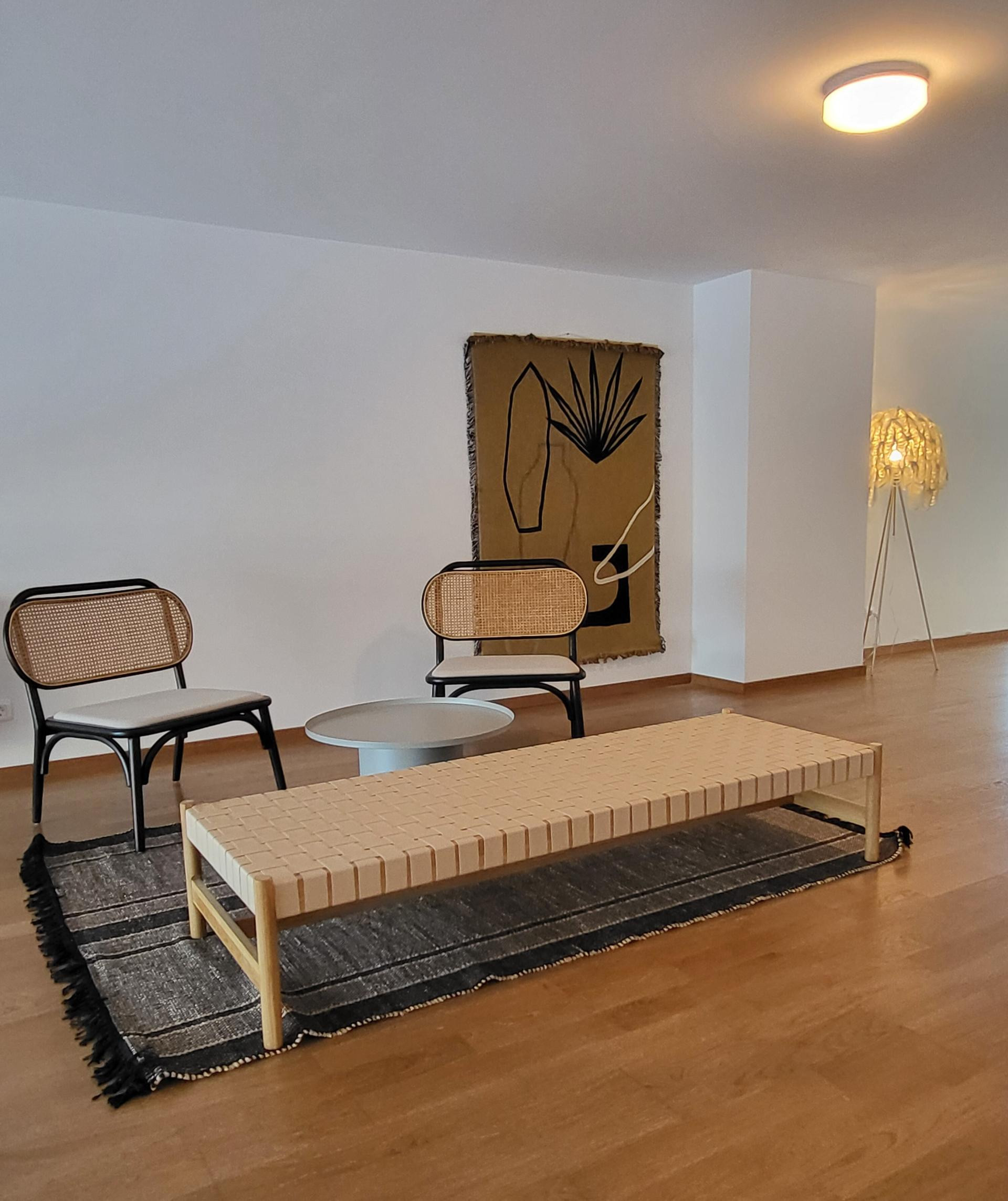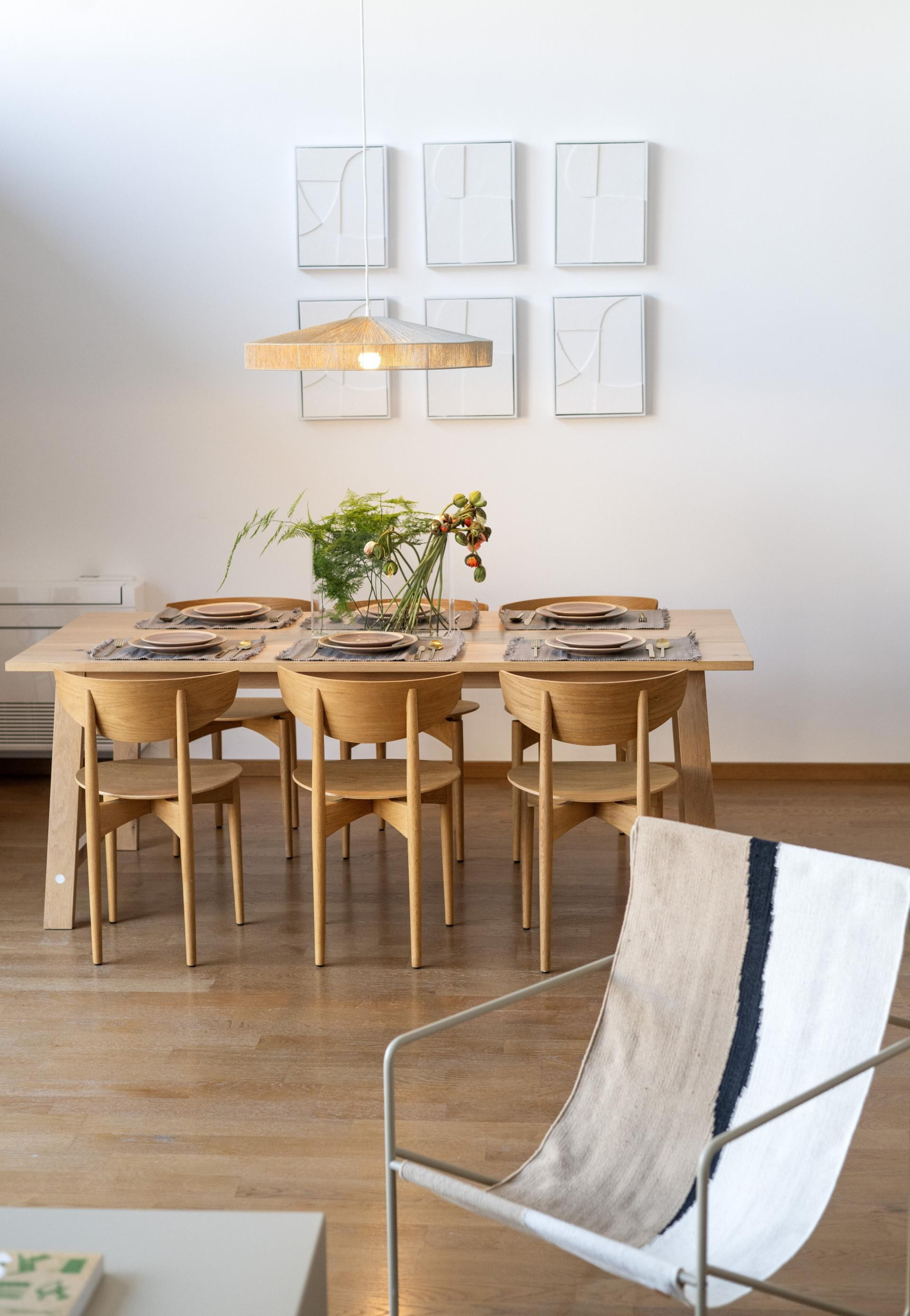 - Htjela sam postići dominantno smirujući interijer usklađenog kolorita, a prostorom boravka koji je spojen s kuhinjom, odnosno open-spaceom, dominira veliki, masivni drveni stol kojem sam pridružila drvene stolce Herman danskog proizvođača Ferm Living. Stolci su dizajnirani s jasnom referencom na najvažniji period u povijesti dizajna, pedesete. Iako su skulpturalni u pojavi, njihov zaobljeni naslon tijelu pruža ugodu sjedenja, a ne samo estetsku privlačnost. Stolci su izrađeni od drva s FSC™ certifikatom, što je za mene vrlo važno - pojašnjava dizajnerica Ferenčak i dodaje kako je za iznad stola odabrala luster od ručno pletenog celuloznog vlakna još jedne danske tvrtke, HK Living, koji ima identični koloristički uzorak kao i Desert lounge, ležerna fotelja tvrtke Ferm Living koja je u potpunosti izrađena od PET boca. To ju čini ne samo ekološkim proizvodom, već je u potpunosti vodootporna i može se po potrebi iznijeti i na terasu.
