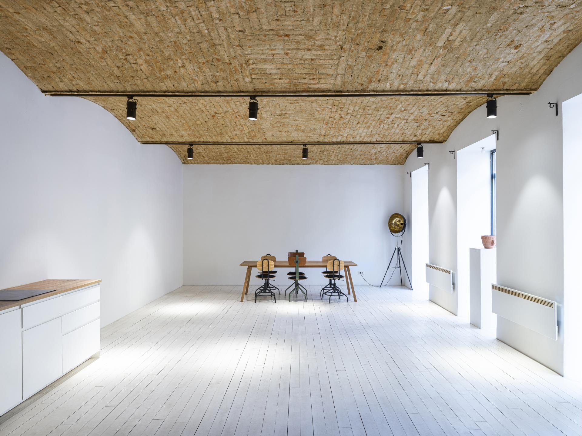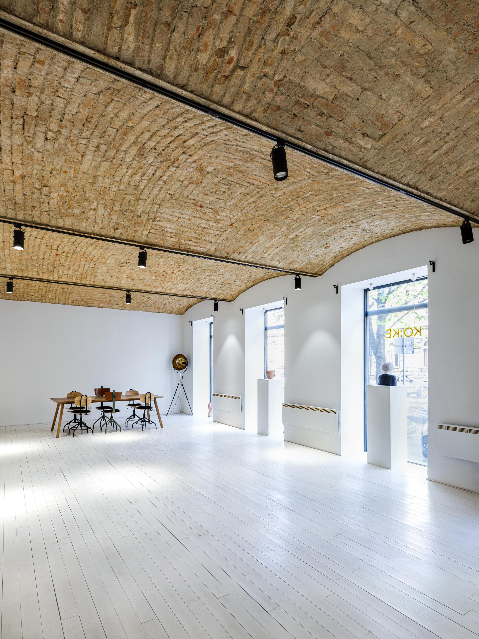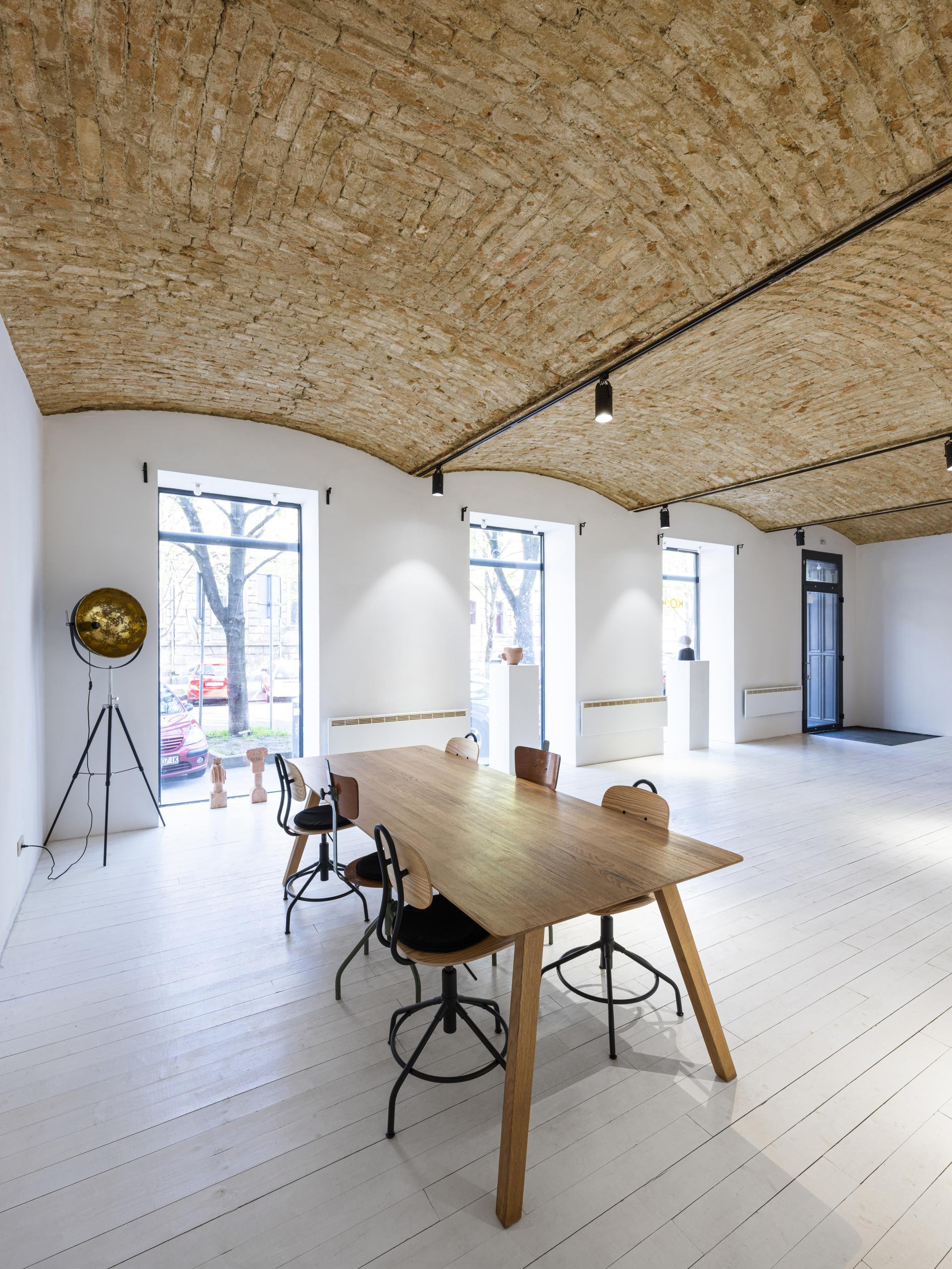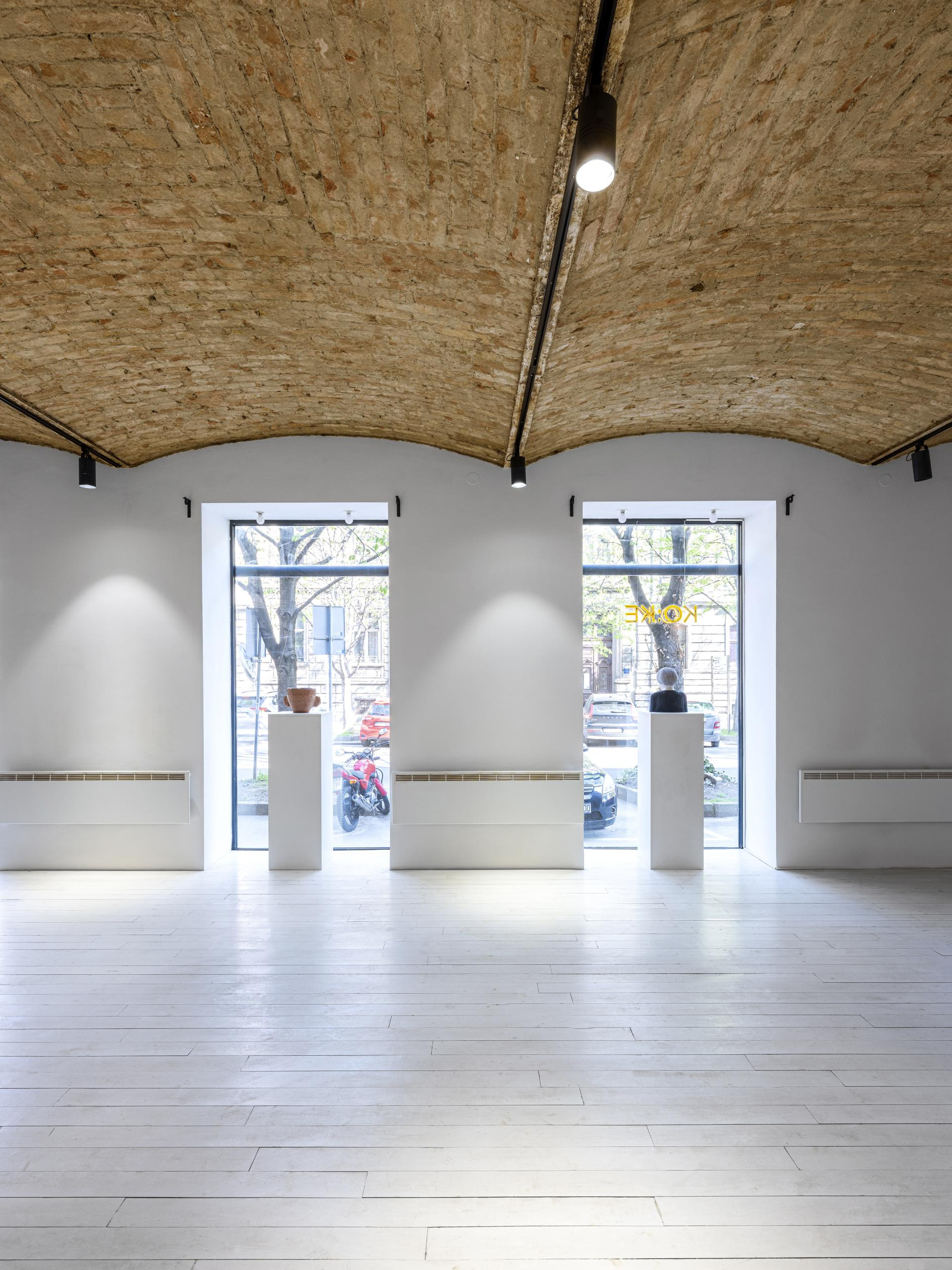 Prostor je zamišljen kao svojevrsna "bijela kutija" - s bijelim zidovima, visokim stropovima od cigle i velikim staklenim izlozima koji stvaraju osjećaj otvorenosti i komunikacije s ulicom. Njegova prostorna čistoća pruža idealnu podlogu za različite sadržaje - od umjetničkih postava do korporativnih događanja. No, unatoč minimalističkoj estetici, prostor ne djeluje hladno - u njemu se zadržava osjećaj domaće atmosfere i poziva na boravak.