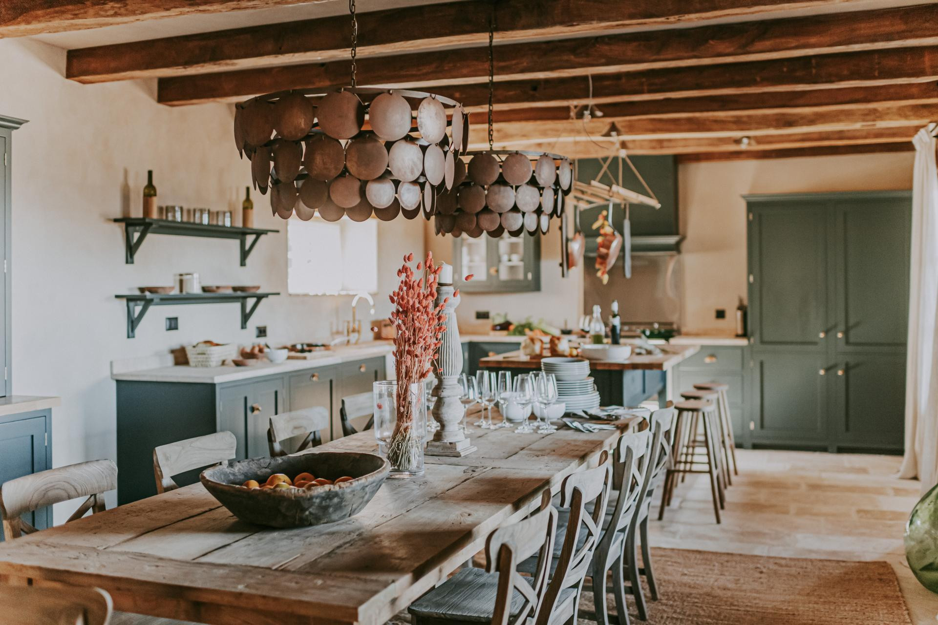 Kuća ima i dva dnevna boravka - prizemlju s otvorenim kaminom, a na prvom katu s masivnim krovnim gredama. Tu su još i ulazni hodnik, velika kuhinja s blagovaonicom te vanjska blagovaonica i, naravno, boravak. Odvojena kućica uz bazen ima ljetnu kuhinju, blagovaonicu i prostor za uživanje i odmor.