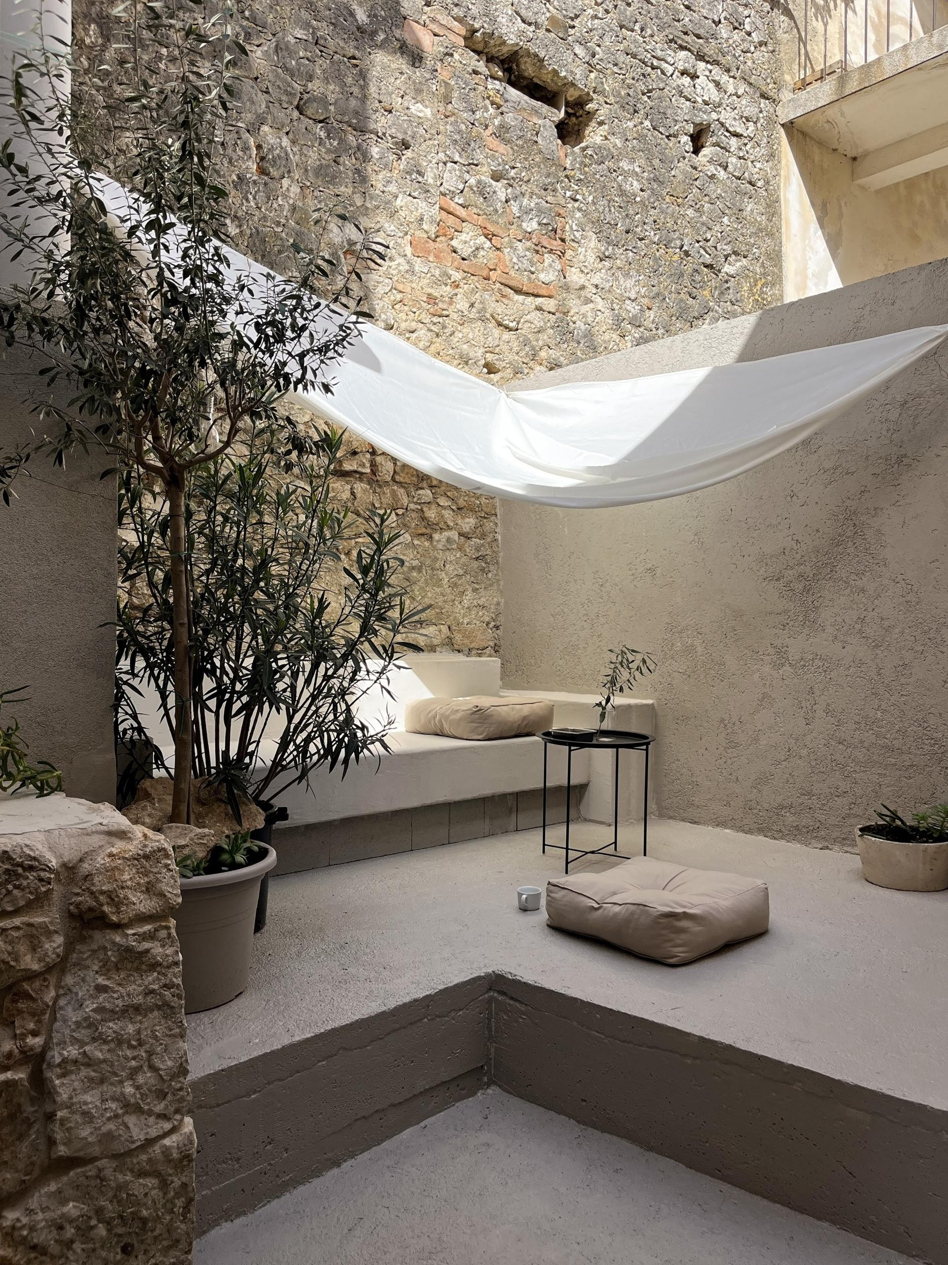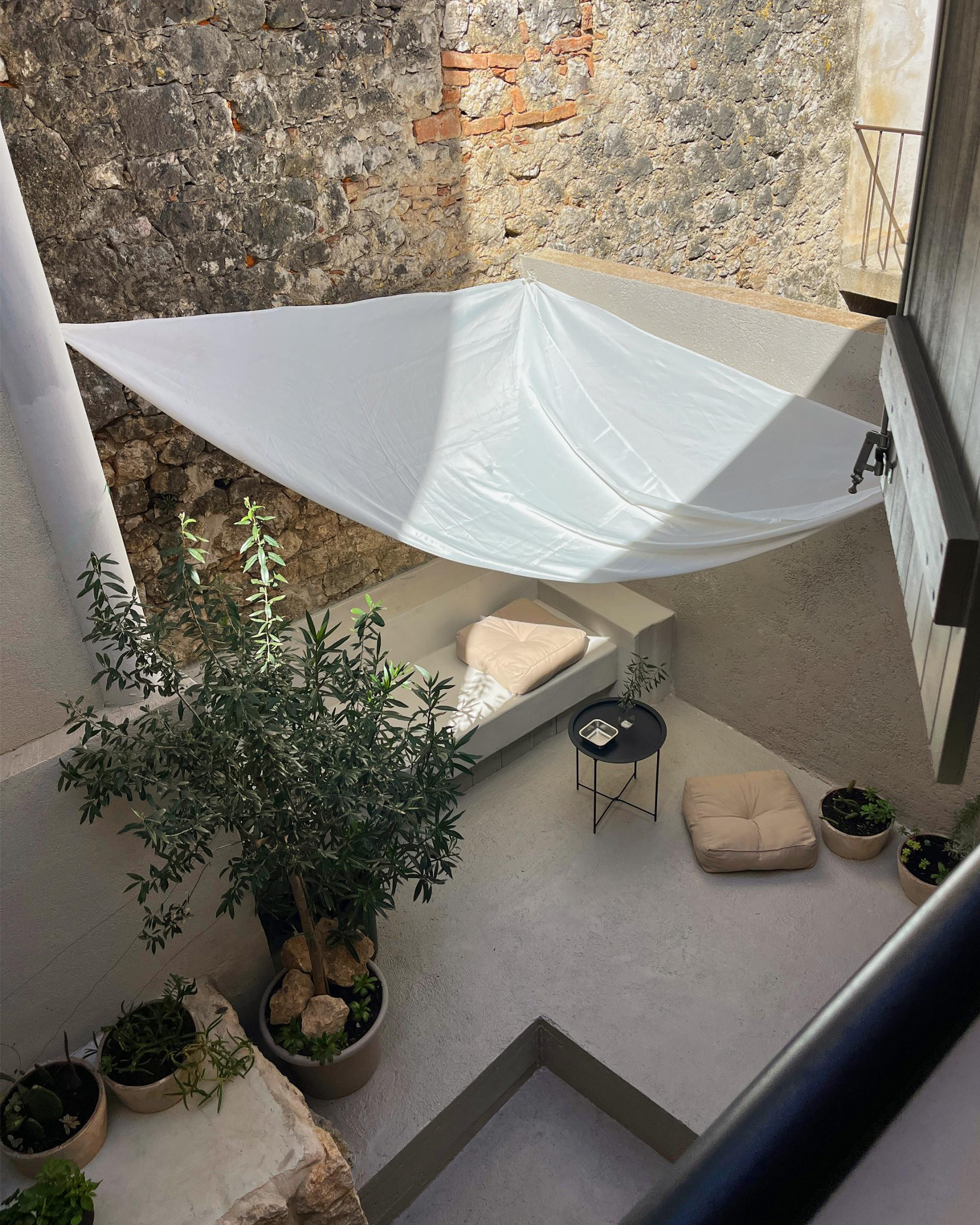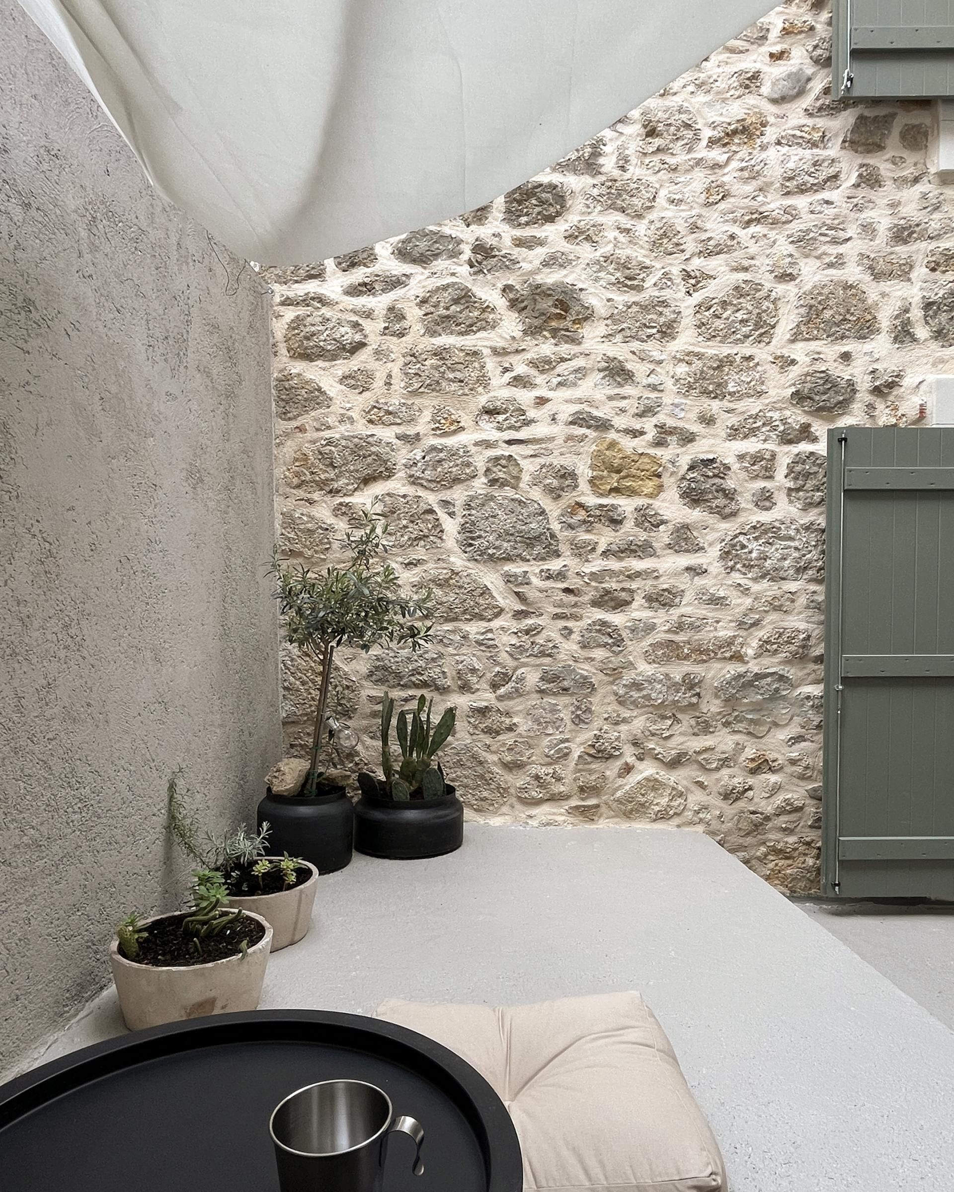Posebna vrijednost projekta je atrijsko dvorište - skrivena terasa ograđena kamenim zidovima - s maslinama, oleandrima i agavama, koje dodatno povezuju kuću s vanjskim prostorom.
