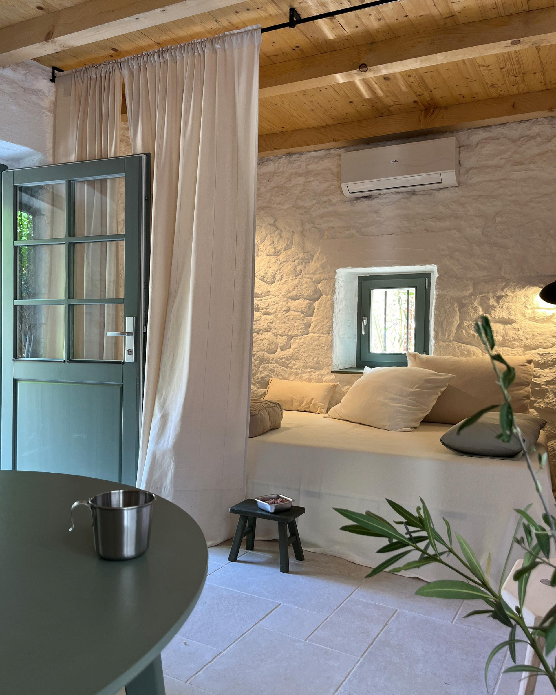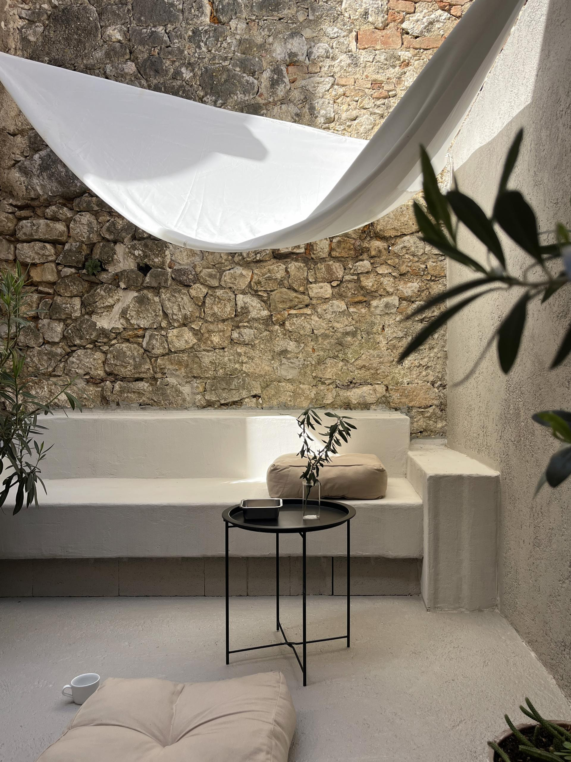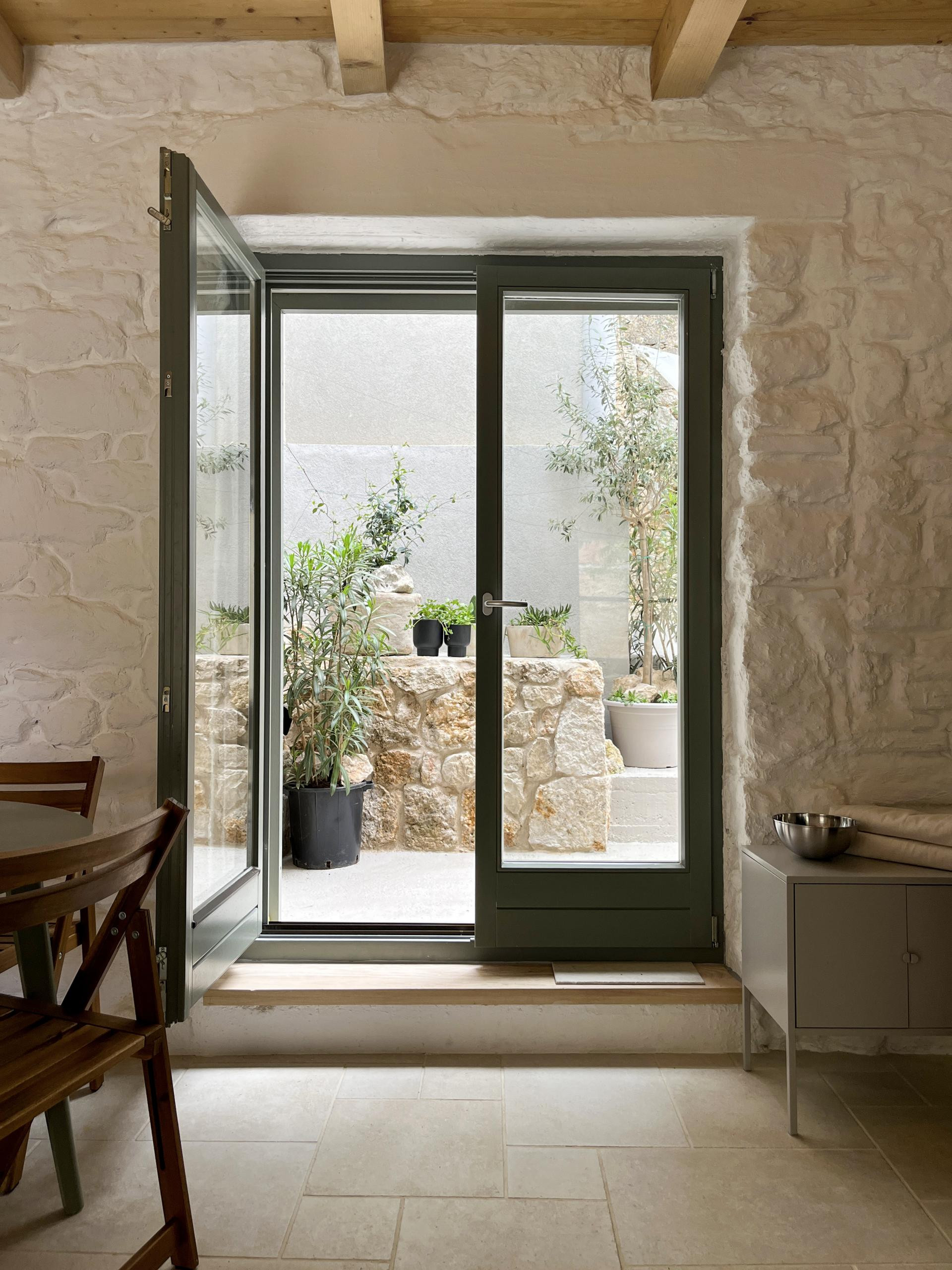 Posebna vrijednost projekta je atrijsko dvorište - skrivena terasa ograđena kamenim zidovima - s maslinama, oleandrima i agavama, koje dodatno povezuju kuću s vanjskim prostorom.