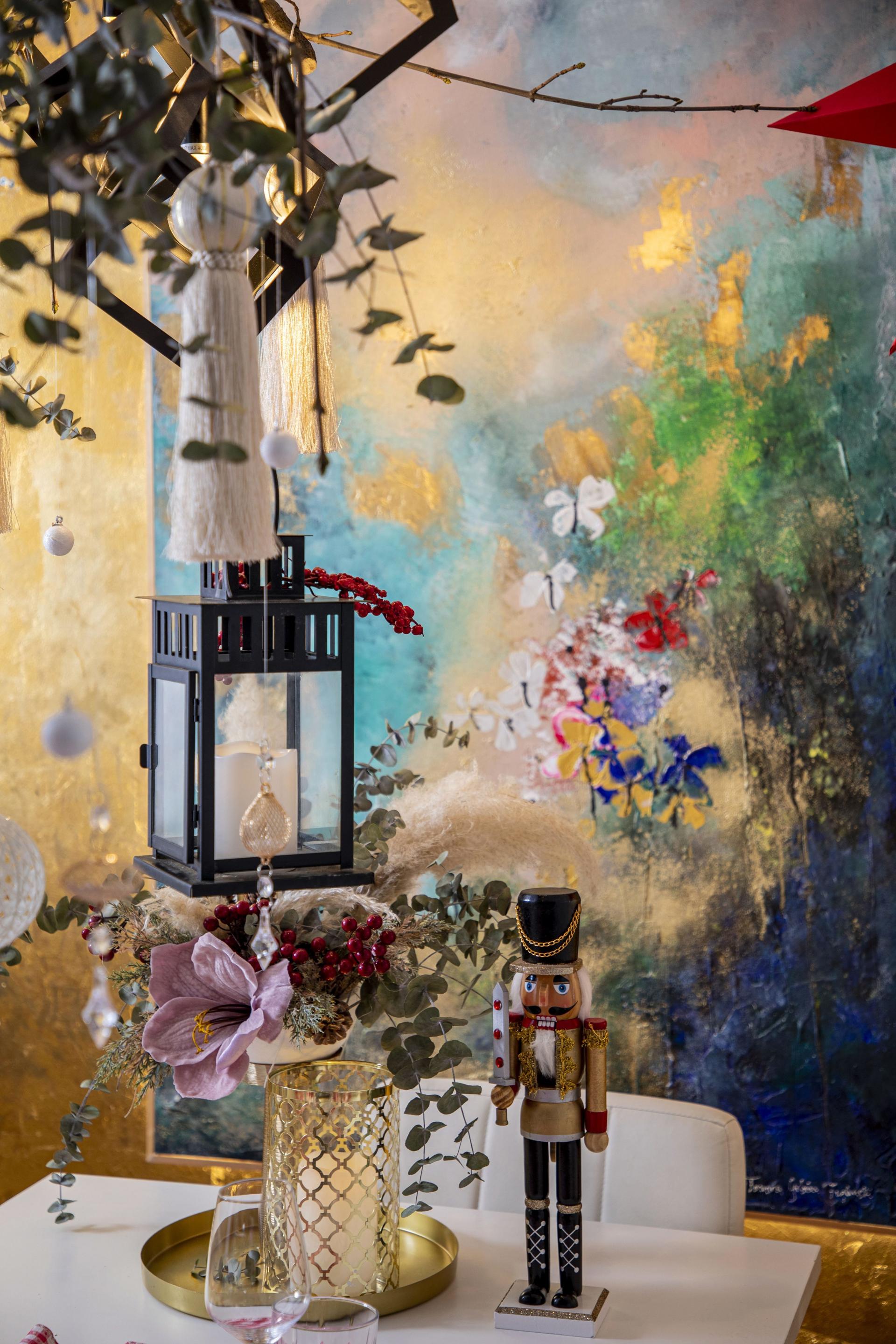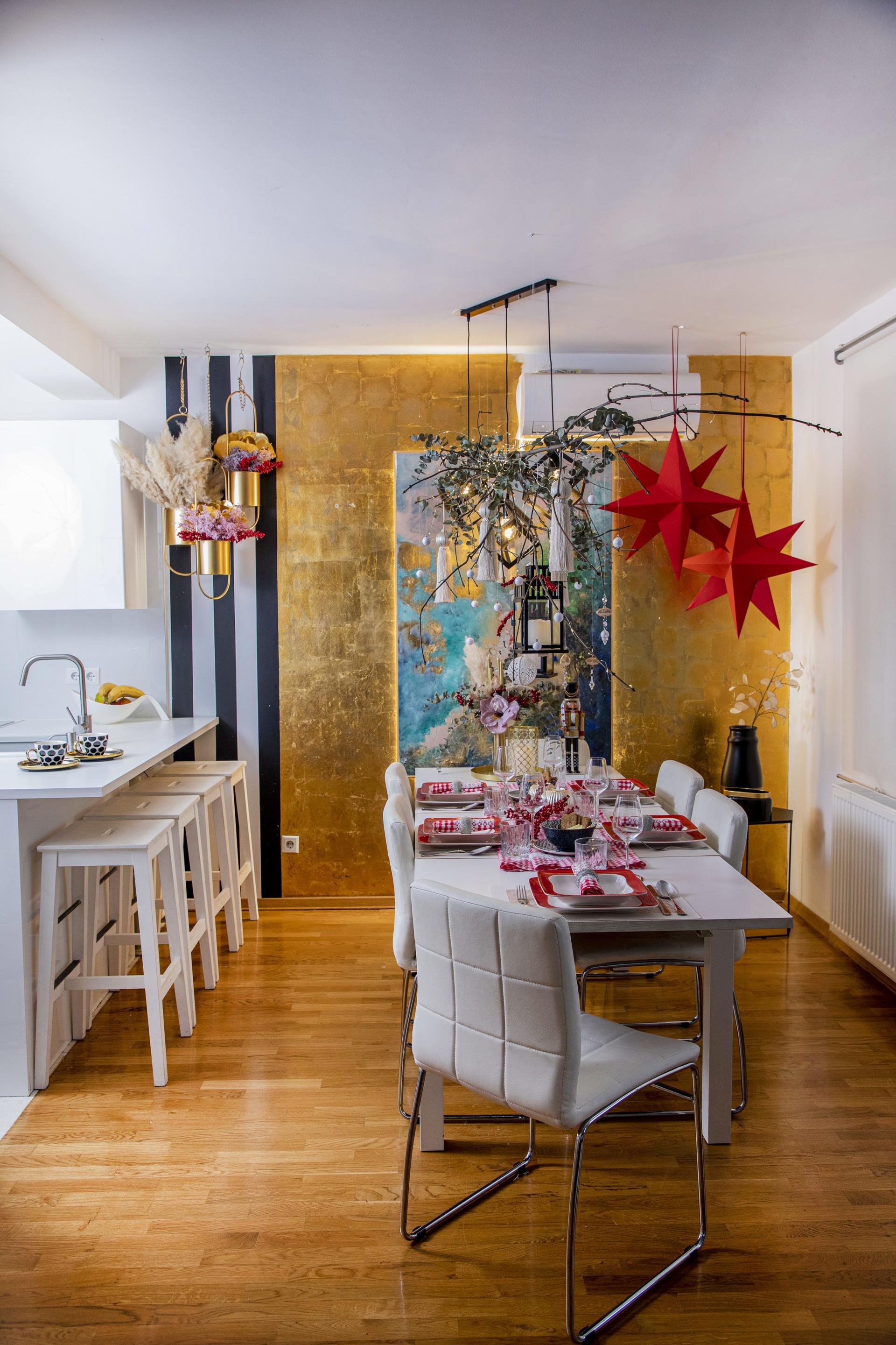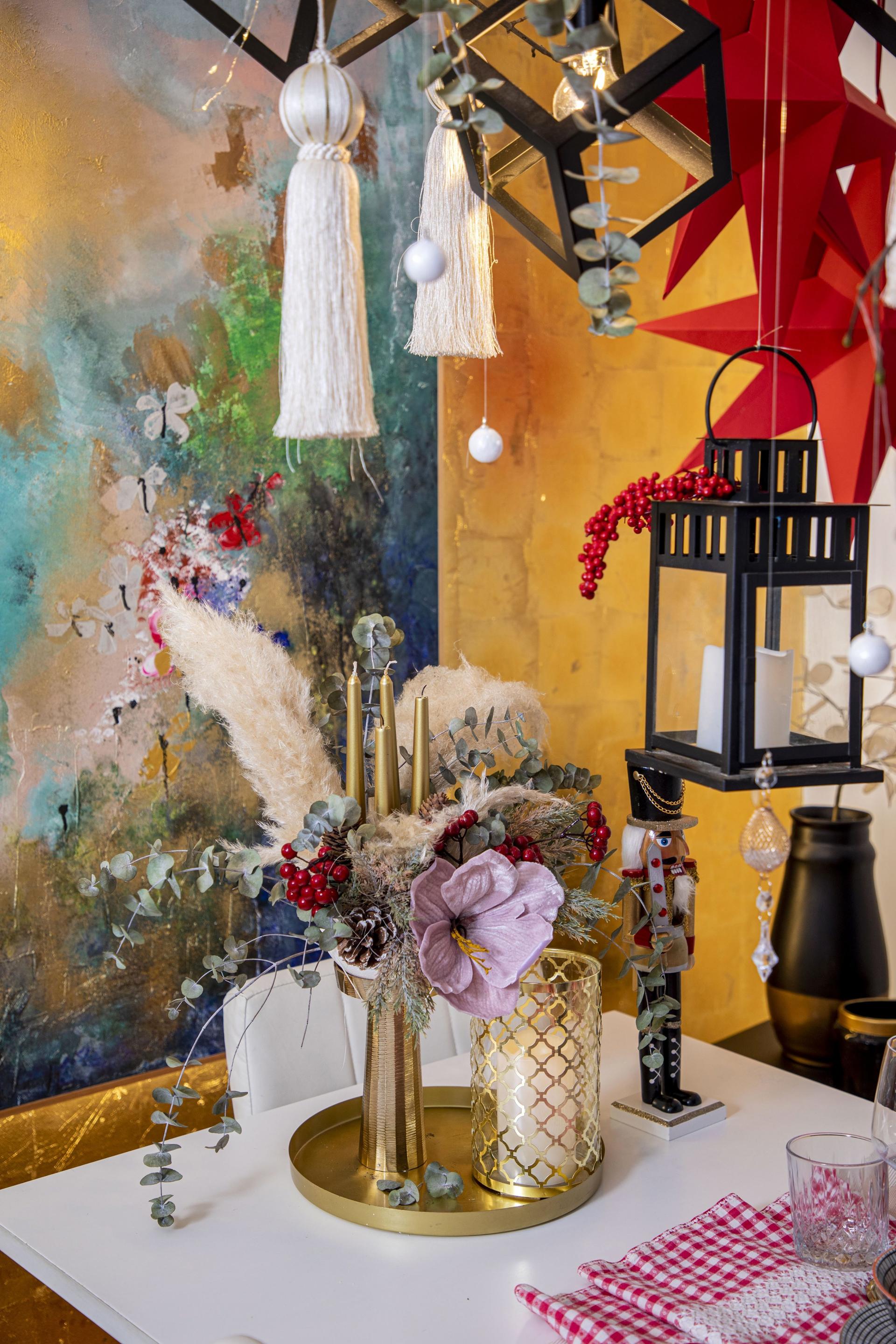 Dnevni boravak spojen je s kuhinjom i blagovaonicom u kojoj dominira zlatni zid, a Tamara je unijela i dašak crvene kao vječni božićni klasik. Umjesto svjetlećeg drvca koji inače koriste, postavila je crvene zvijezde, a centralna dekoracija je viseća instalacija od grana drveta i eukaliptusa. Za nju je iskoristila lanterne s lođe, a pampase je podrezala i iz visoke podne vaze preselila u viseće zlatne tegle uz malo crvenih bobica i suhih dekorativnih grančica.