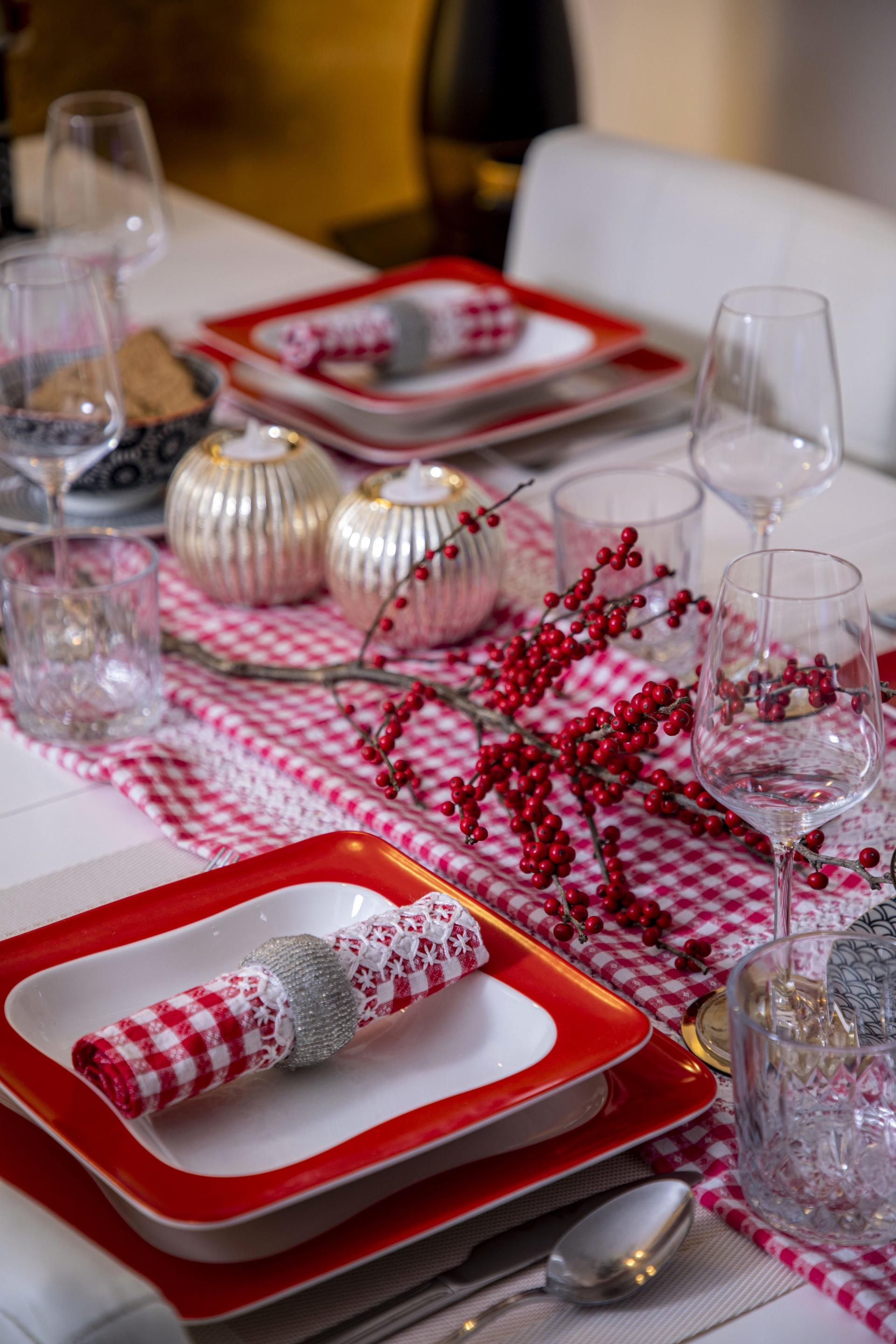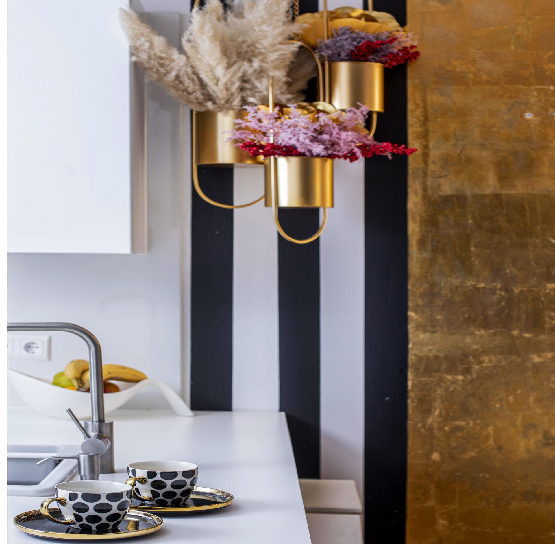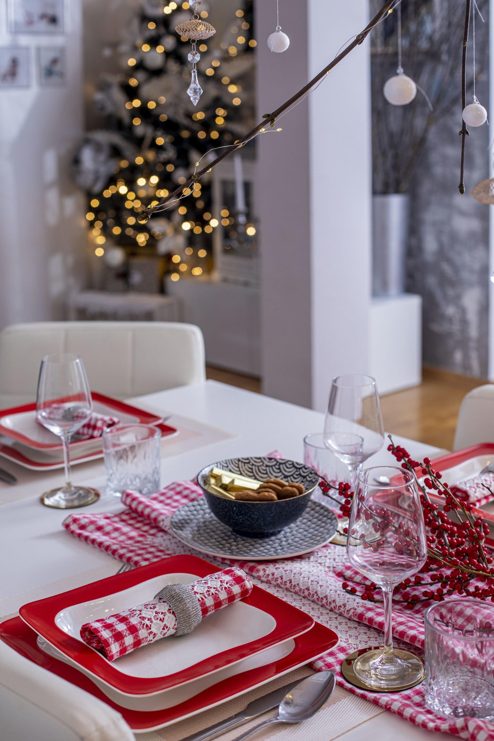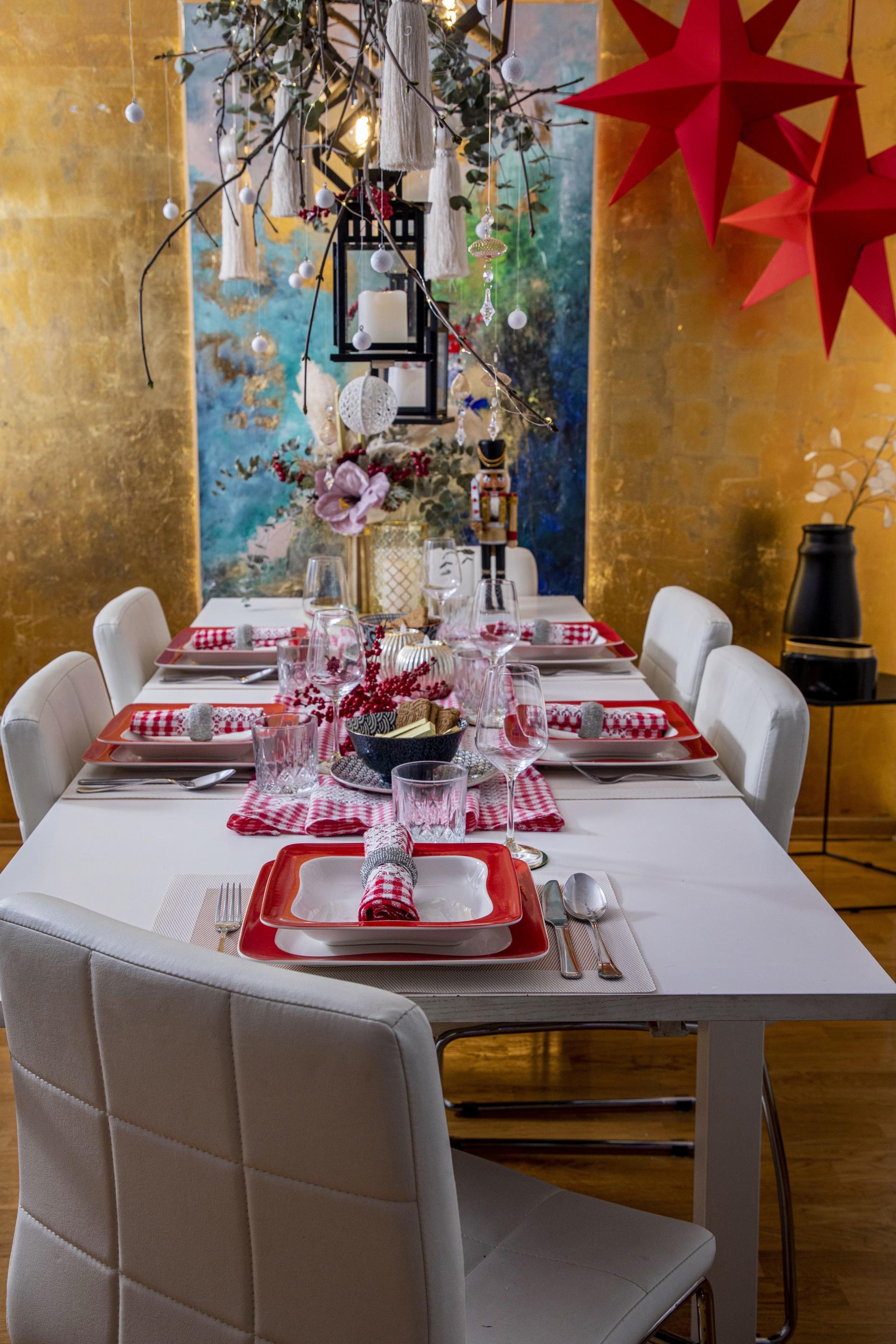 Dnevni boravak spojen je s kuhinjom i blagovaonicom u kojoj dominira zlatni zid, a Tamara je unijela i dašak crvene kao vječni božićni klasik. Umjesto svjetlećeg drvca koji inače koriste, postavila je crvene zvijezde, a centralna dekoracija je viseća instalacija od grana drveta i eukaliptusa. Za nju je iskoristila lanterne s lođe, a pampase je podrezala i iz visoke podne vaze preselila u viseće zlatne tegle uz malo crvenih bobica i suhih dekorativnih grančica.