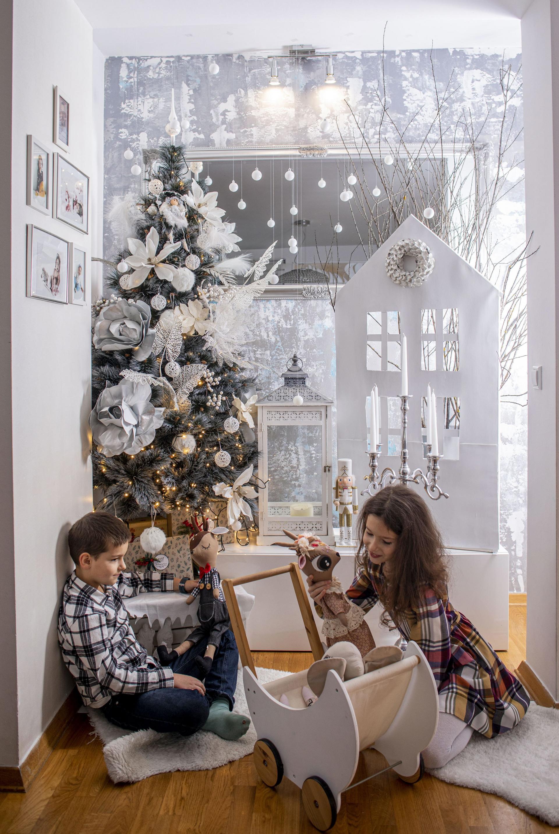 Svake godine, kaže Tamara, osmisli neku drugu božićnu priču i mijenja boje. Ove godine tu su bijela i srebrna. Drvce inače tradicionalno kite na Badnjak, no uoči našeg dolaska ove su ga godine odmah ukomponirali u cijelu postavu. Uz njega dominira i kućica čija je konstrukcija izrađena od drvenih letvi te obložena kartonom. Tamara je izrezala prozore i prebojala u bijelo. Djeca su, pitamo, oduševljena?