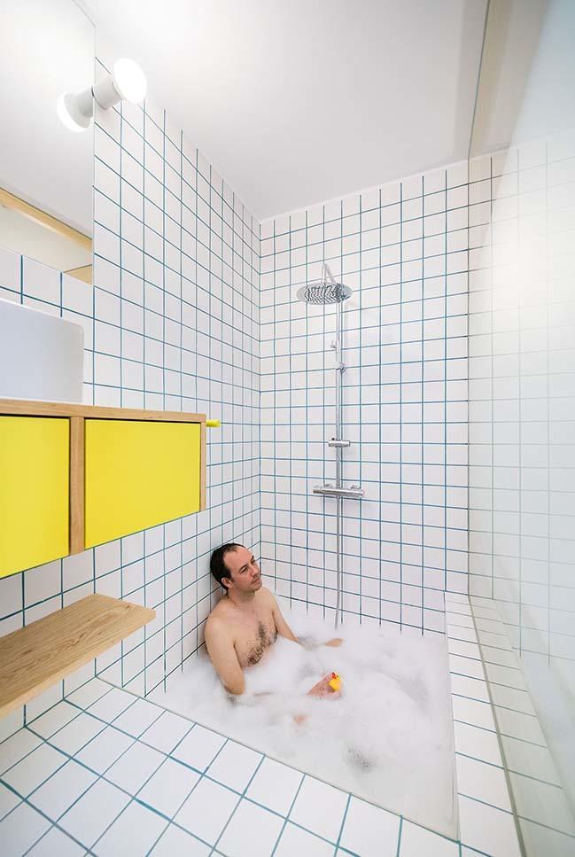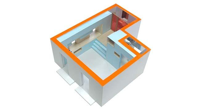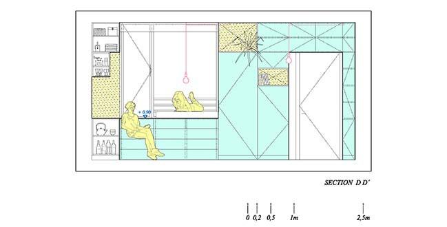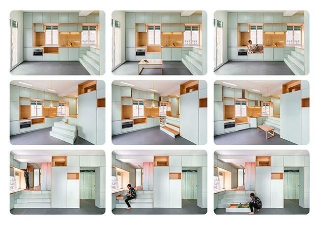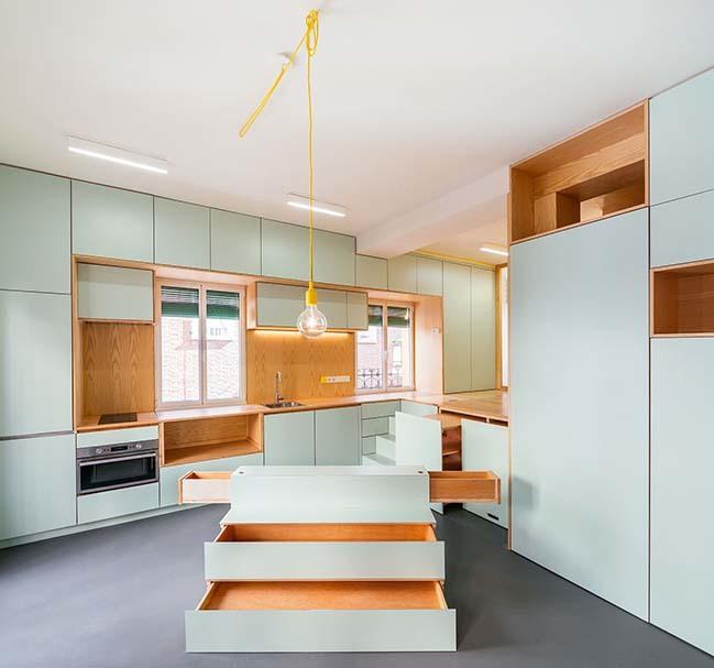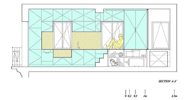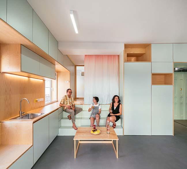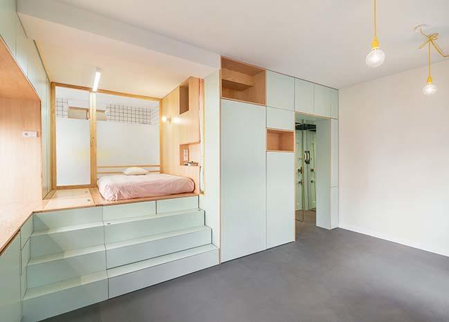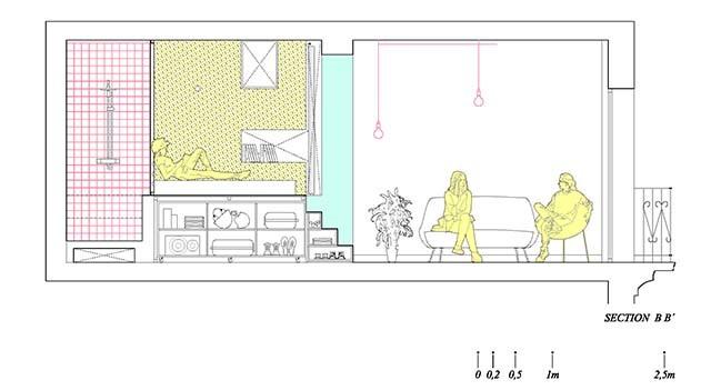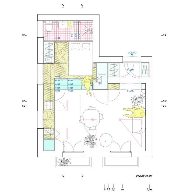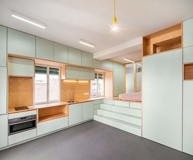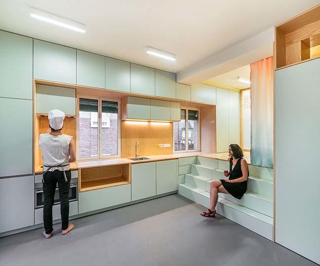 Španjolski arhitekti iz studija Elii, pozabavili su se razinama prostora u ovom stanu. Izolirali su ulaz kako bi dali privatnost spavaćoj sobi i kupaonici, a zatim su gradiranjem ravnina stana stvorili tri prostorna područja. Uzdignuta platforma za krevet, nalazi se 90 centimetara iznad razine poda i uredno skriva spremišta ispod stepenica, dok je u kupaonici dobiven prostor za smještaj udubljene kade. Ostala površina koristi se za kuhanje i druženje.