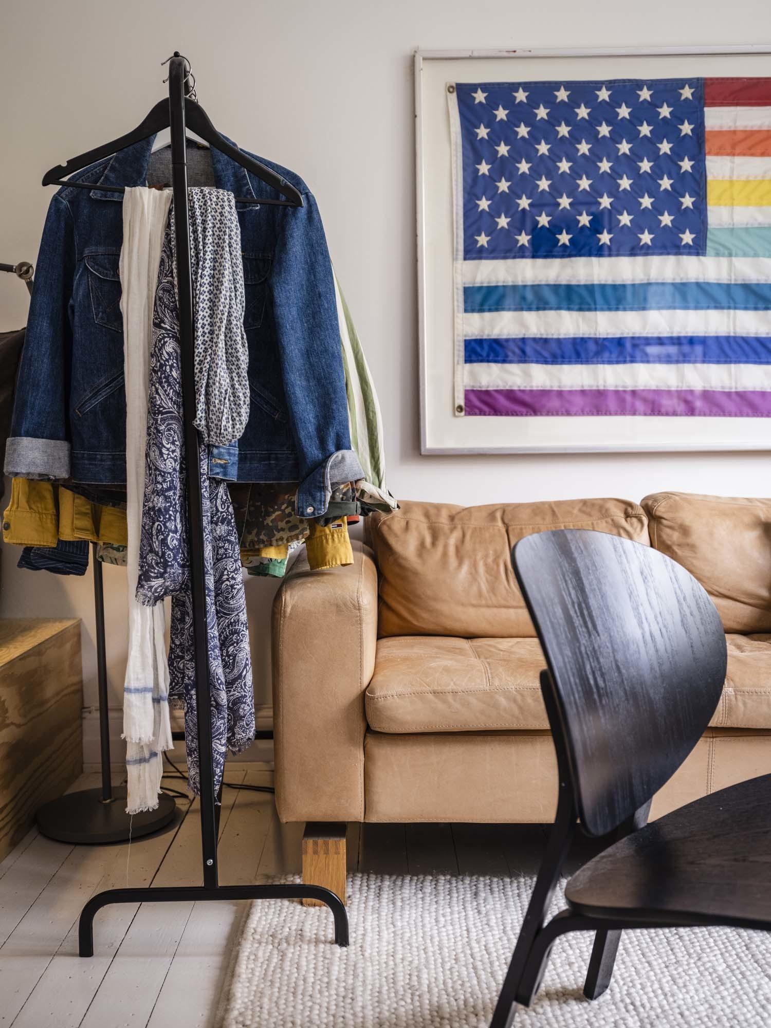 S krevetom gurnutim uza oba zida, strana sobe koja je za "henganje" može se malo raširiti, što je odlično kada dođu prijatelji. Kako bi stvorio osjećaj privatnosti, jednostavna vješalica za odjeću odvaja krevet od dnevnog boravka: još jedan primjer pametne dvostruke funkcije na djelu!
