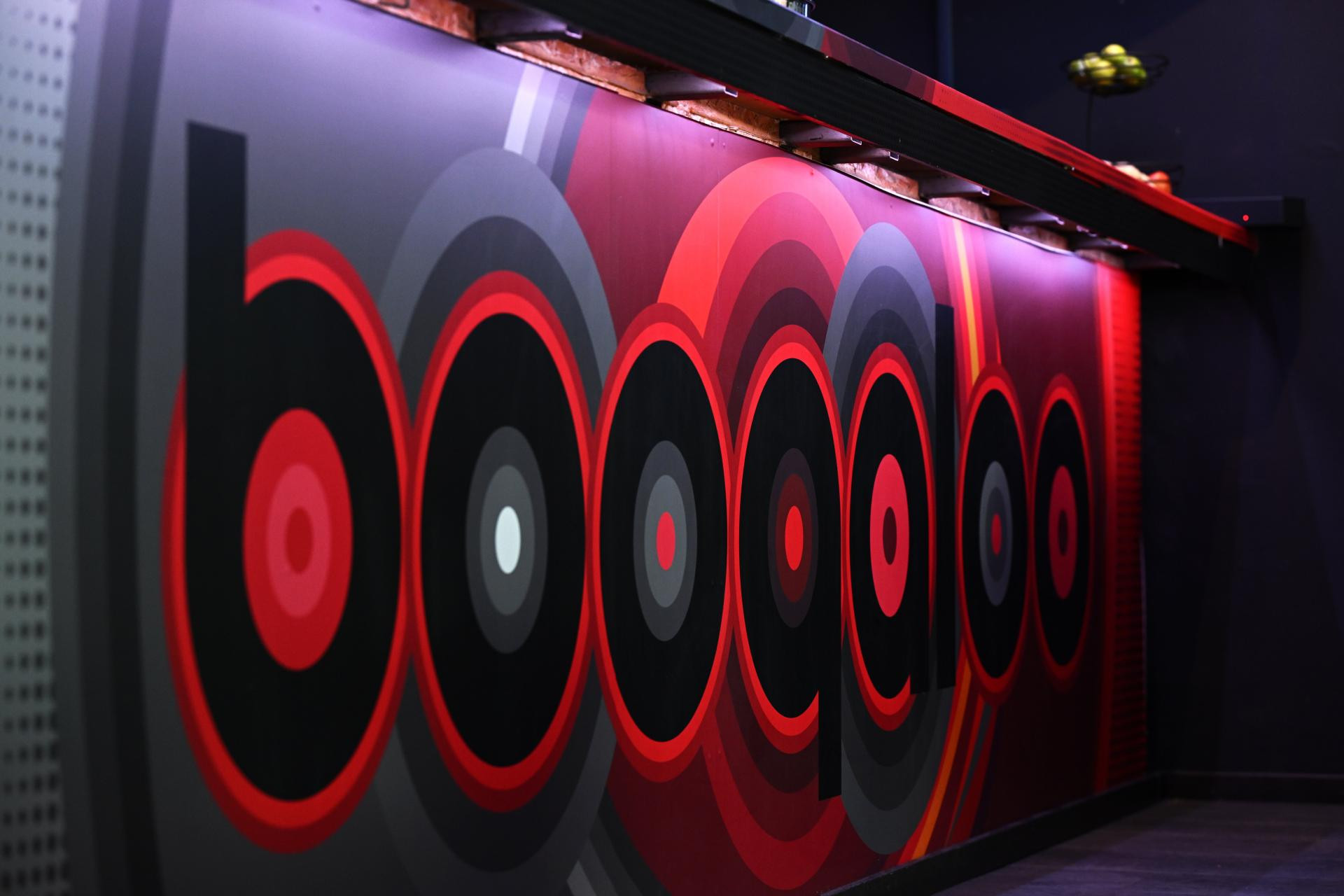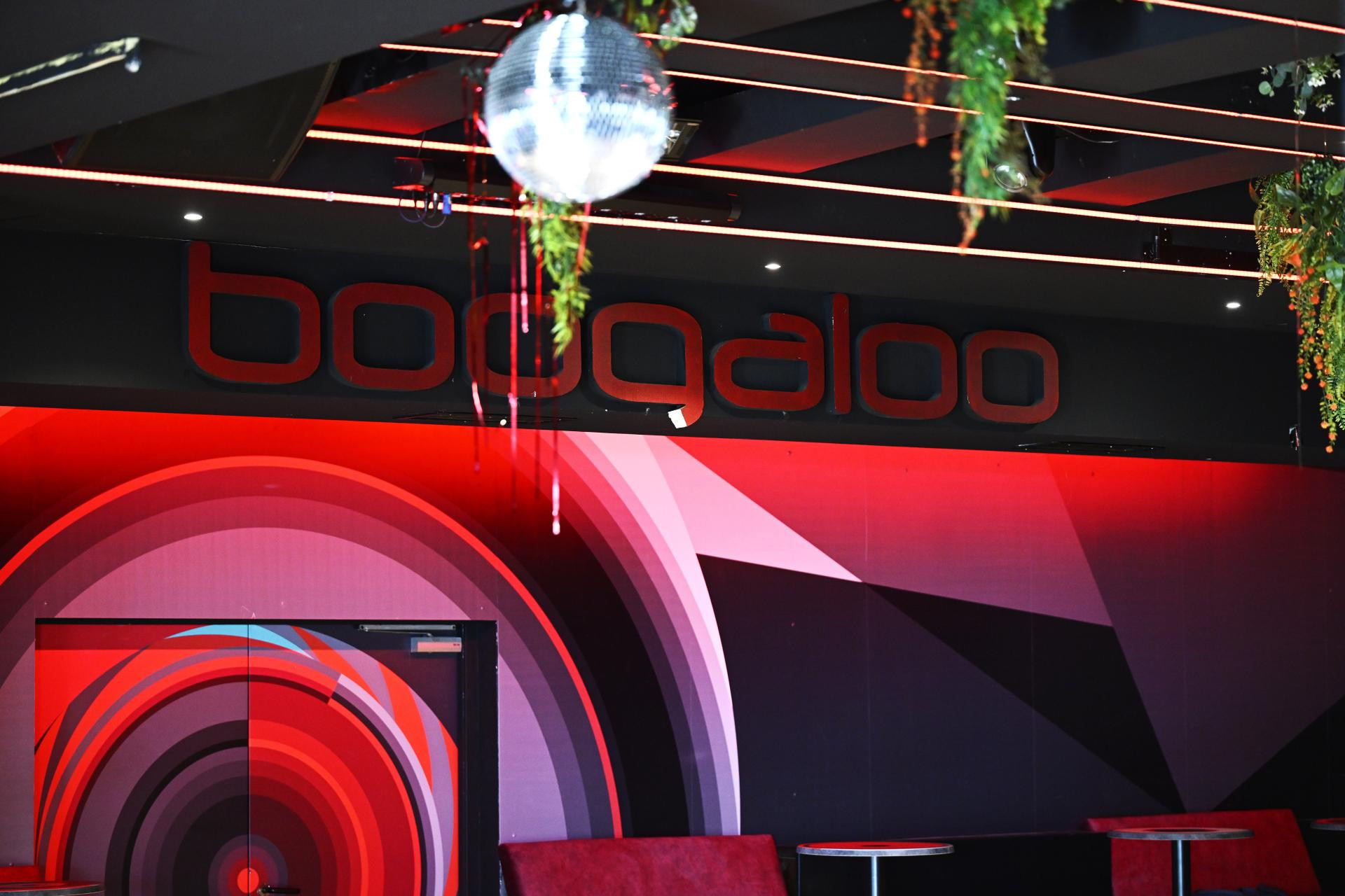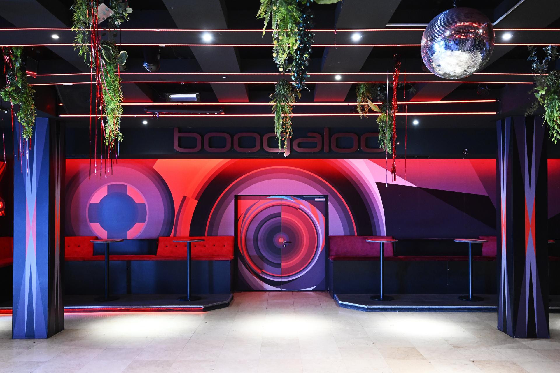 Boogaloo ima veliku i malu dvoranu: manja se sastoji od prostora s kafićem koji radi i tijekom dana te dijela s pozornicom i plesnim podijem. Light show u večernjoj varijanti stvara potpuno drugačiji vizualni doživljaj cijelog prostora. Svjetlosni efekti, programirani da mijenjaju boje, istovremeno akcentiraju pojedine fragmente vizuala na zidovima i dočaravaju dojam da zidovi - tj. vizuali na njima - plešu.