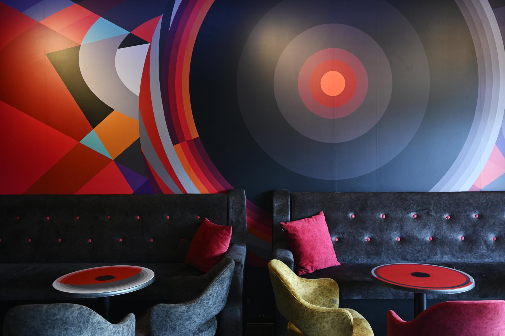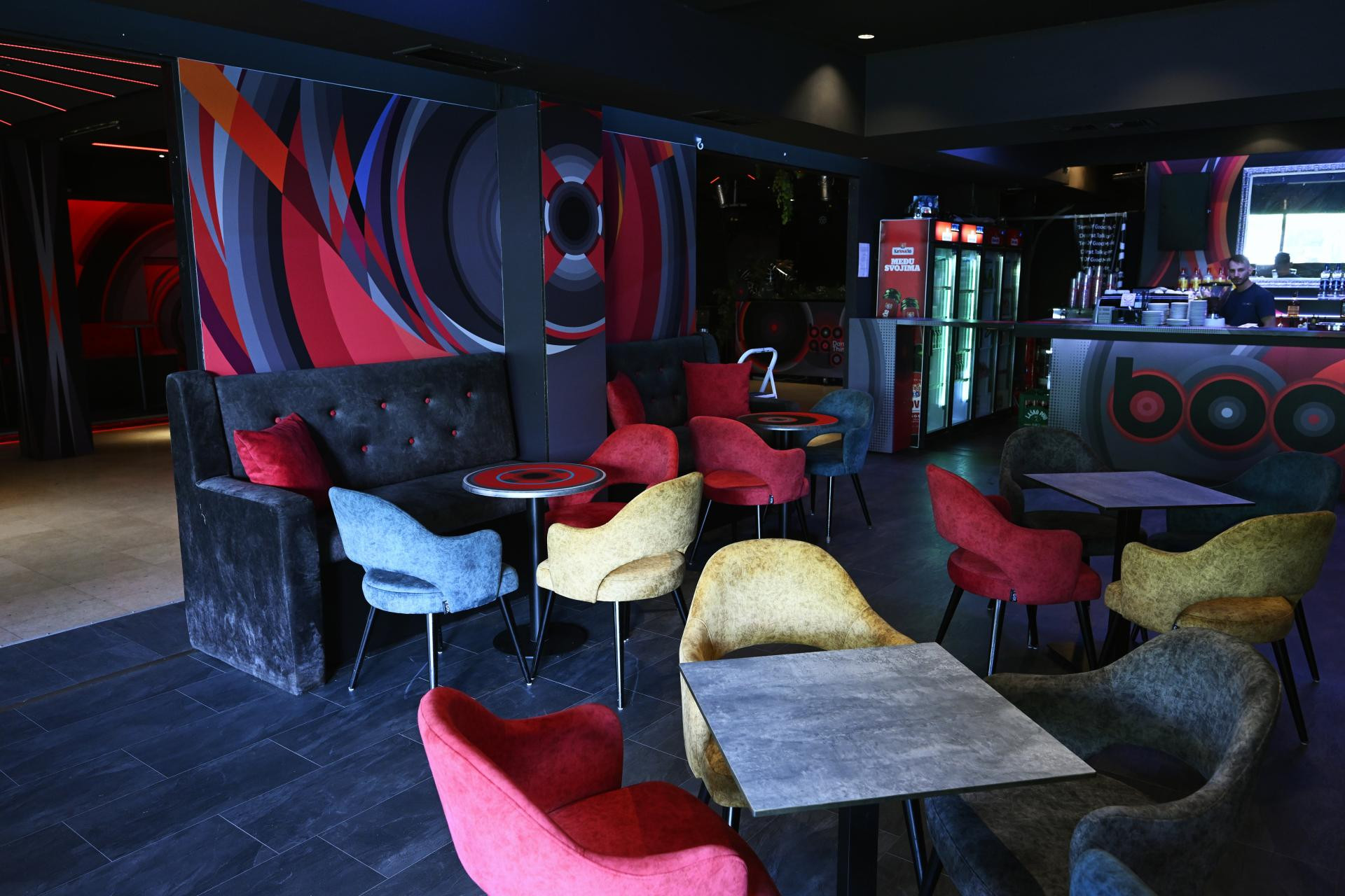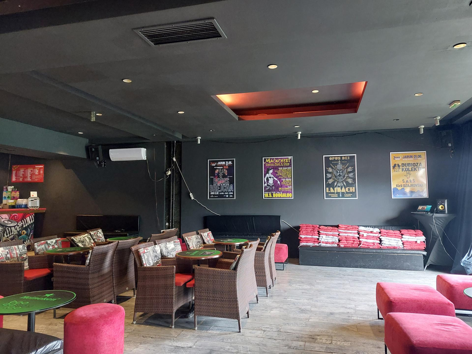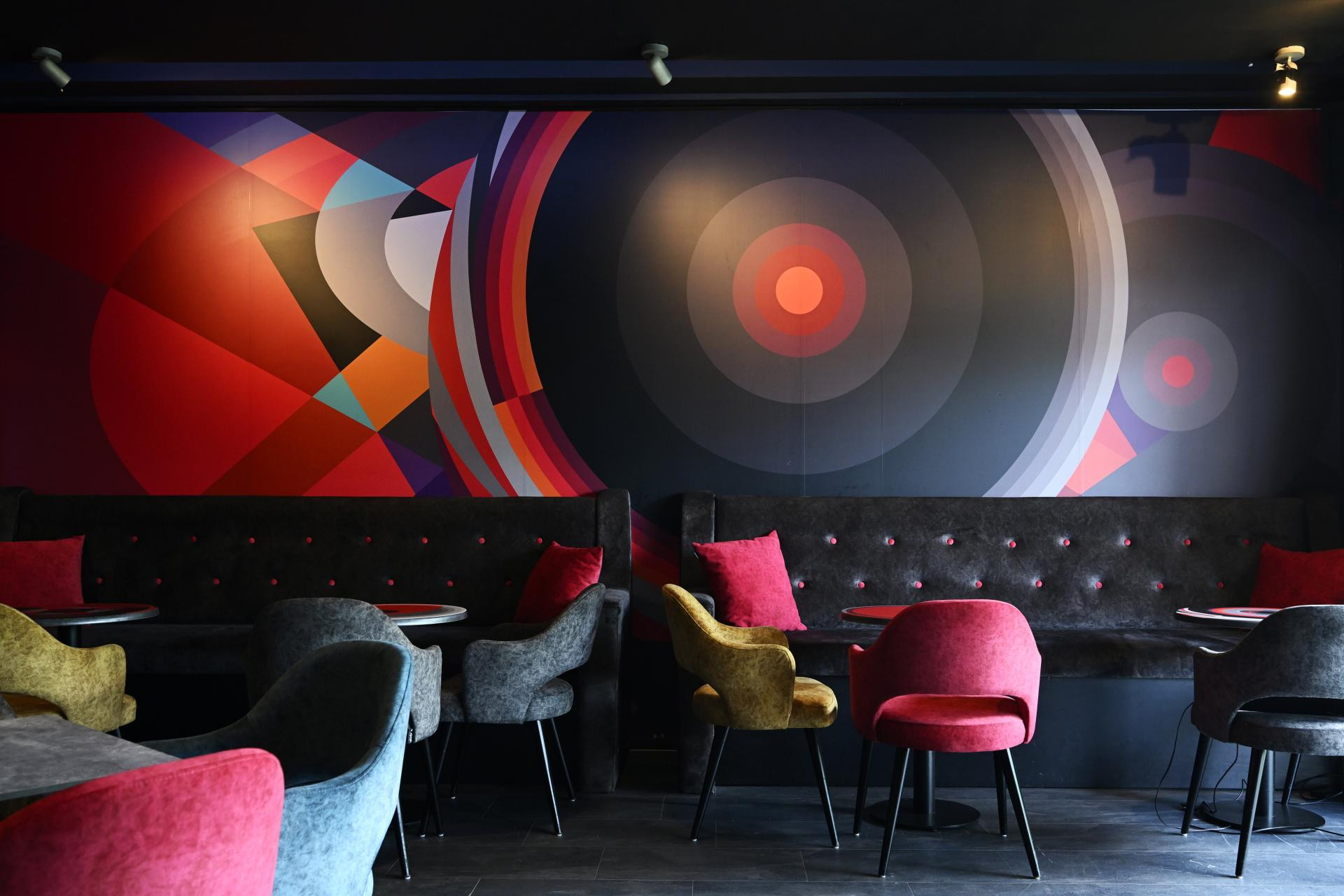Zid koji dijeli kafić i malu dvoranu oslikan je u sivim i crnim tonovima i osmišljen tako da ostavlja dojam razlomljenog prostora s asimetričnim, strogim plohama. Važno je istaknuti da su stolovi, šank, vrata prema velikoj dvorani i DJ pult uklopljeni u ambijent kao unikatni elementi - svaki posebno dizajniran - detaljno nam objašnjava.
