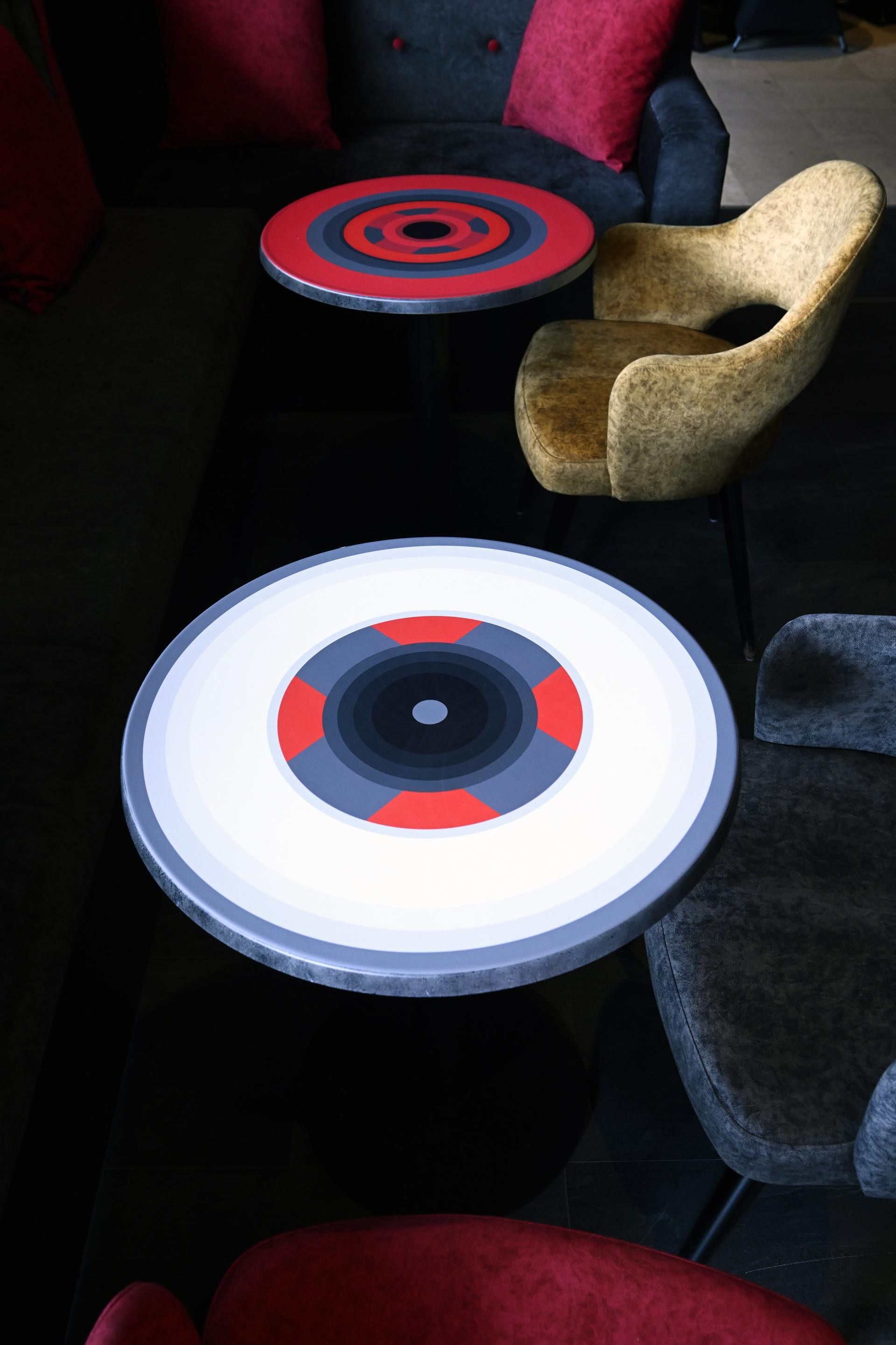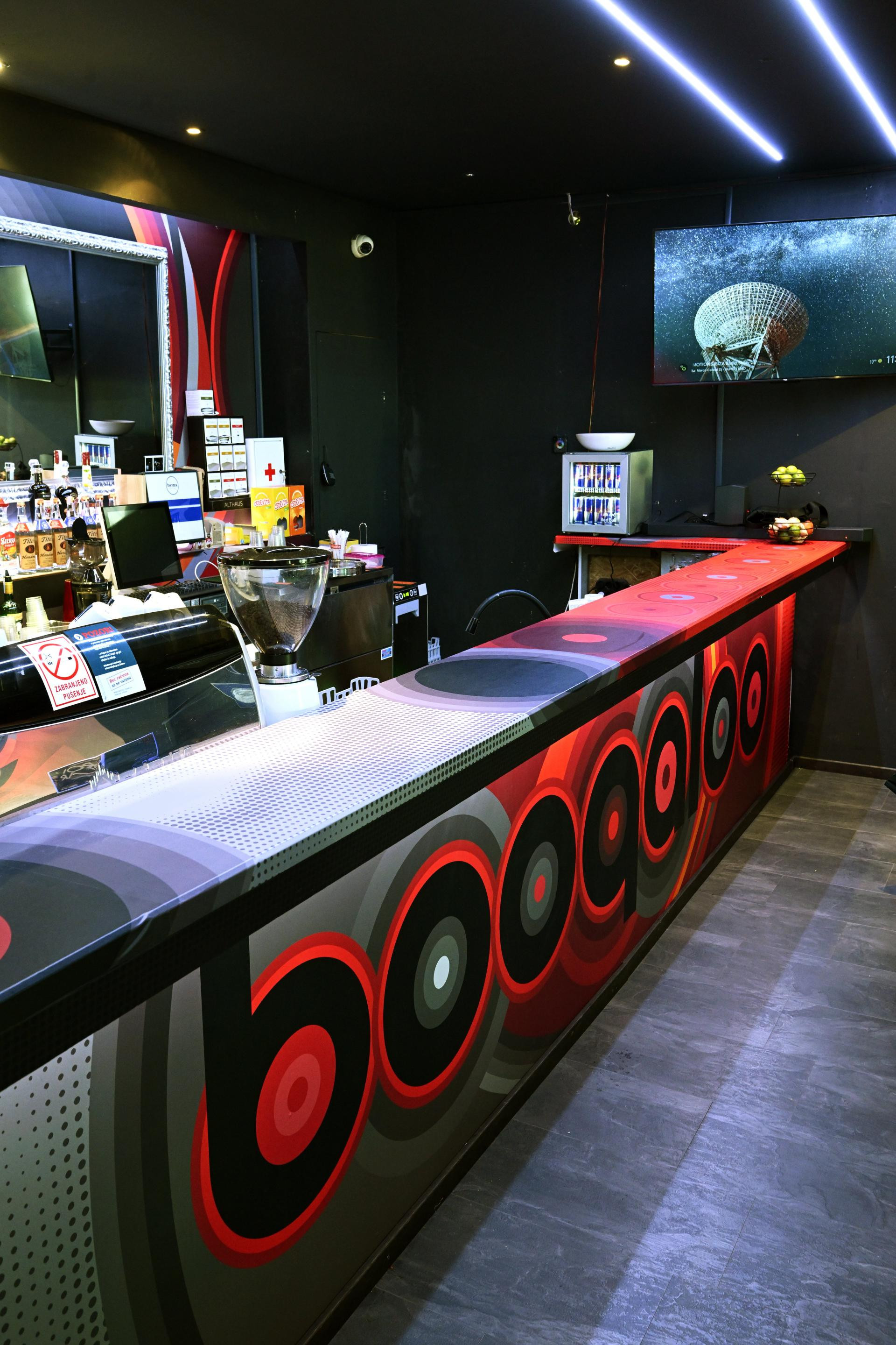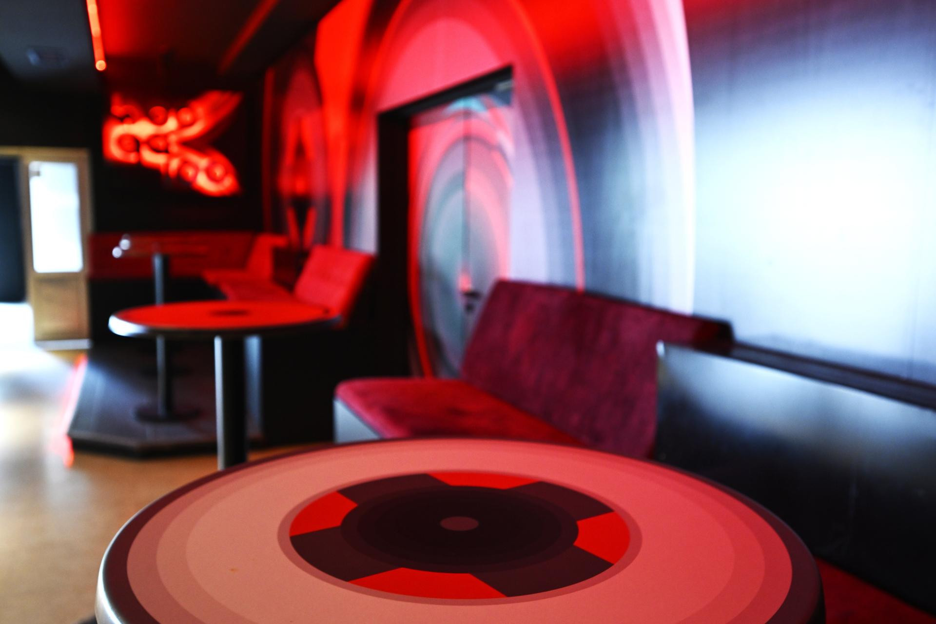 Zid koji dijeli kafić i malu dvoranu oslikan je u sivim i crnim tonovima i osmišljen tako da ostavlja dojam razlomljenog prostora s asimetričnim, strogim plohama. Važno je istaknuti da su stolovi, šank, vrata prema velikoj dvorani i DJ pult uklopljeni u ambijent kao unikatni elementi - svaki posebno dizajniran - detaljno nam objašnjava.