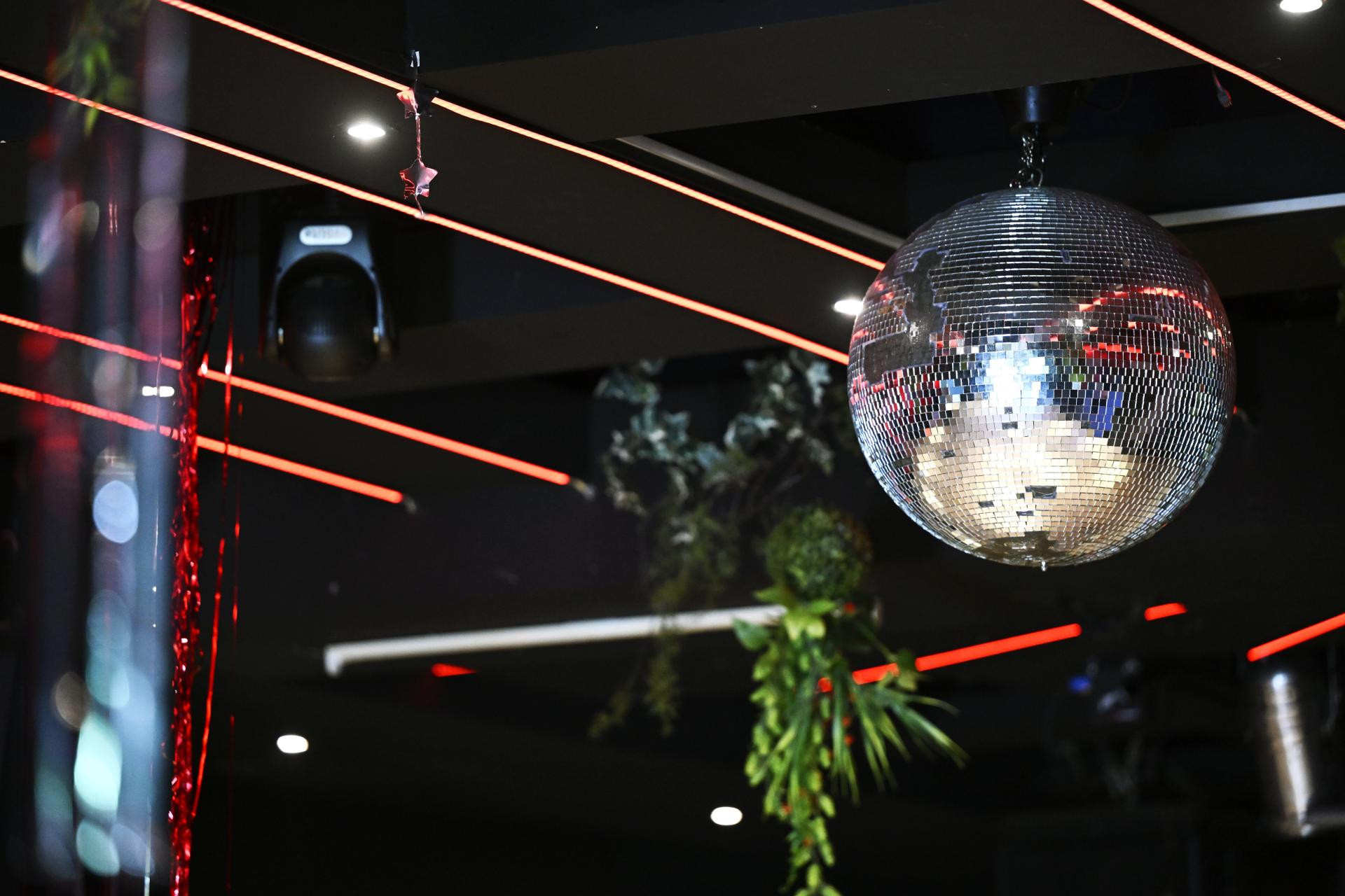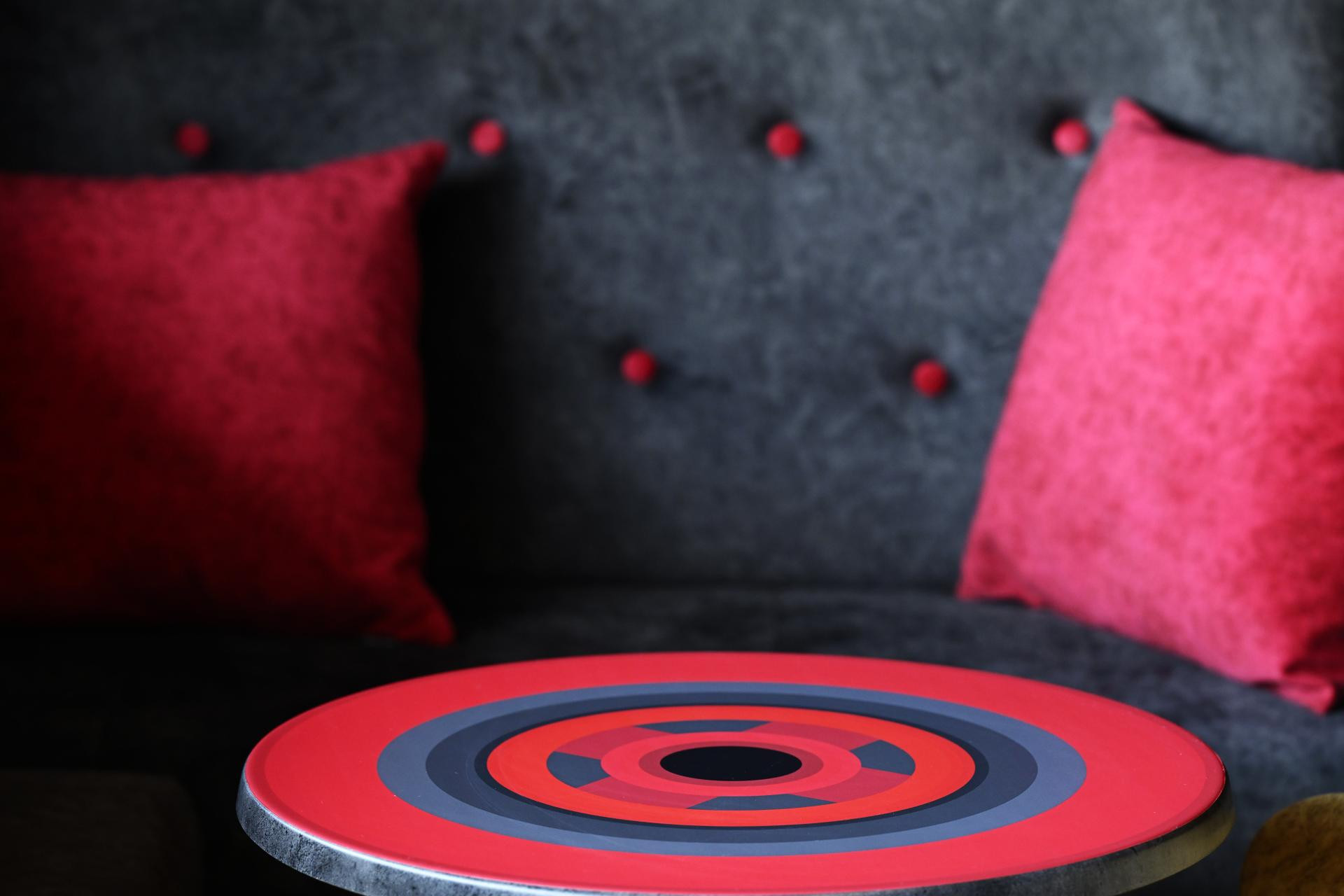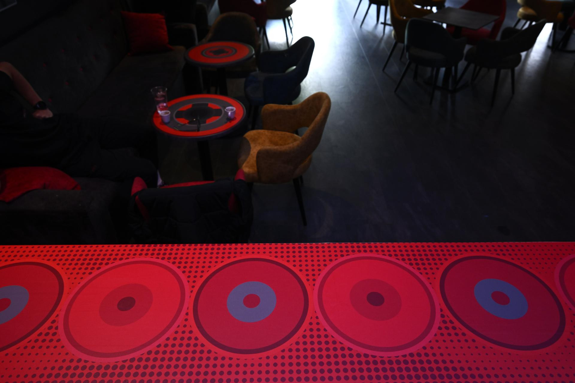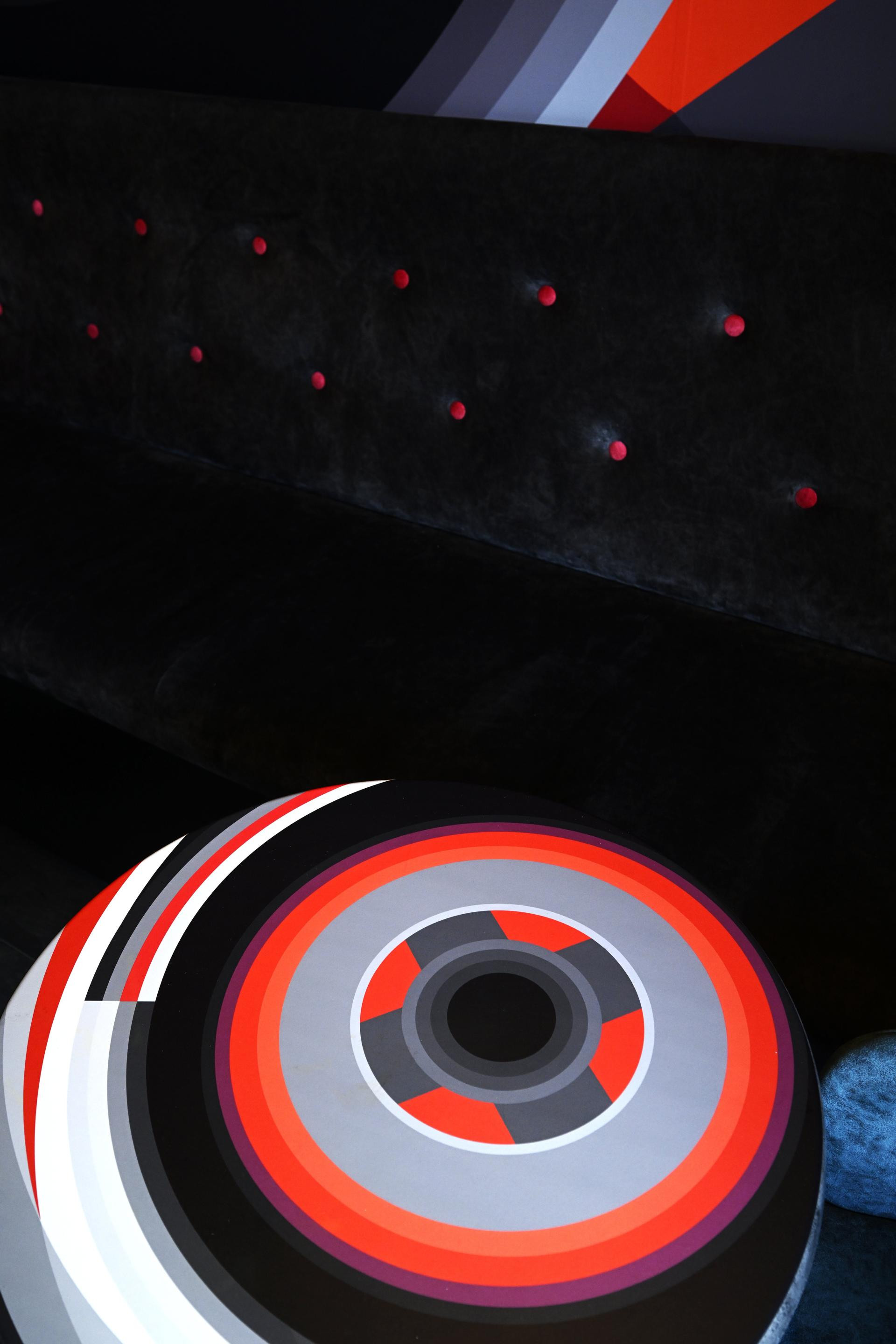 Zid koji dijeli kafić i malu dvoranu oslikan je u sivim i crnim tonovima i osmišljen tako da ostavlja dojam razlomljenog prostora s asimetričnim, strogim plohama. Važno je istaknuti da su stolovi, šank, vrata prema velikoj dvorani i DJ pult uklopljeni u ambijent kao unikatni elementi - svaki posebno dizajniran - detaljno nam objašnjava.