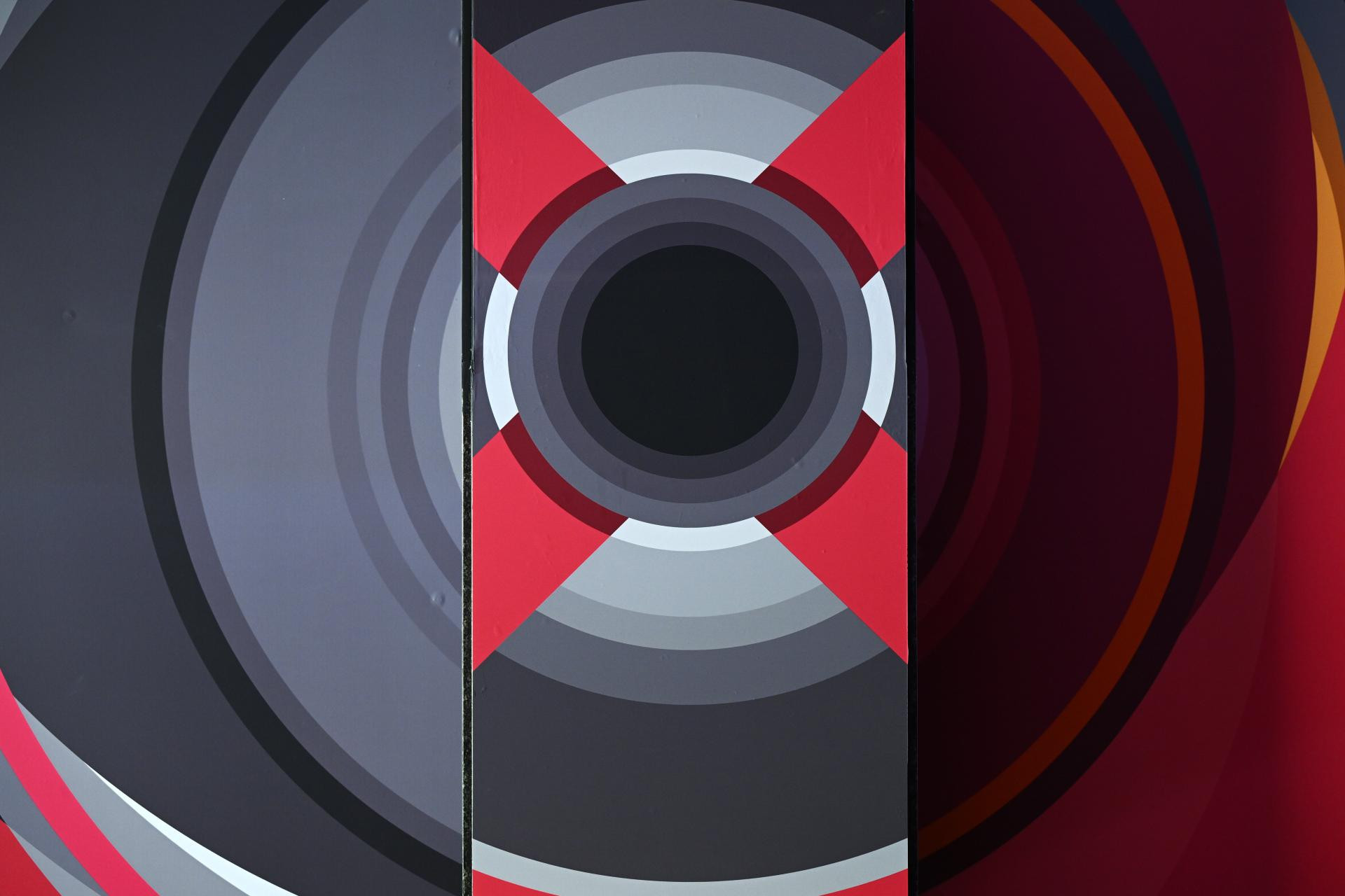 - Odabir boja bio je prvi korak, na temelju kojeg sam definirala geometrijske oblike, točnije znakove i simbole, koji su multipliciranjem i međusobnim prožimanjem stvorili dojam dinamičnih kompozicija, vrtloga i optičkih iluzija - sastavljenih od krugova i geometriziranih ploha u nijansama crvene, crne i sive.