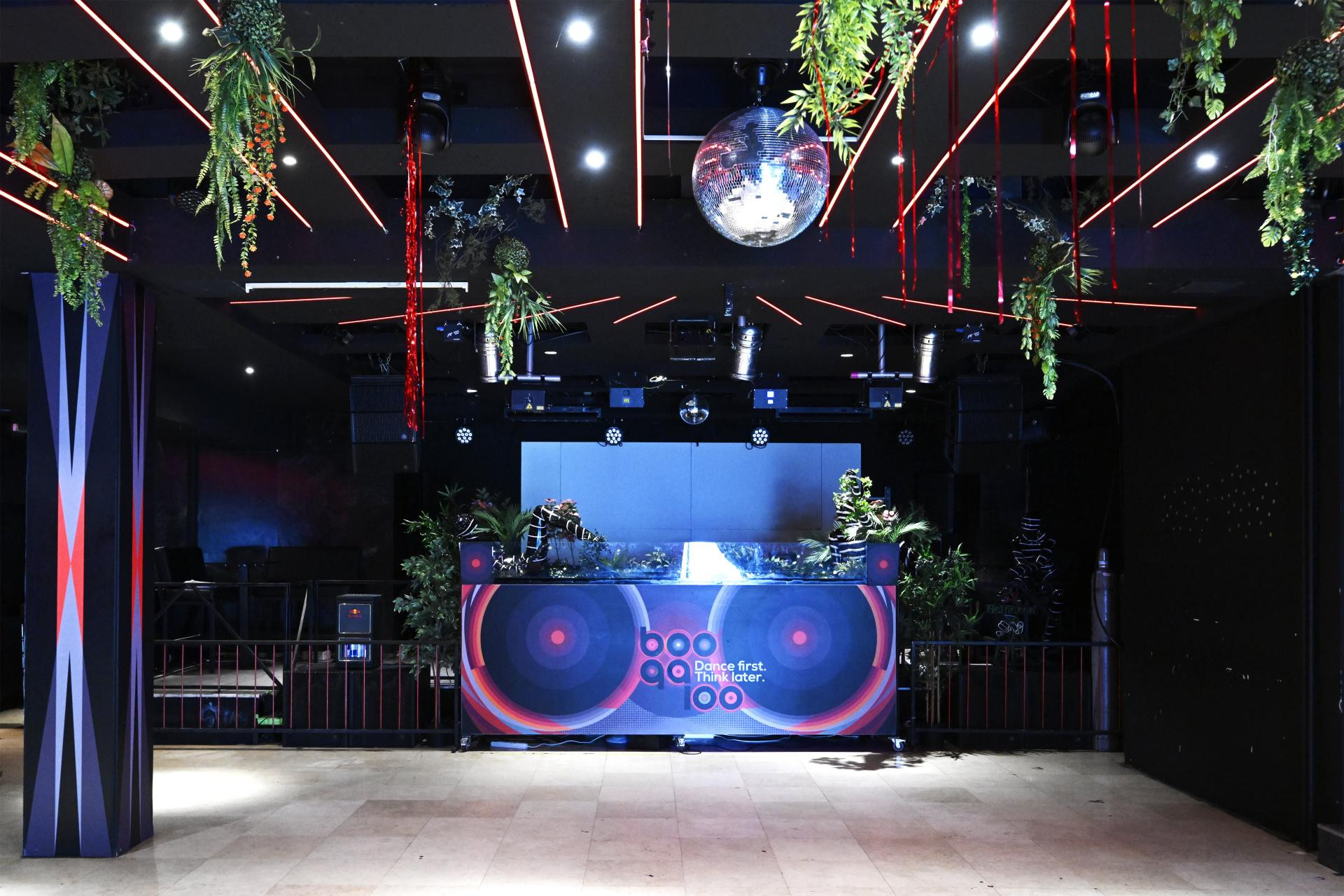Kad govorim o znakovima i simbolima, ovdje su koncentrični krugovi dominirajući elementi - stilizirane gramofonske ploče, CD-i i zvučnici - odnosno simboli glazbe i atmosfere koja se stvara na glazbenim eventima. U kombinaciji s glazbom i klupskom rasvjetom, oni zajedno stvaraju poseban audiovizualni doživljaj.