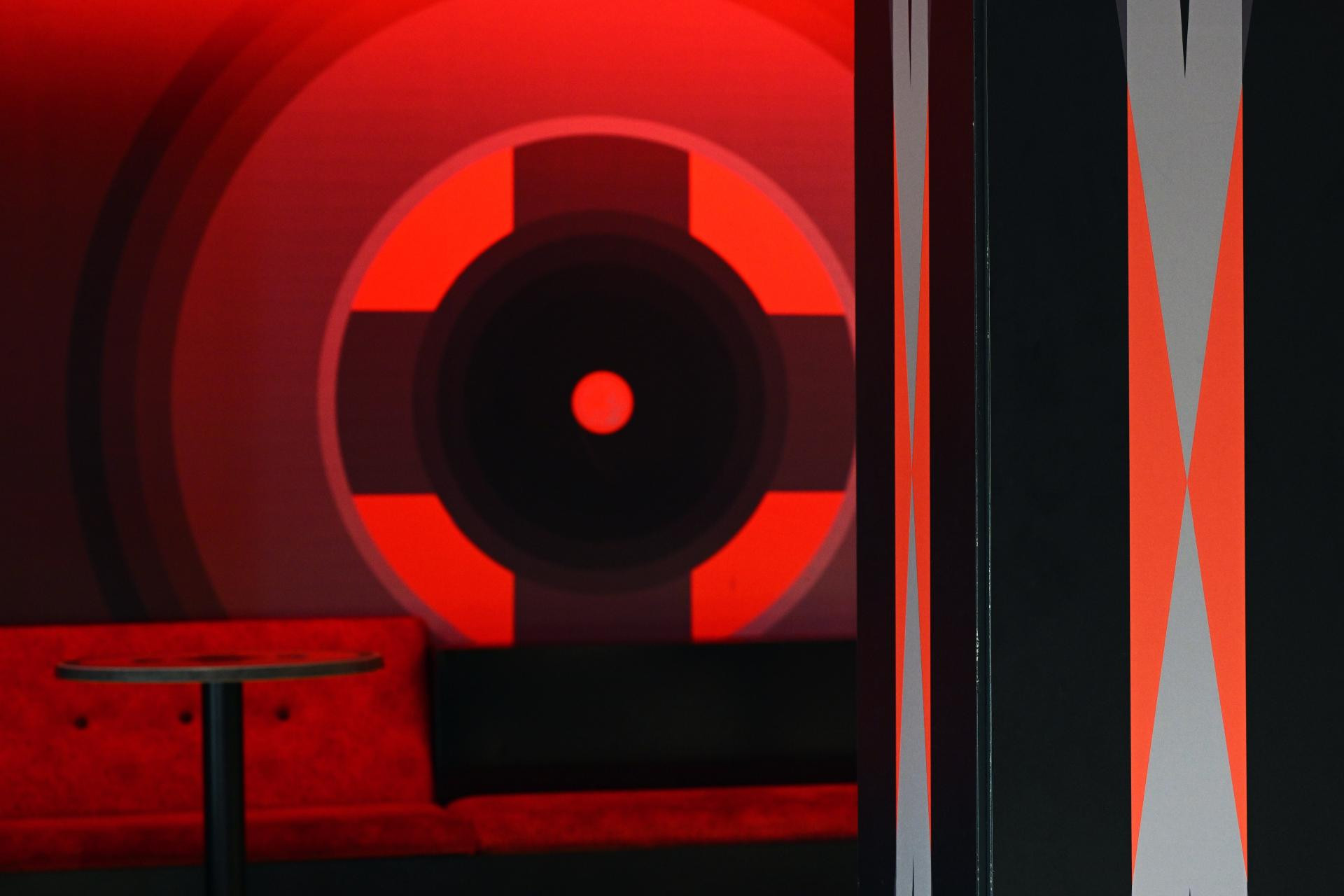 Krug, kao jedan od savršenih geometrijskih oblika koji nema ni početak ni kraj, simbolizira beskraj i vječnost, kretanje i dinamiku - u kontrastu s paralelnim i okomitim geometrijskim elementima. Spektar crvenih i sivih nijansi nije odabran slučajno: razmišljajući o dnevnoj i večernjoj varijanti istog prostora, bilo je važno odabrati boje koje neće stvarati psihodeličan ugođaj, osobito u maloj dvorani gdje fokus treba biti na pozornicu, a ne na zidove.