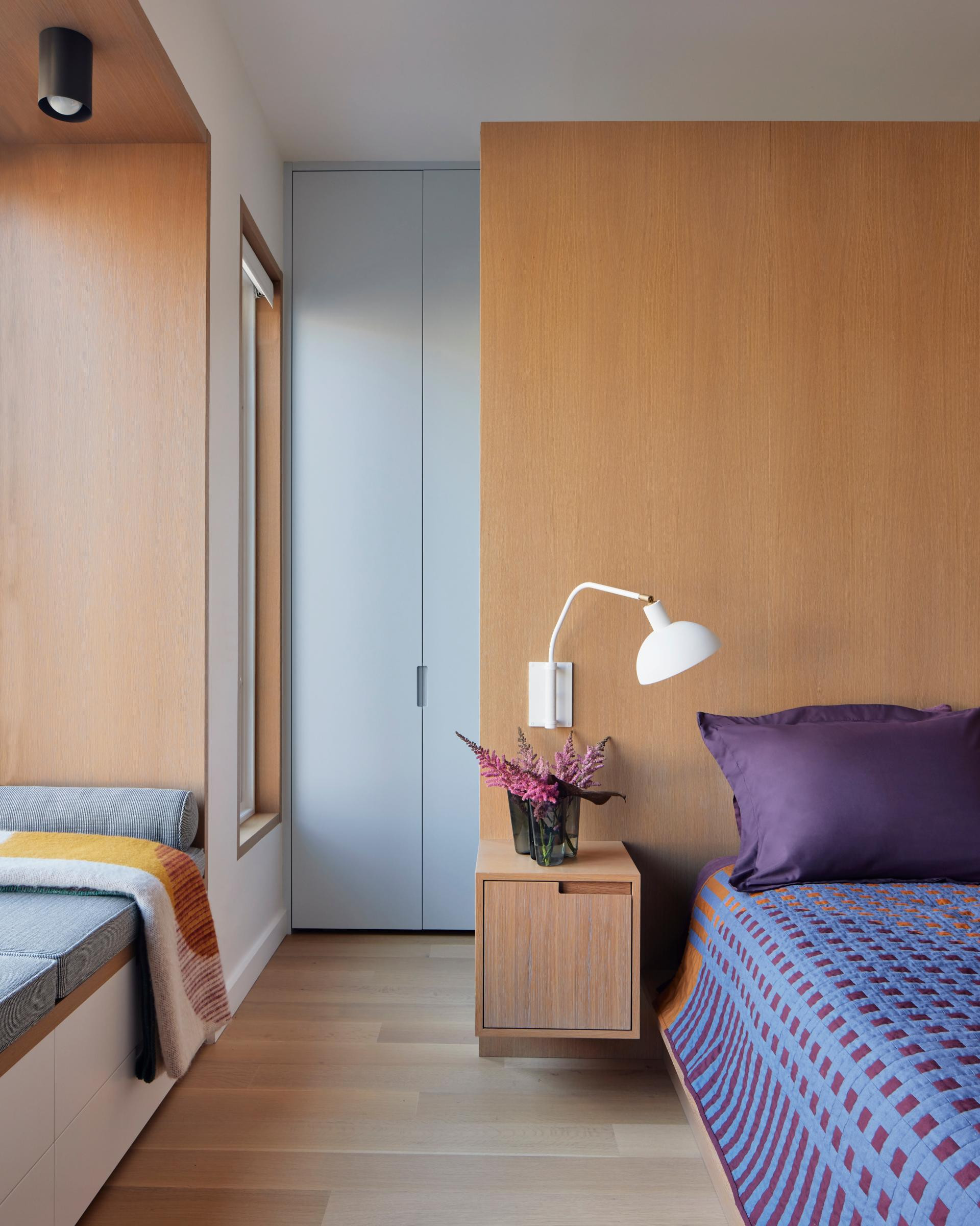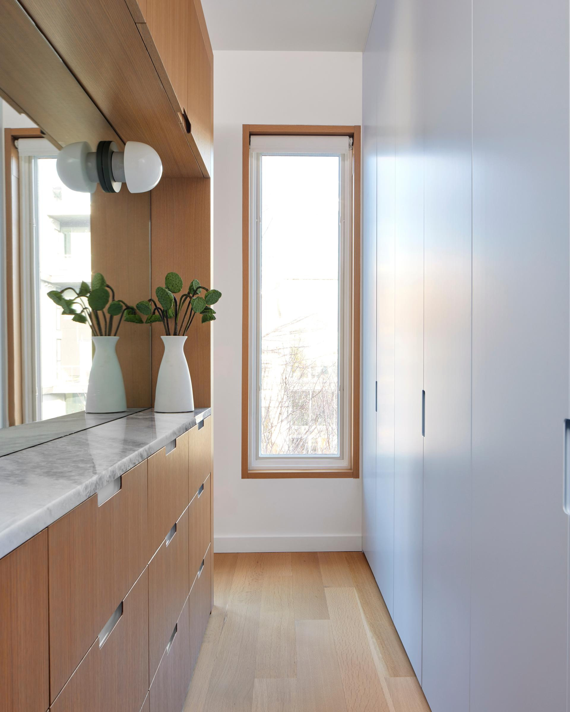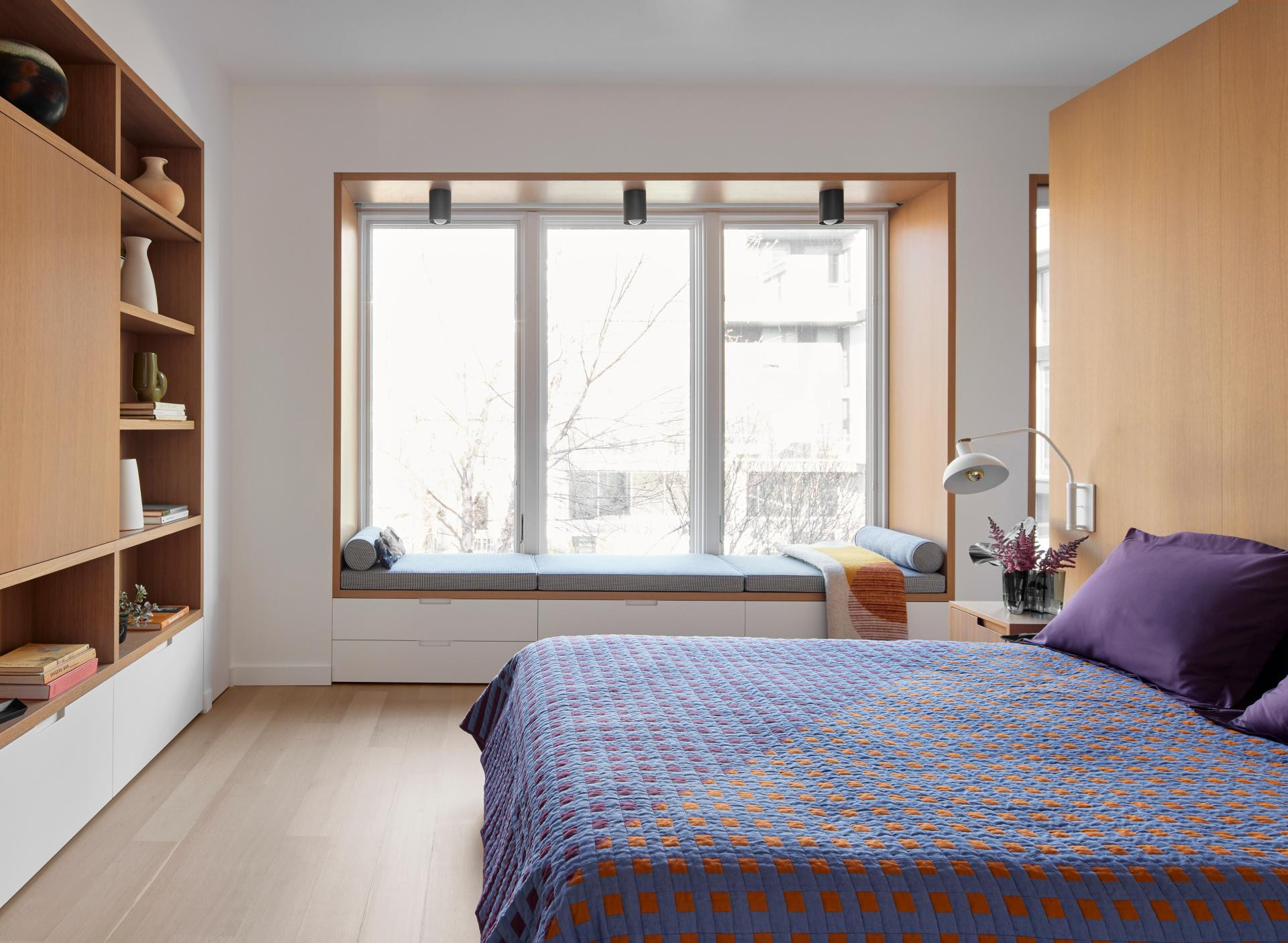 Na katu se nalazi glavna spavaća soba, mirno utočište definirano bijelim hrastom i obojenim ugradbenim elementima. Spavaći i garderobni prostori odvojeni su volumenskim elementom koji istovremeno služi kao uzglavlje kreveta i spremište. Prozor s klupom pruža pogled na dvorište, dok kupaonica prati istu sofisticiranu paletu boja s krovnim prozorom koji propušta prirodnu svjetlost.