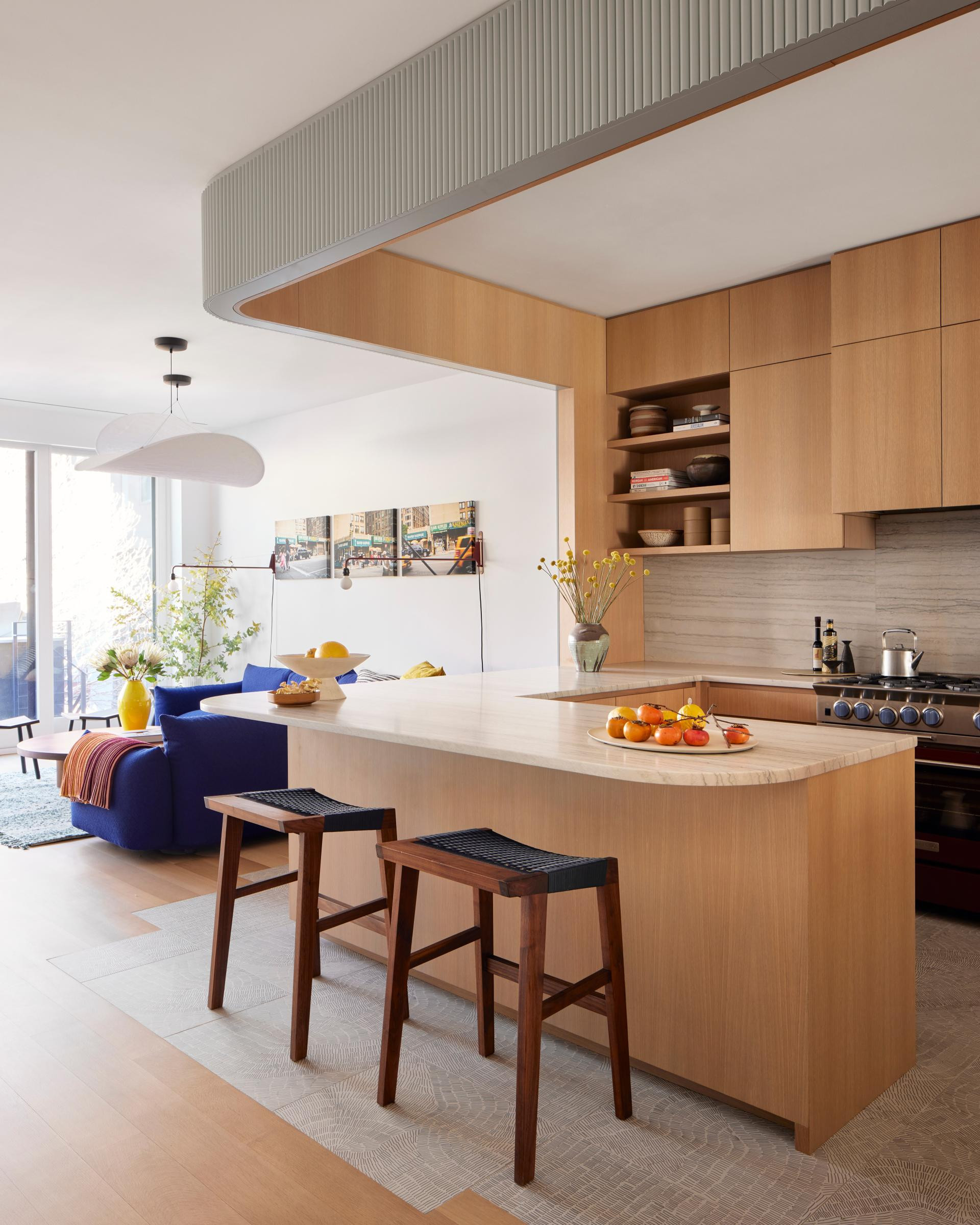 Središnji dio doma čini kuhinja obložena teksturiranim drvom, u plavo-sivoj nijansi, s otvorima koji nude pogled u blagovaonicu i dnevni boravak. Ormarići od bijelog hrasta i keramičke pločice s uzorkom stvaraju sofisticirani kontrast, dok spušteni luk s ugradbenom rasvjetom definira granice radnog prostora.