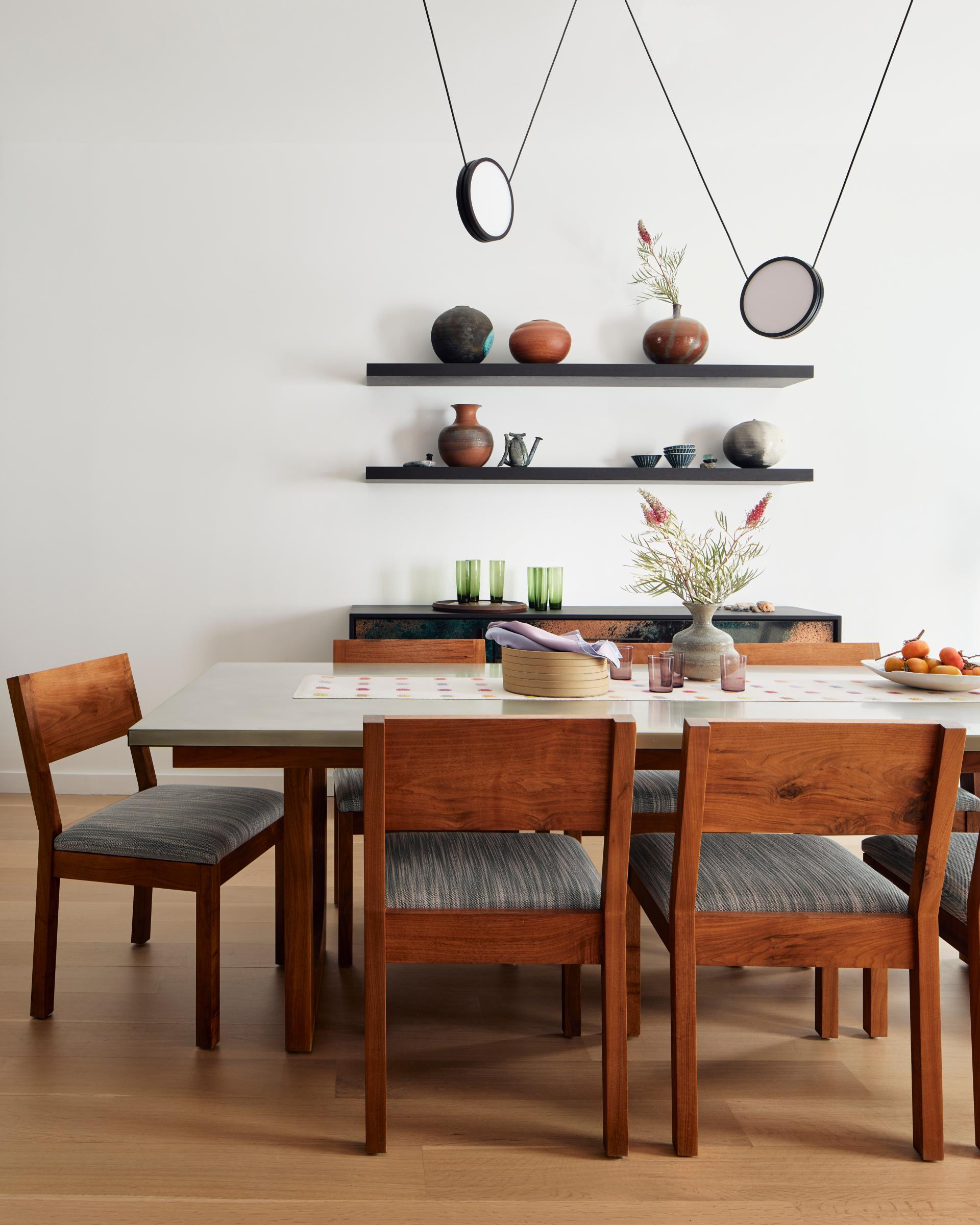 Iako je cilj bio stvoriti otvoreni plan, arhitekti su željeli zadržati osjećaj zasebnih zona. Rješenje je bilo oblikovati poluzatvorene volumene koji prostor definiraju kroz materijale, rasvjetu i boje. Tako, primjerice, predvorje obojeno u plavo-sive tonove “pretvara se” u crveni volumen koji ga odvaja od blagovaonice. Luster Anony vijuga iznad stola, naglašavajući prikaz keramičkih posuda koje su osobni pečat vlasnika doma.