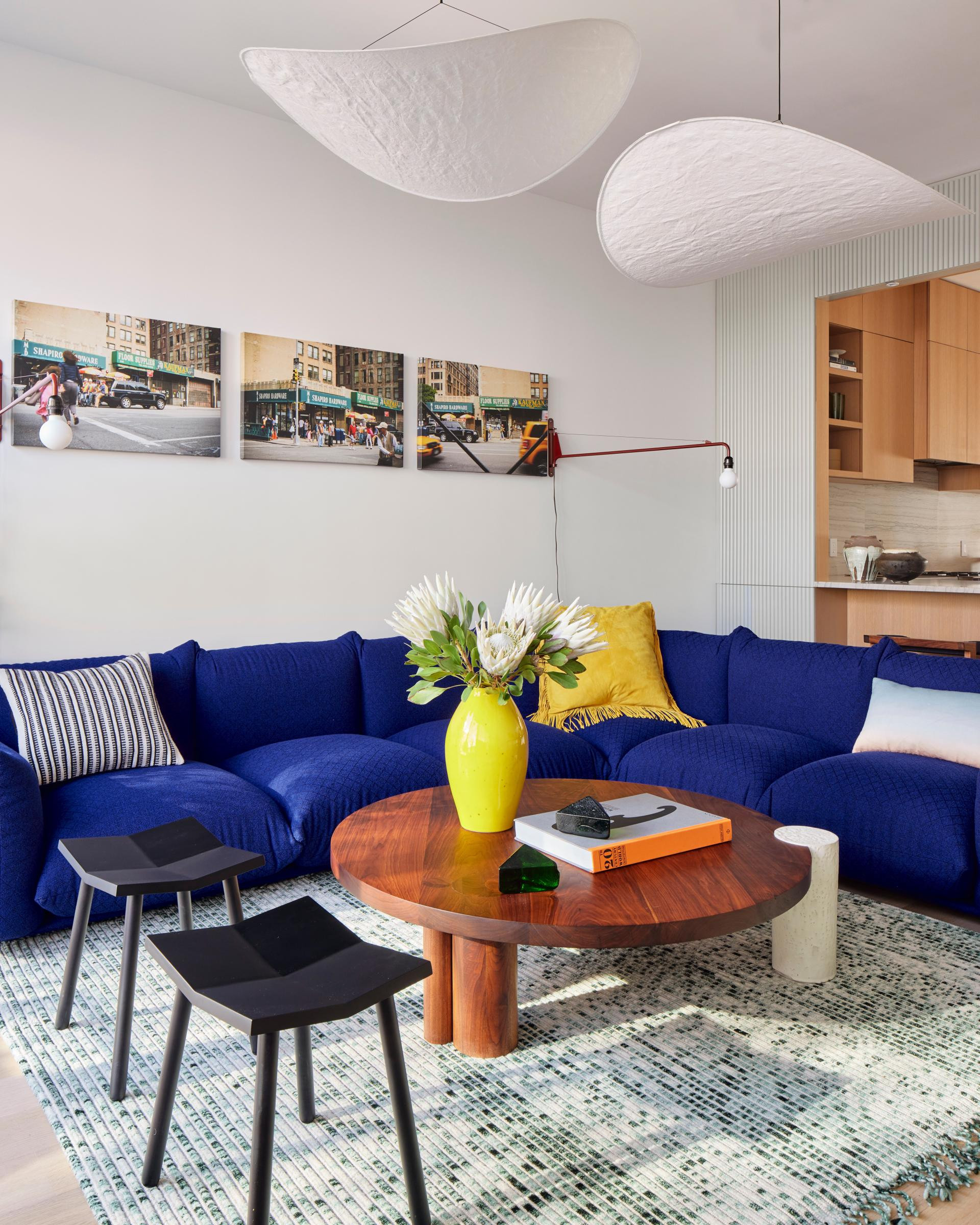 Dnevni boravak odiše prostranošću i svjetlom zahvaljujući staklu od poda do stropa koje gleda na dvorište. Kutna garnitura Marenco u plavoj kvadrat vuni, stol za kavu Hinterland Design i tepih Philippe Malouin stvaraju elegantan, ali ugodan ambijent za opuštanje.