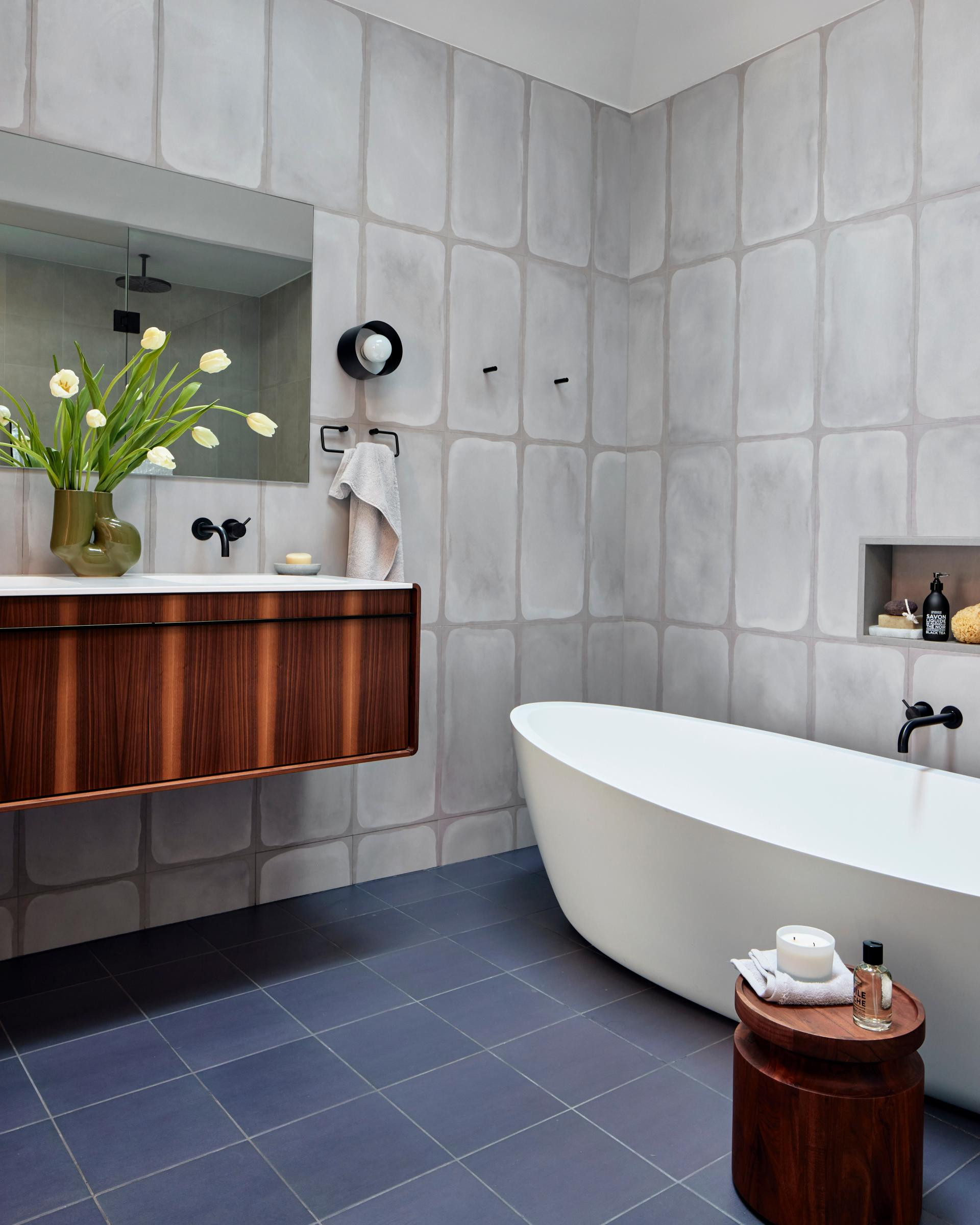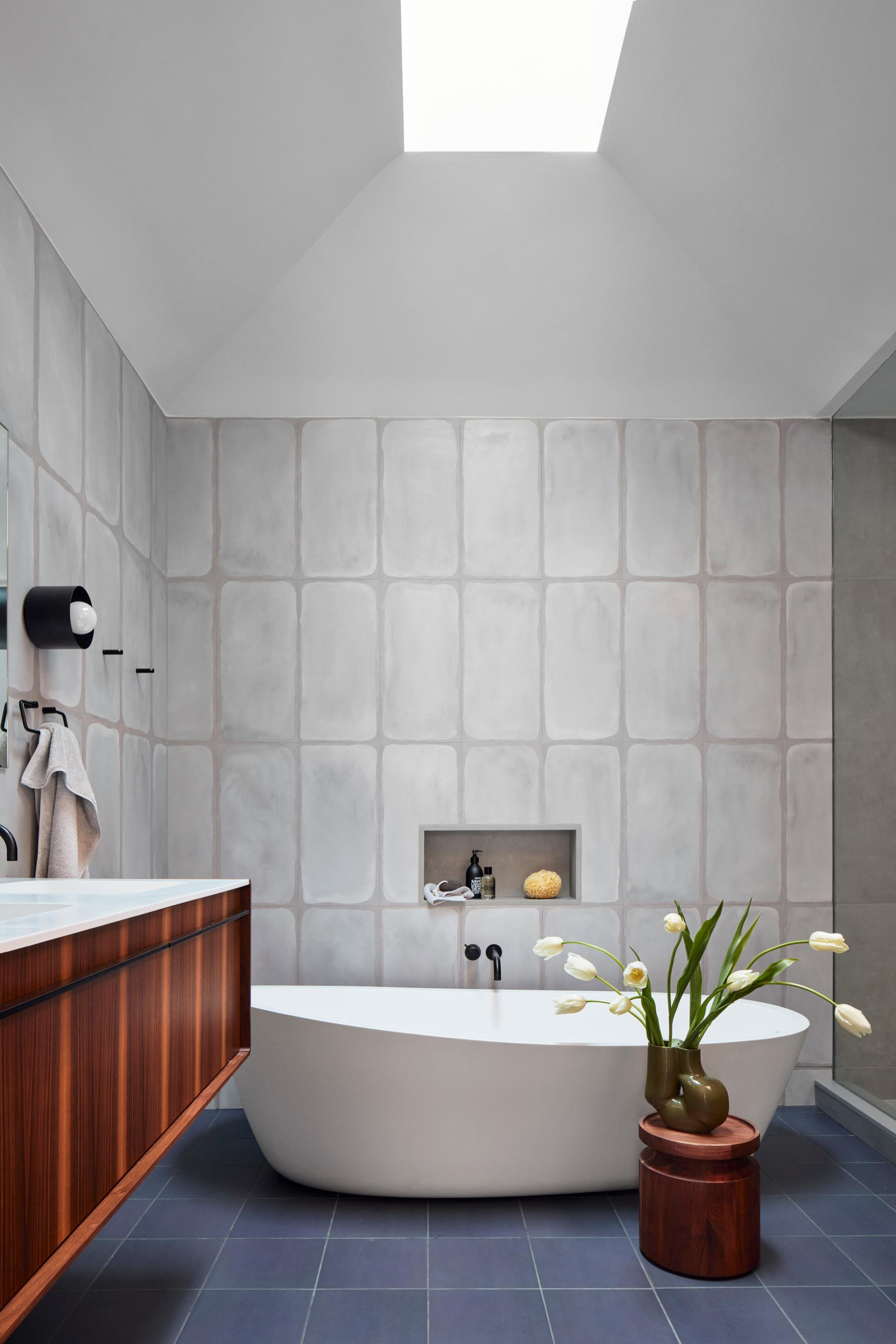 Donja razina kuće preuređena je kako bi pružila dodatni dnevni prostor odvojen od radnog kutka kliznim staklenim panelima od poda do stropa. Porculanske pločice ne samo da unose eleganciju, već i praktičnost, osobito u području podložnom poplavama.