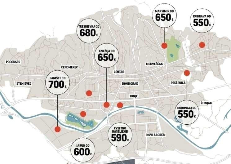 Najtraženiji su kvartovi već tradicionalno oni u blizini fakulteta, a prema podacima agencije Euro-interijeri za najam stanova od 50-ak kvadrata na Borongaju i u Dubravi traži se od 550 kvadrata mjesečno naviše, u Cvjetnom naselju od 590 eura, na Jarunu od 600 eura, na Maksimiru i Knežiji od 650 eura, na Trešnjevci od 680 eura, na Laništu od 700 eura mjesečno...
