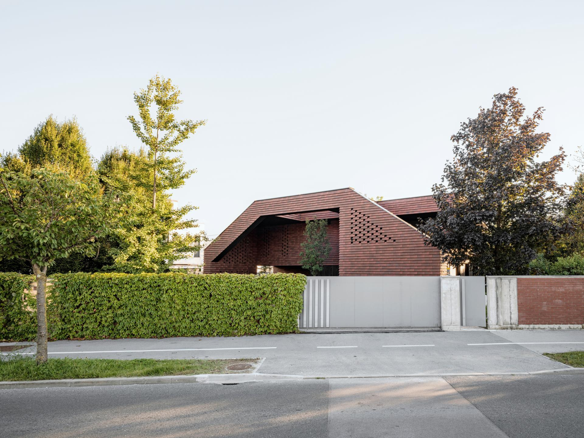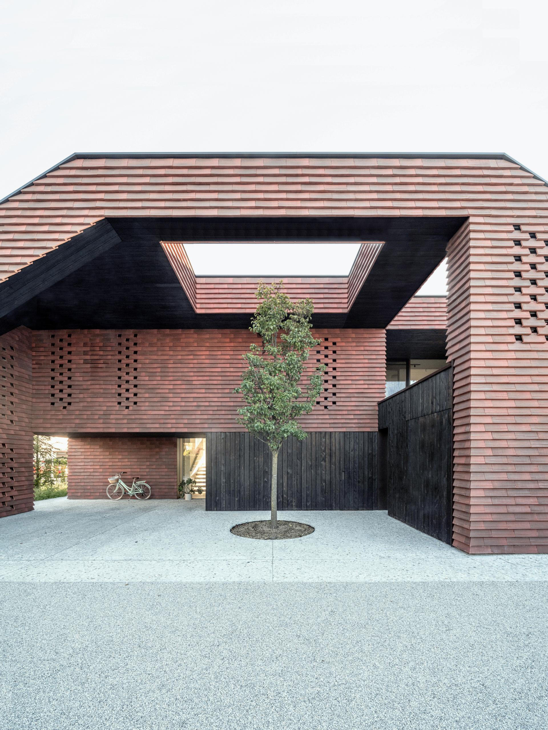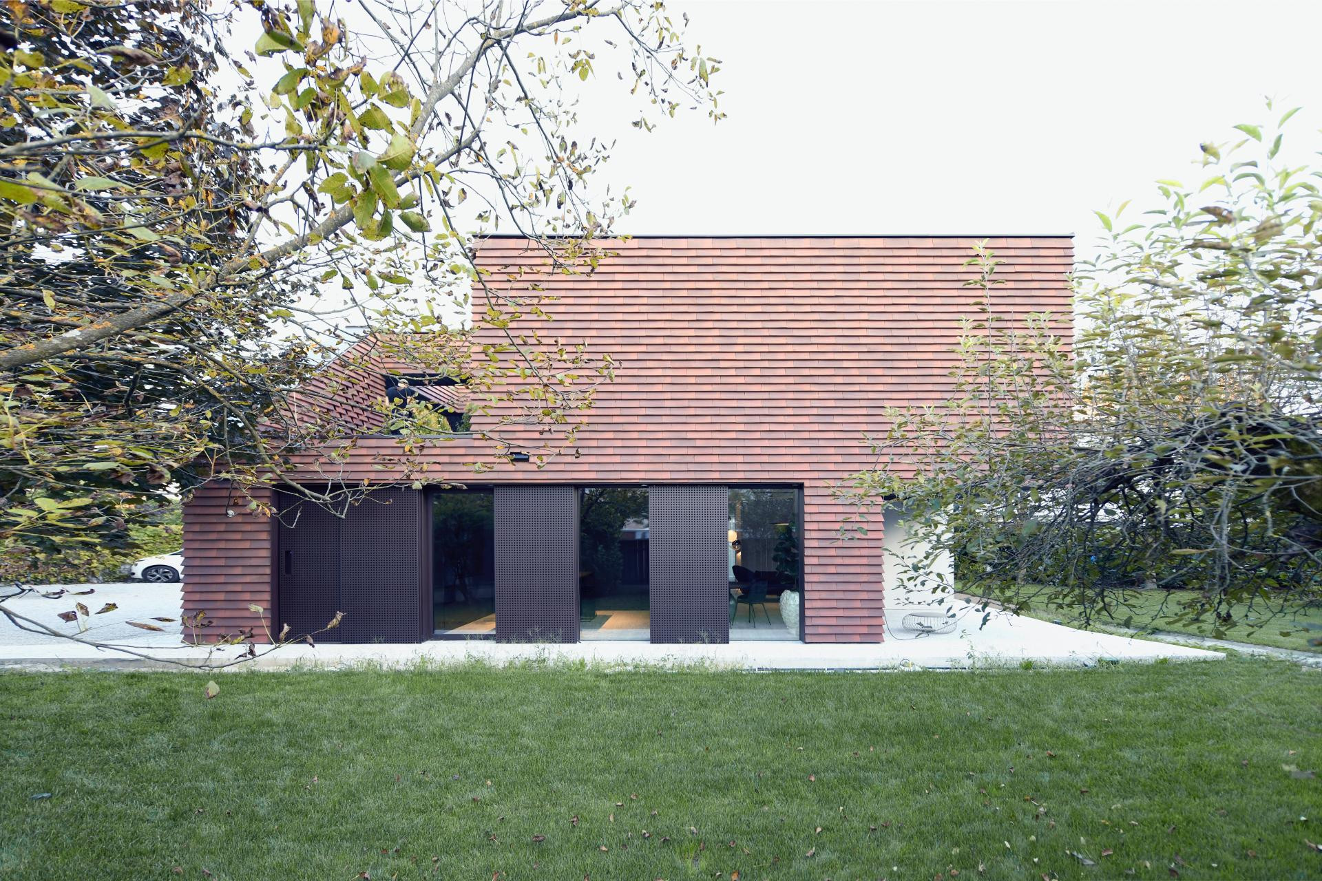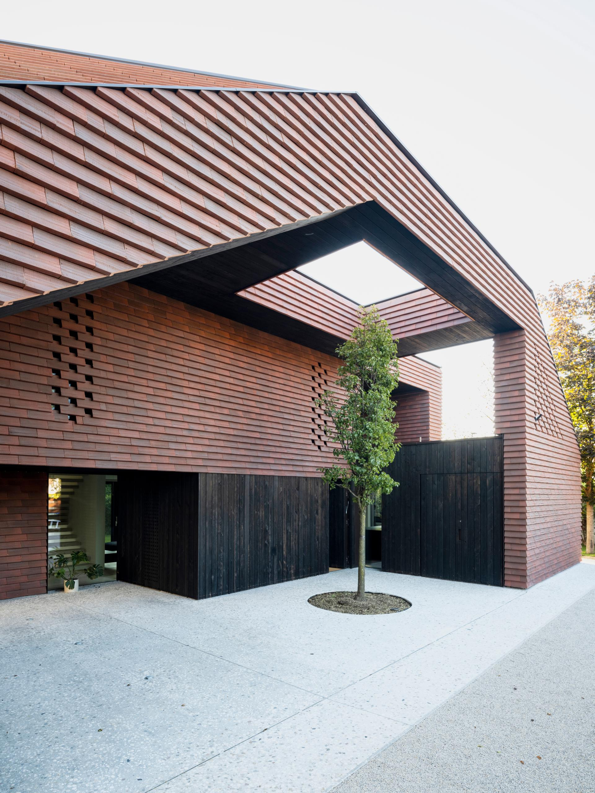 Fasada je obložena crvenim ciglenim pločicama – tradicionalnim materijalom koji se ovdje koristi na potpuno nov način. Umjesto da pokrivaju krov, pločice ovijaju cijelu kuću, stvarajući suvremenu interpretaciju klasične ljubljanske arhitekture.