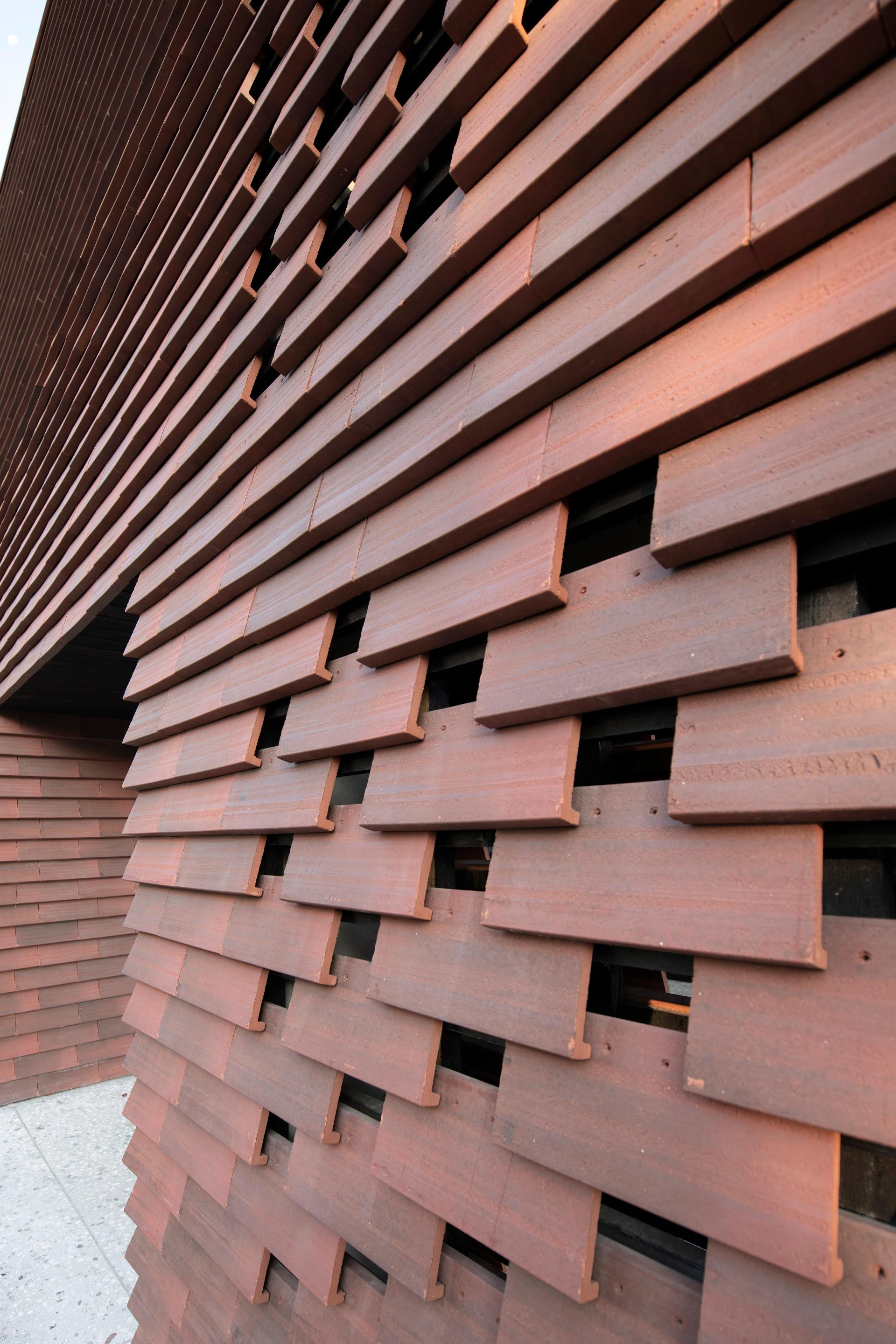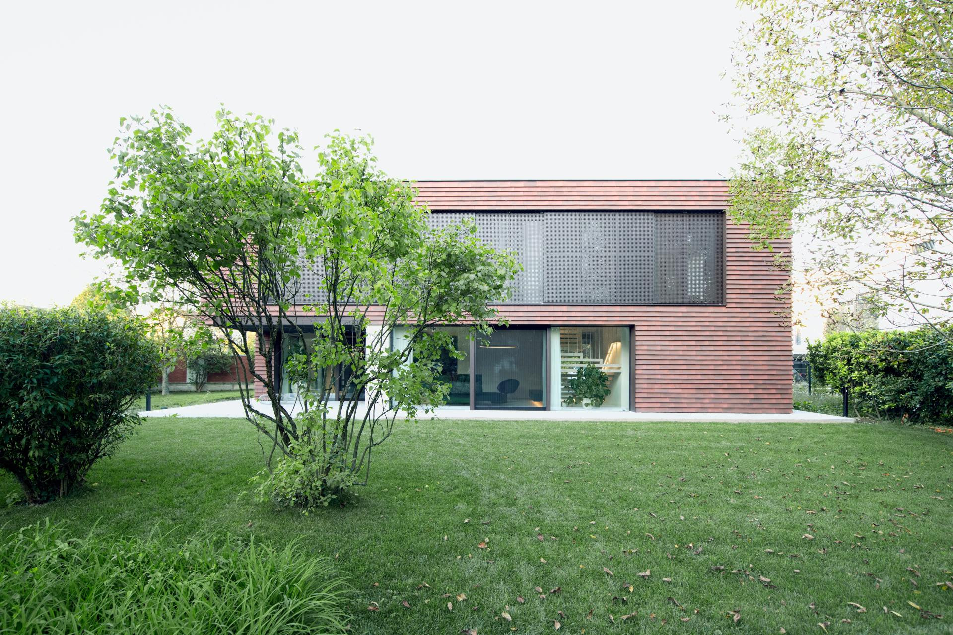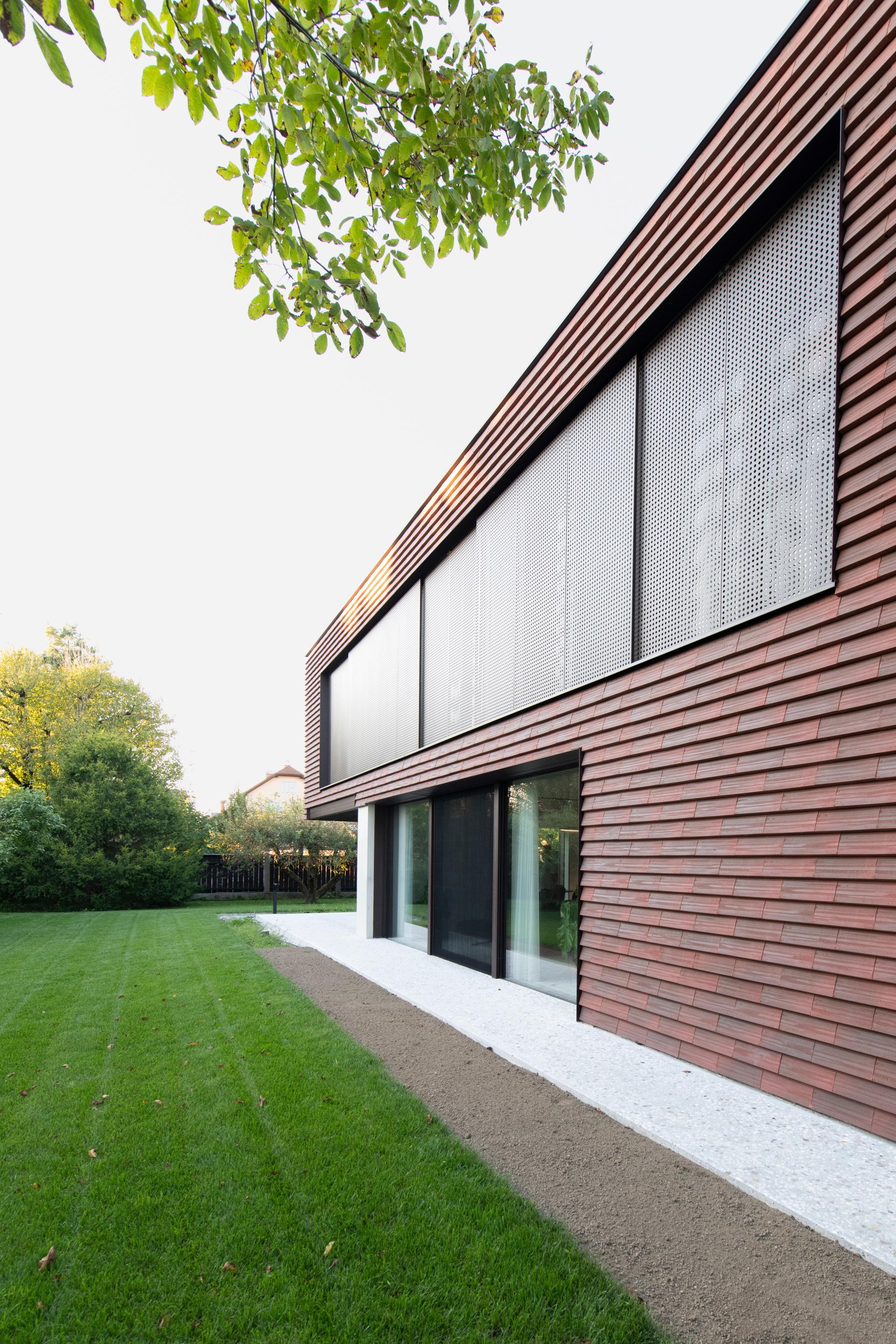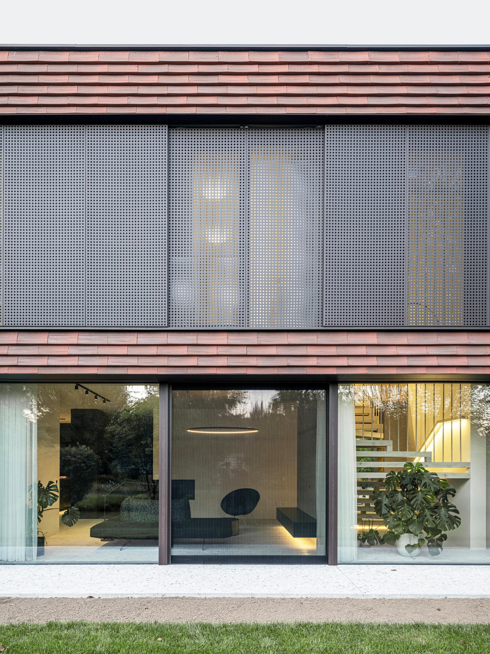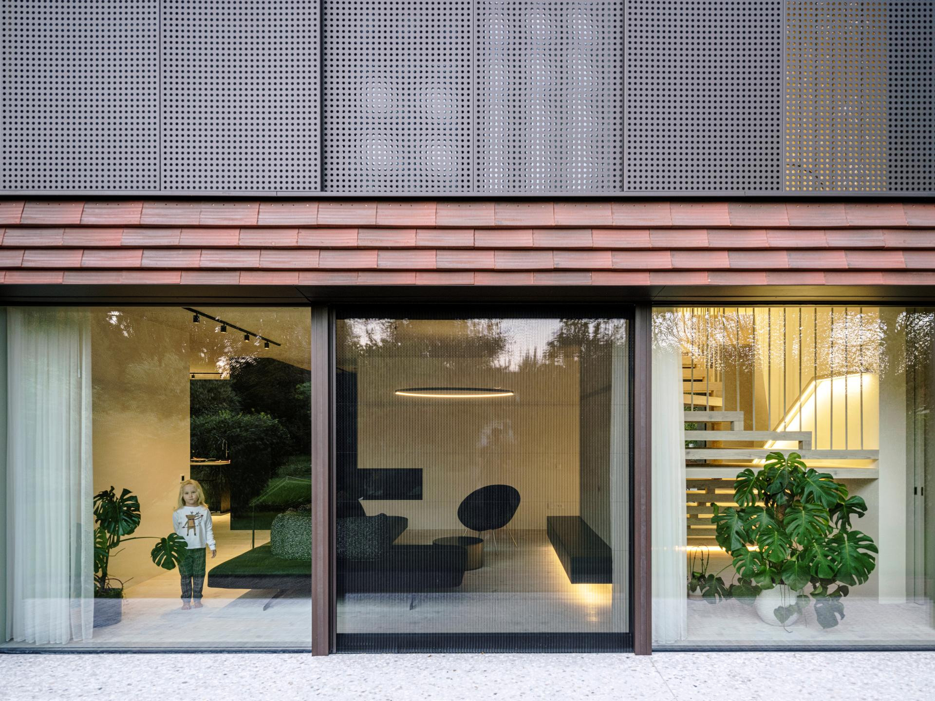 Fasada je obložena crvenim ciglenim pločicama – tradicionalnim materijalom koji se ovdje koristi na potpuno nov način. Umjesto da pokrivaju krov, pločice ovijaju cijelu kuću, stvarajući suvremenu interpretaciju klasične ljubljanske arhitekture.