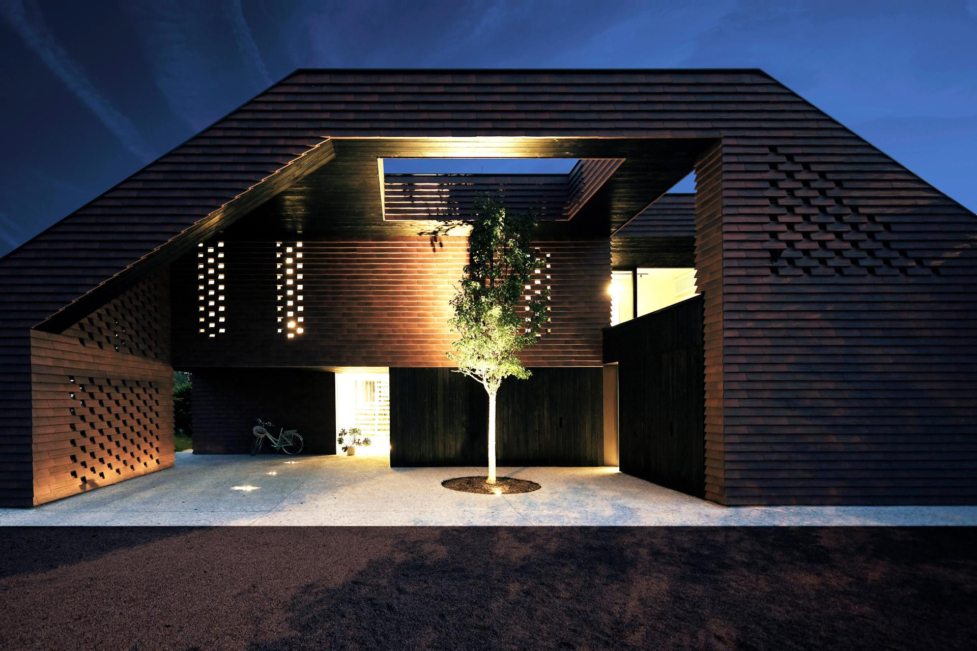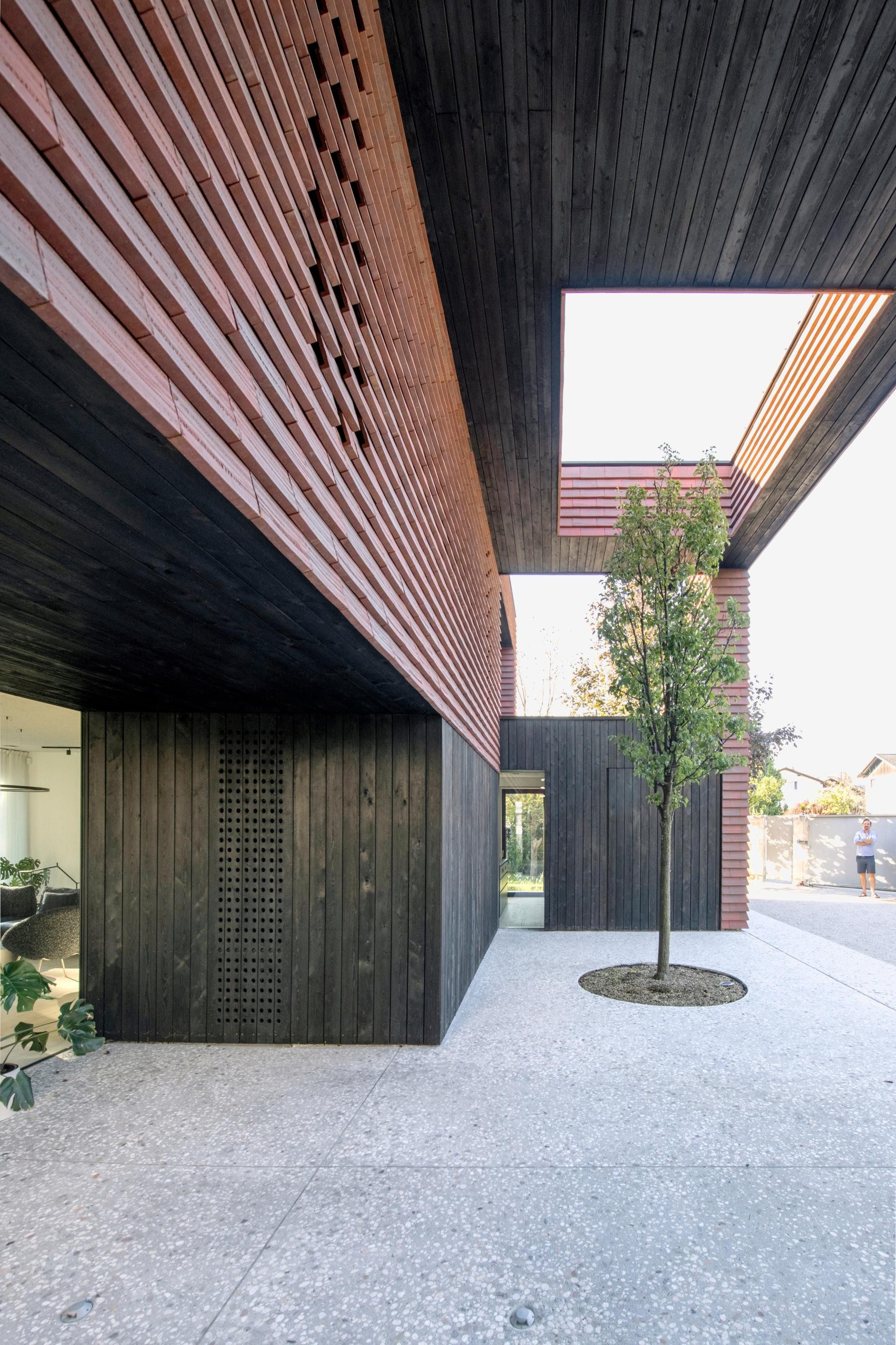 Poseban detalj skriva se iznad trijema: arhitekti su u krovu ostavili otvor kroz koji raste staro stablo, pa se čitav ulaz pretvara u scenu u kojoj arhitektura i priroda skladno dišu zajedno.