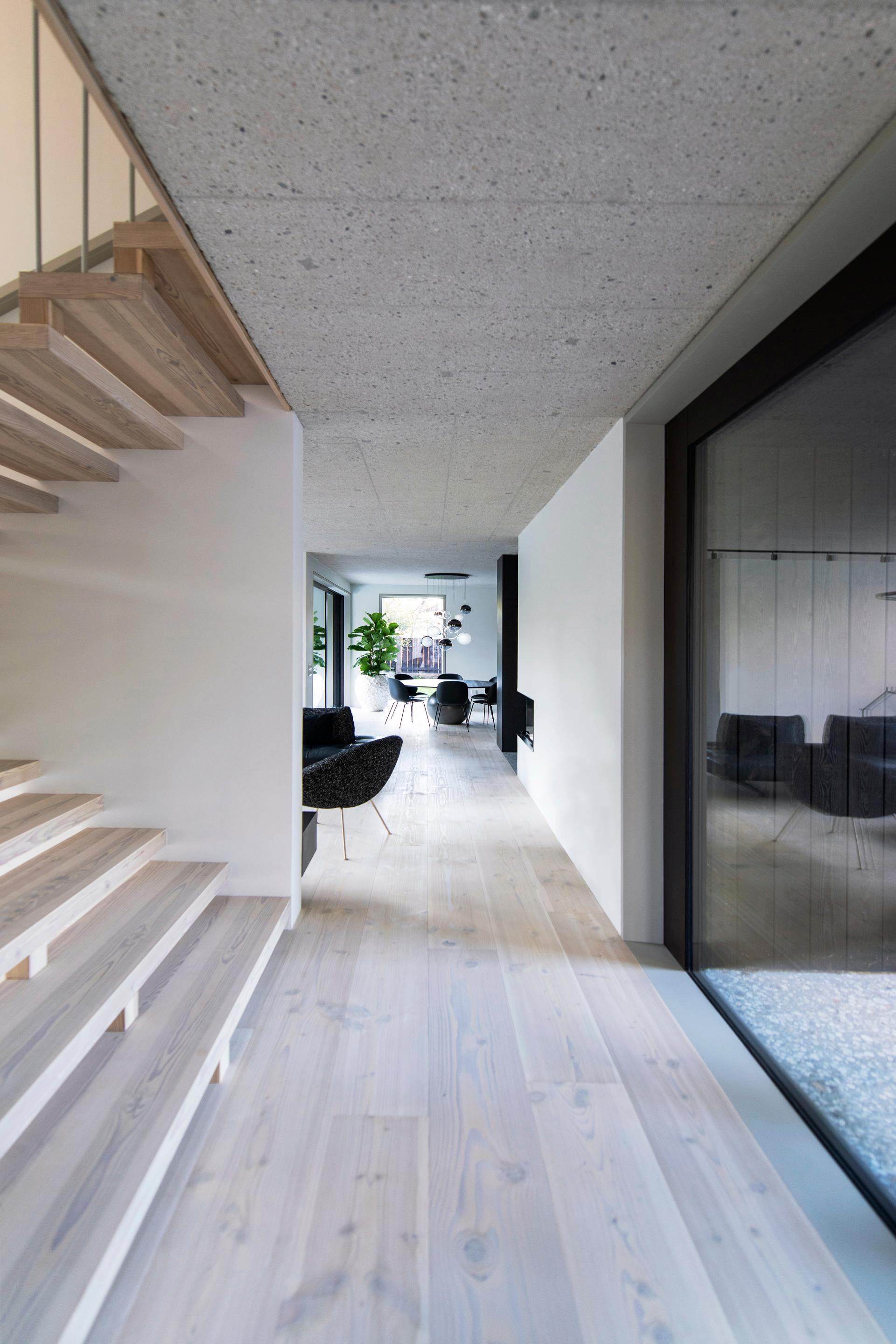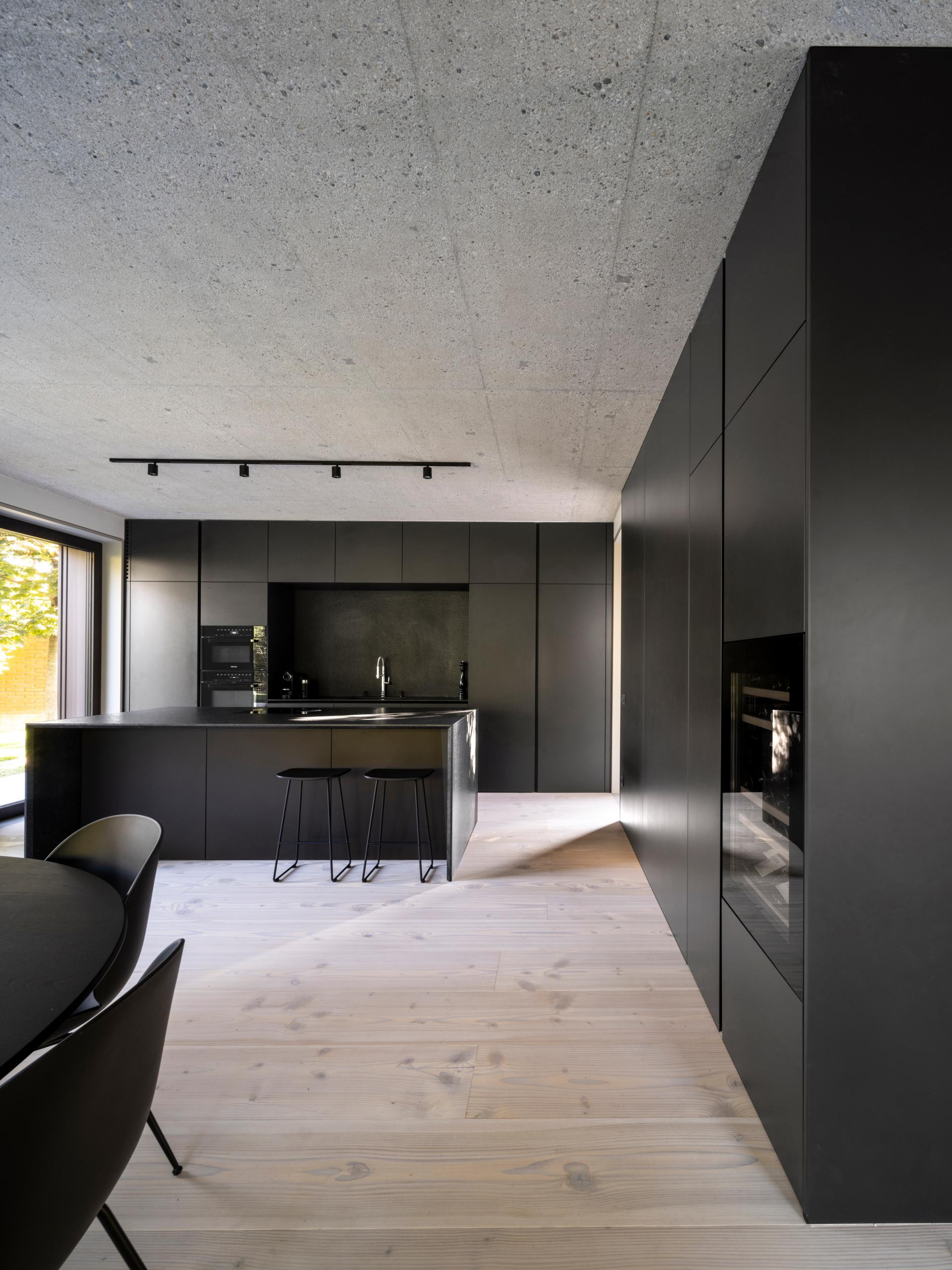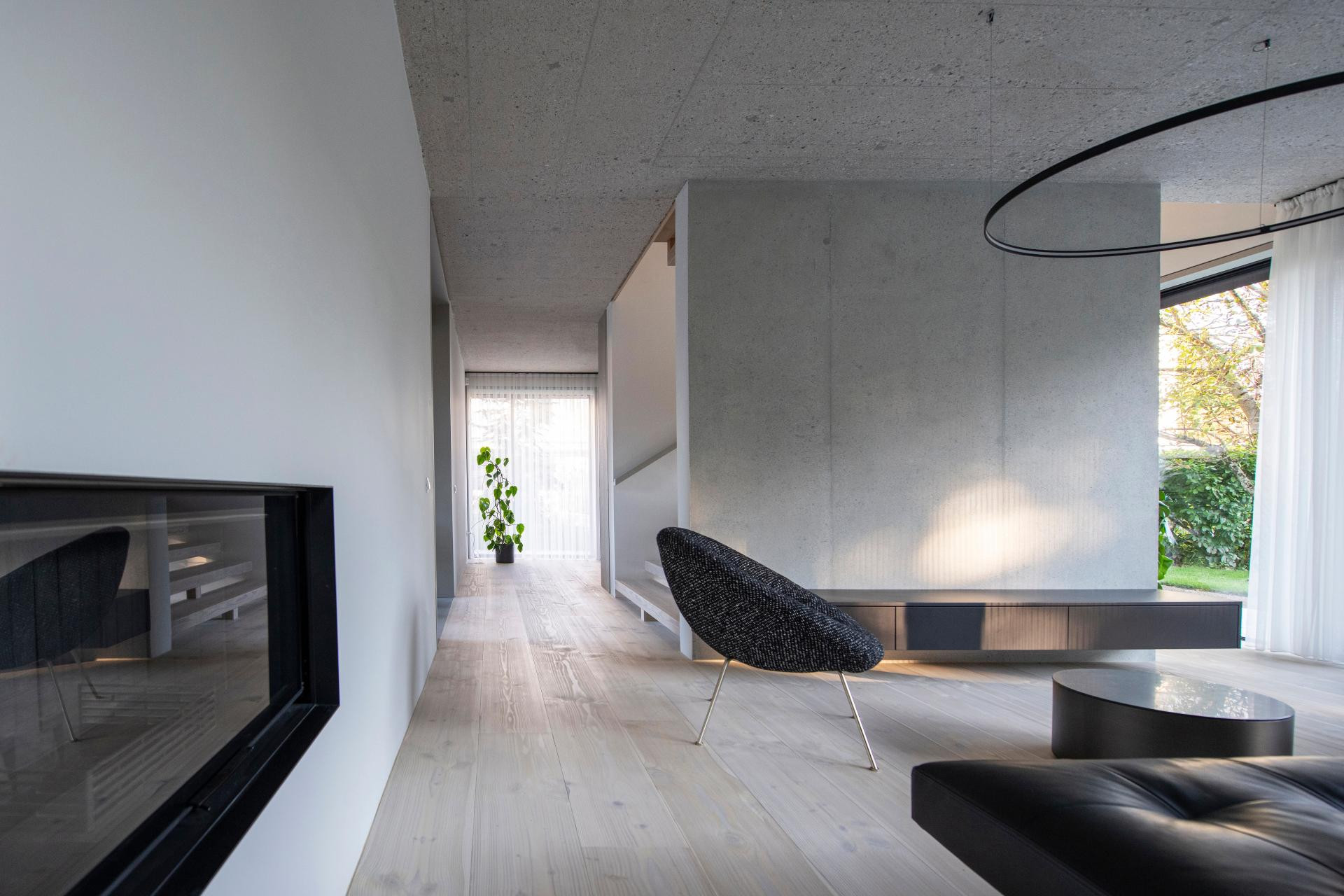 Unutrašnjost odiše suzdržanom elegancijom: sirovi beton i svijetlo drvo stvaraju nježan kontrast, dok prirodna svjetlost i pogled na vrt unose osjećaj topline i lakoće.