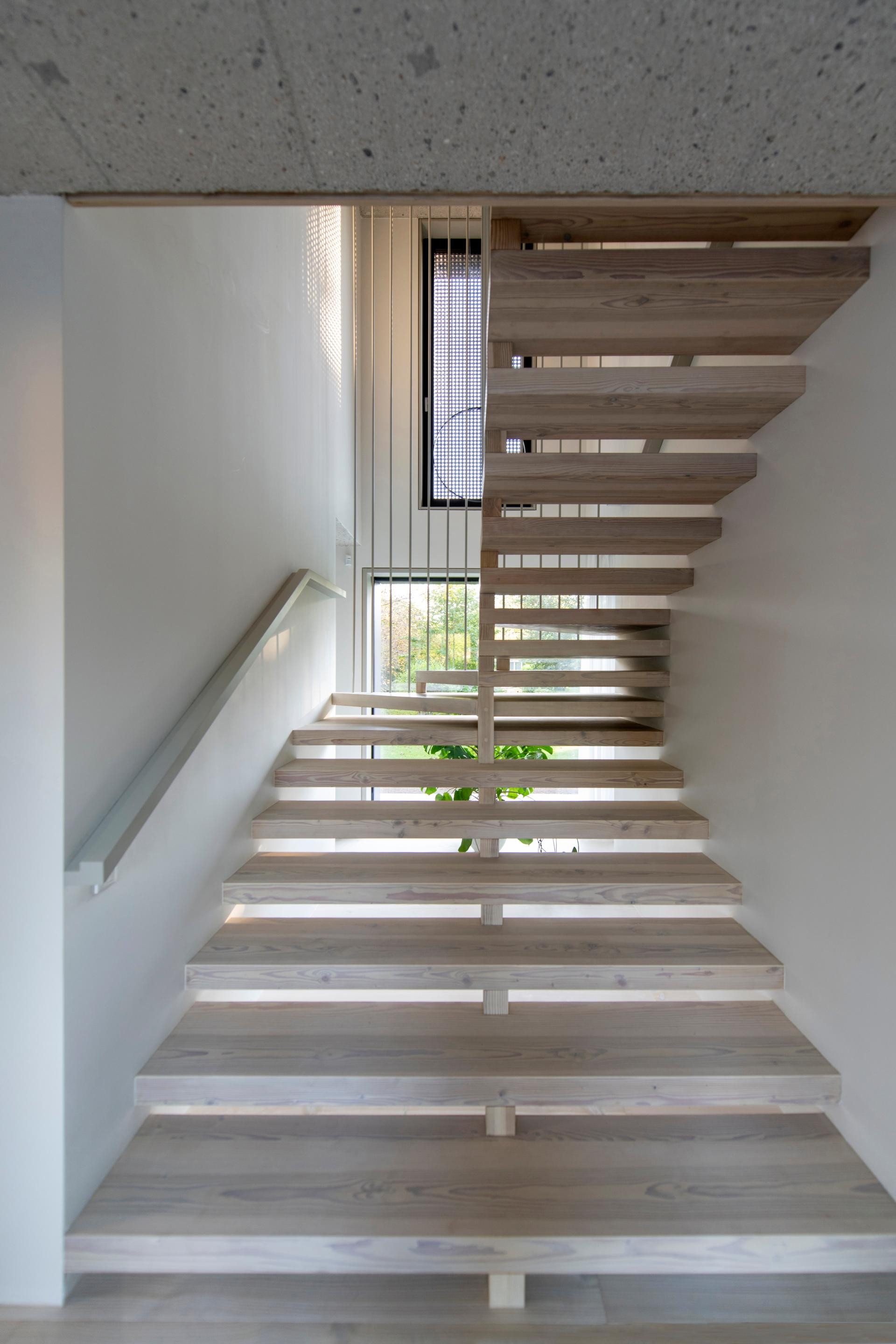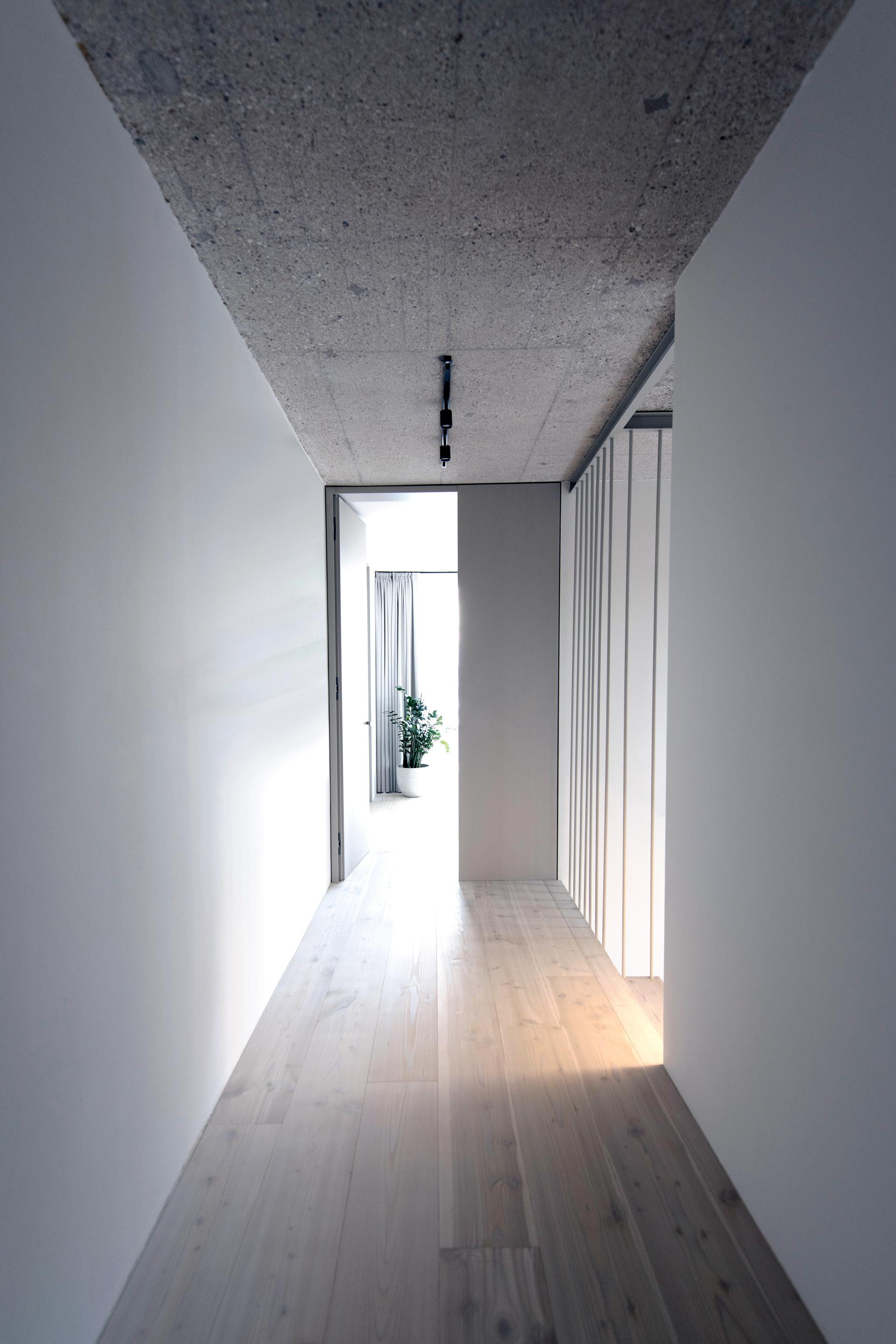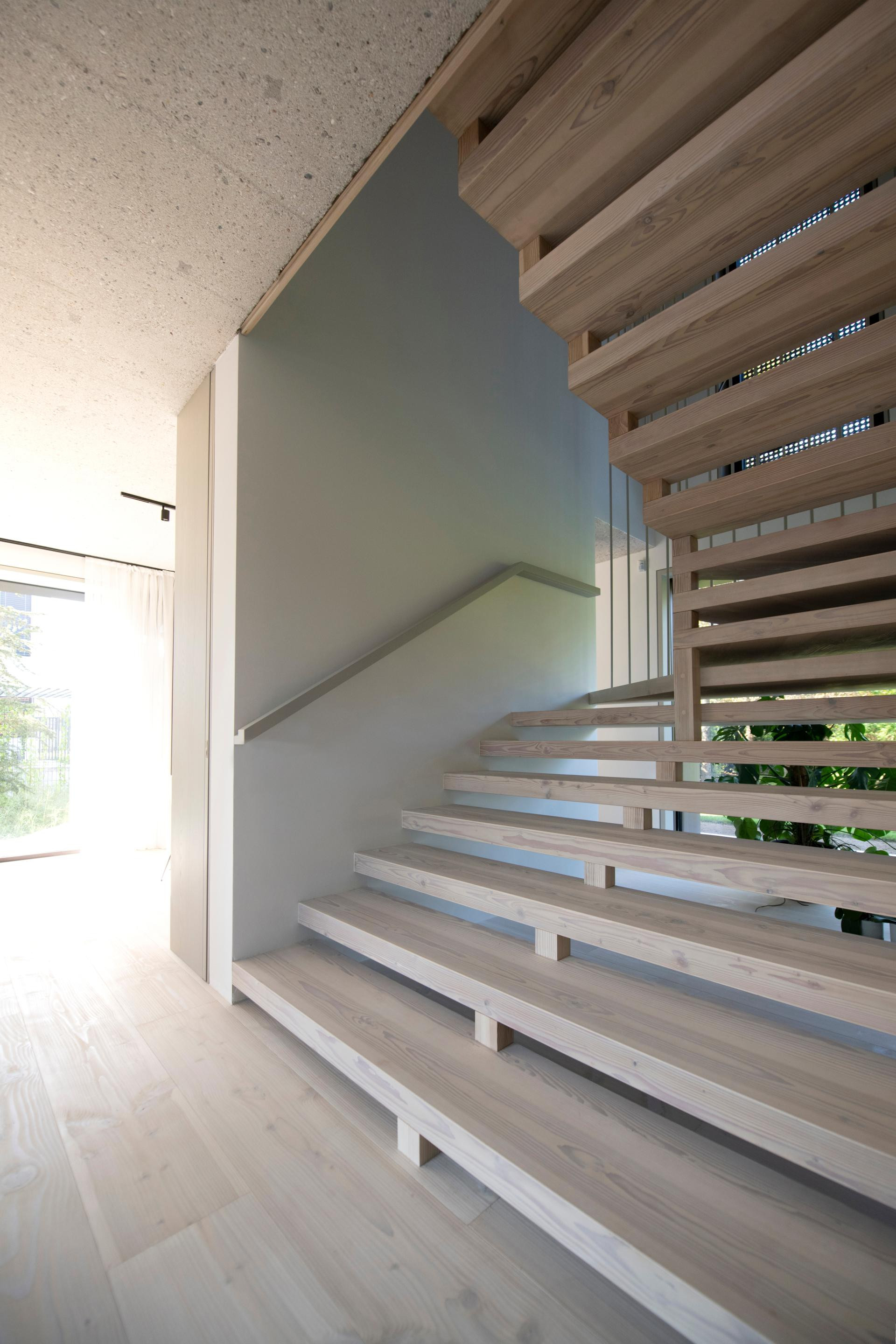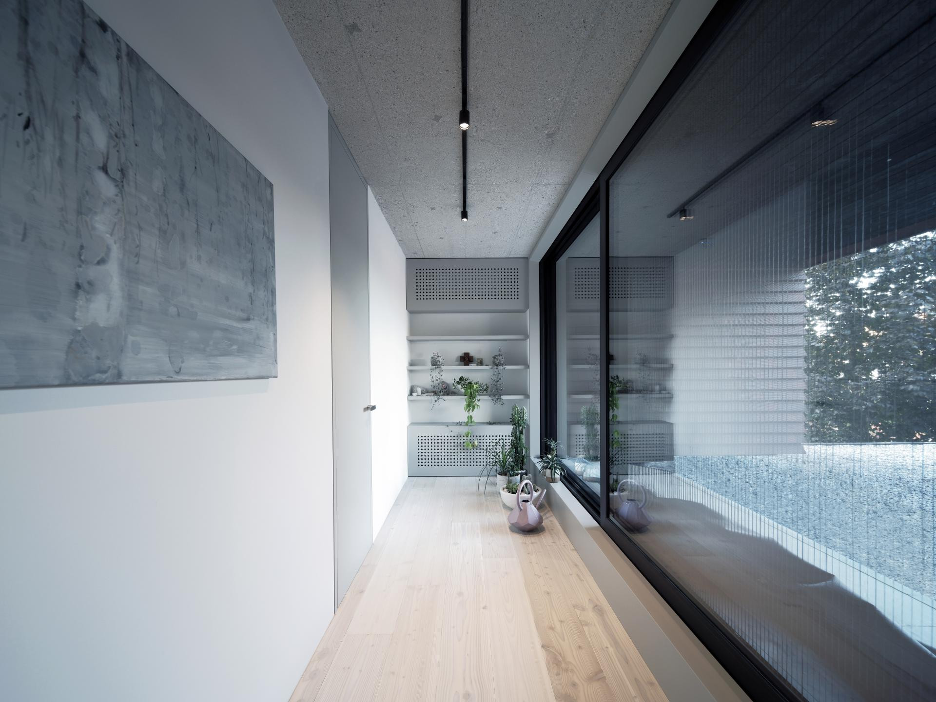 Unutrašnjost odiše suzdržanom elegancijom: sirovi beton i svijetlo drvo stvaraju nježan kontrast, dok prirodna svjetlost i pogled na vrt unose osjećaj topline i lakoće.