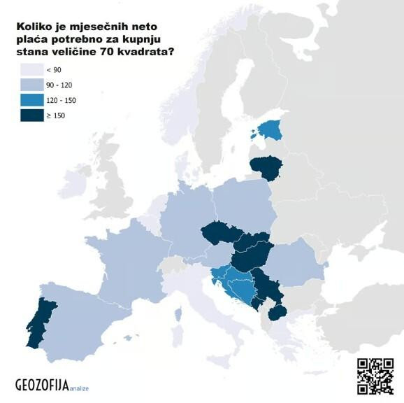 Prema njegovoj analizi, situacija je najgora u Portugalu, gdje je potrebno 207 prosječnih mjesečnih plaća za stan od 70 kvadrata, a uz Dansku, na vrh su se smjestile još i Grčka i Irska, zemlje u kojima je za istu nekretninu potrebno izdvojiti manje od 70 prosječnih mjesečnih plaća.