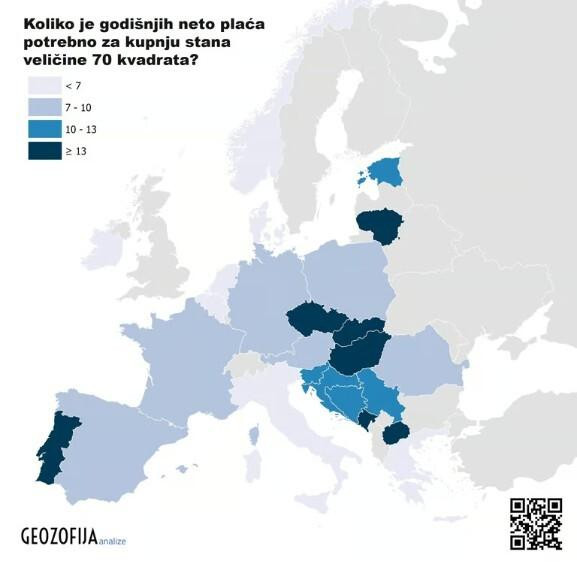 - Posljednja analiza donosi podatak o broju prosječnih plaća potrebnih za kupnju stana prosječne cijene, veličine 70 kvadrata. Korišteni su podaci Eurostata i Deloittea te platforme Numbeo - pojašnjava nam svoj pristup. Riječ je, kako dodaje, o prikazu teorijske priuštivosti, koja zanemaruje druge pokazatelje, ali nam može dati okvirni uvid u temu razlika u priuštivosti kupnje stana među različitim državama Europe te čiji rezultati otkrivaju golema odstupanja.