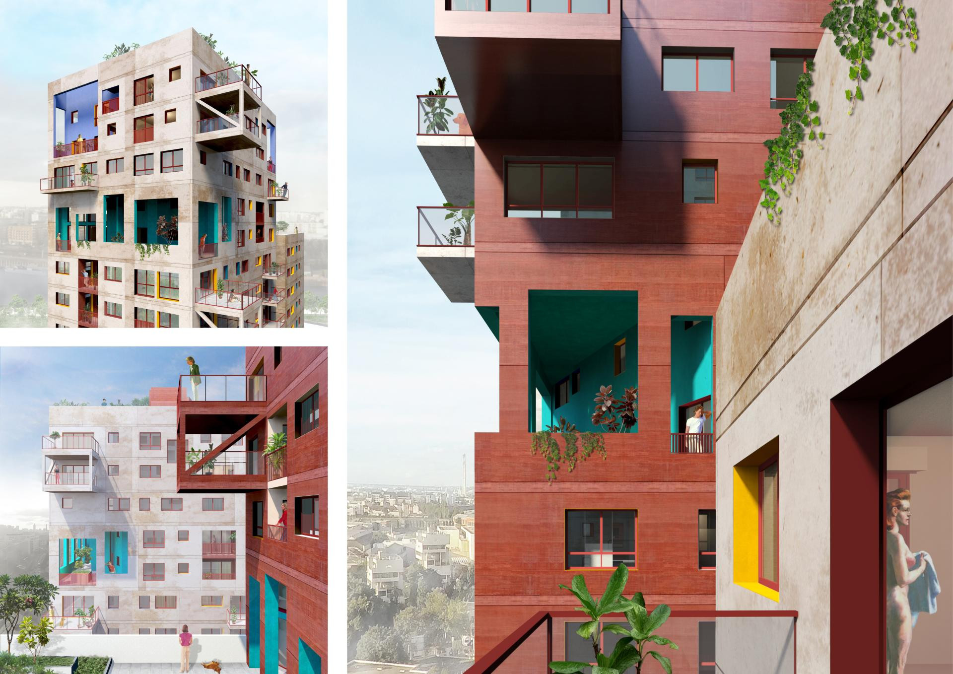 Pročelja prate logiku stanovanja. Prozori, lođe i balkoni raspoređeni su prema potrebama stanara, pa ono što izgleda kao "nered" zapravo postaje arhitektonski izraz života. Glavna paleta boja sastoji se od nijanse grubog betona i crvene, a referira se na arhitektonsku povijest Ivryja.