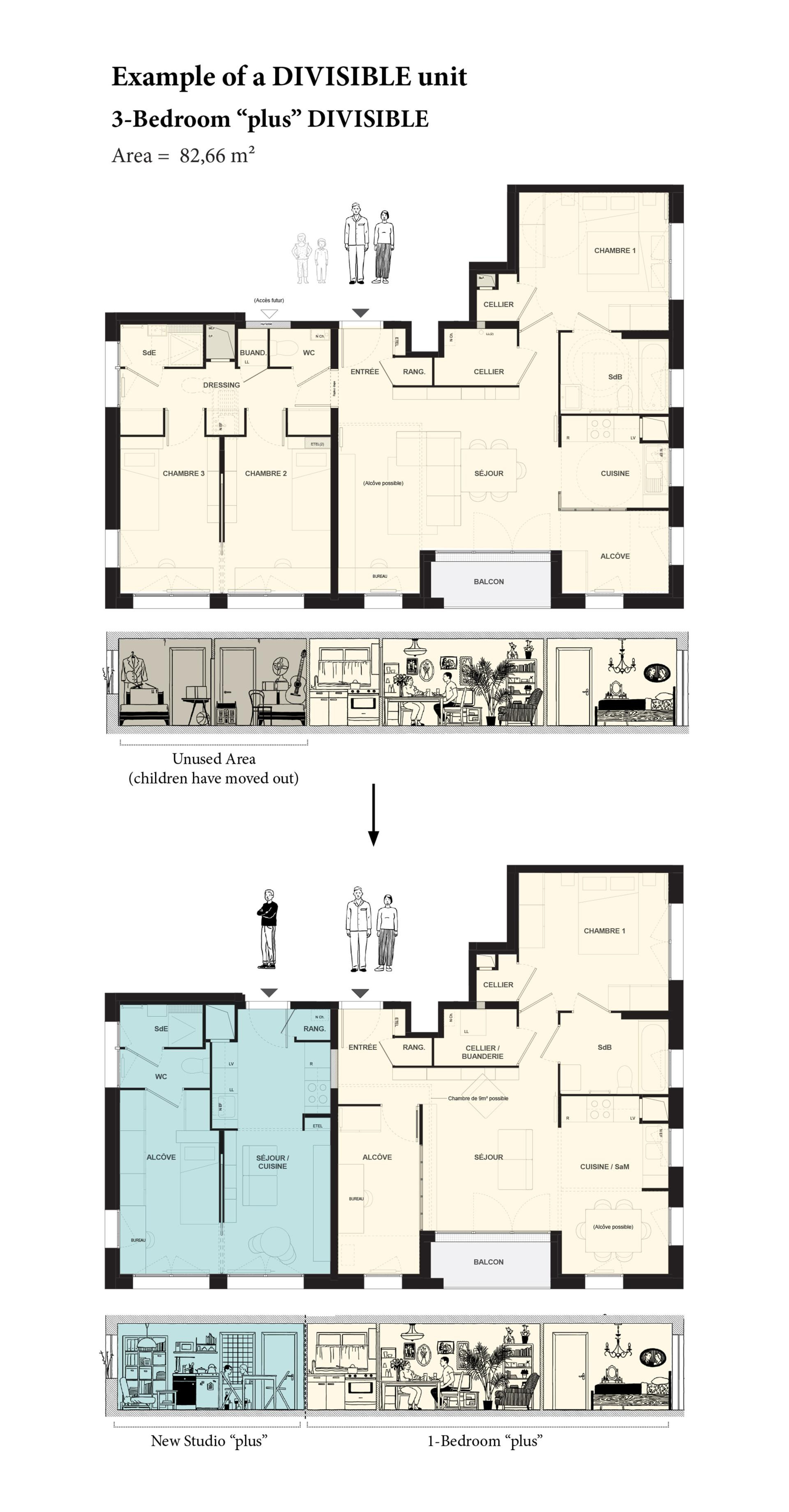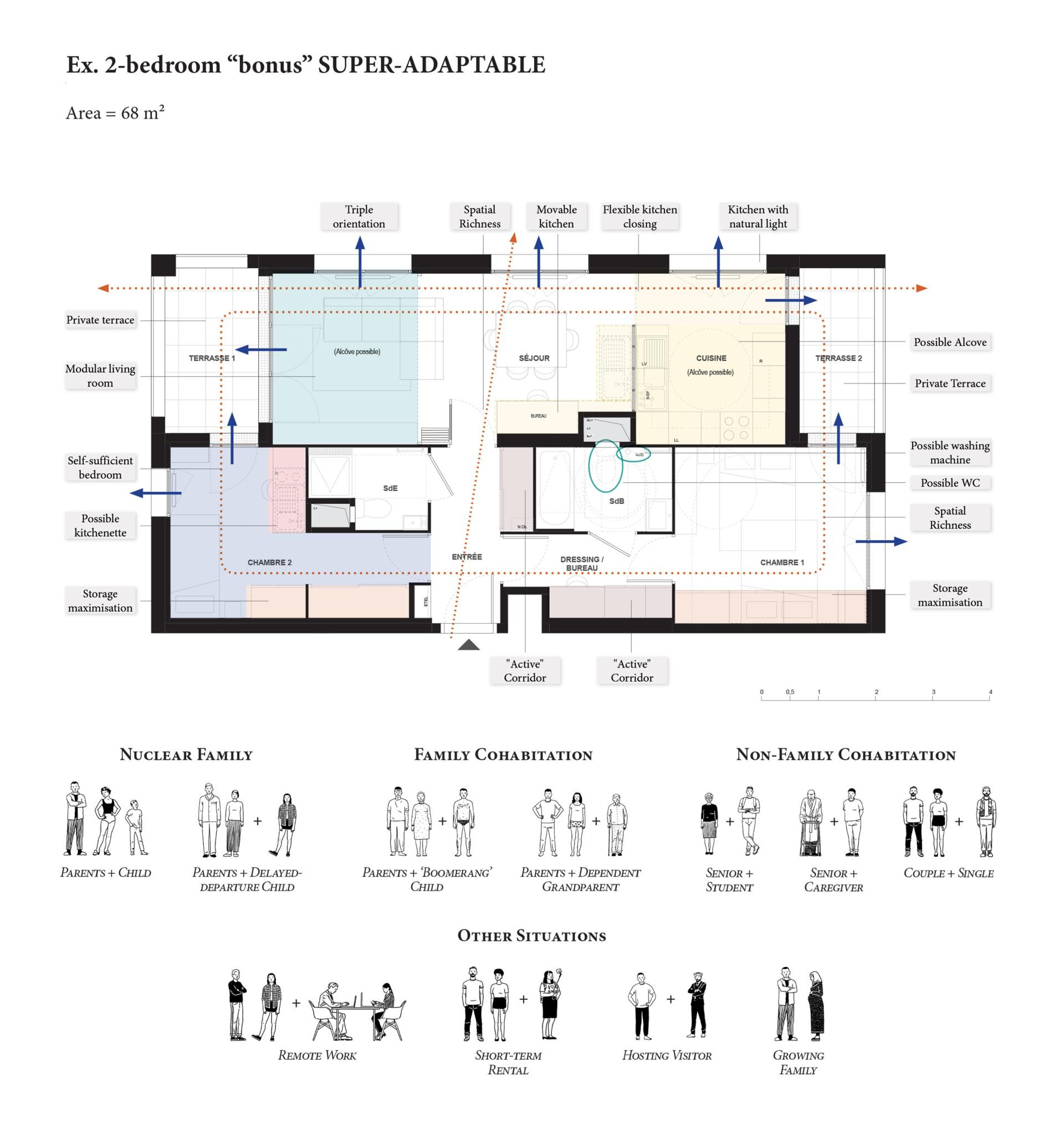 Stanovi se koncipiraju tako da odgovaraju raznolikosti života. Oni se mogu proširiti dolaskom djeteta, kuhinja se može premjestiti da bi se dobila dodatna soba, dječje sobe pretvoriti u mali najamni studio, ili se može otkupiti susjedna jedinica radi praktičnog proširenja. U ovom modelu, stanovanje se fleksibilno mijenja zajedno s obiteljskim i životnim okolnostima.