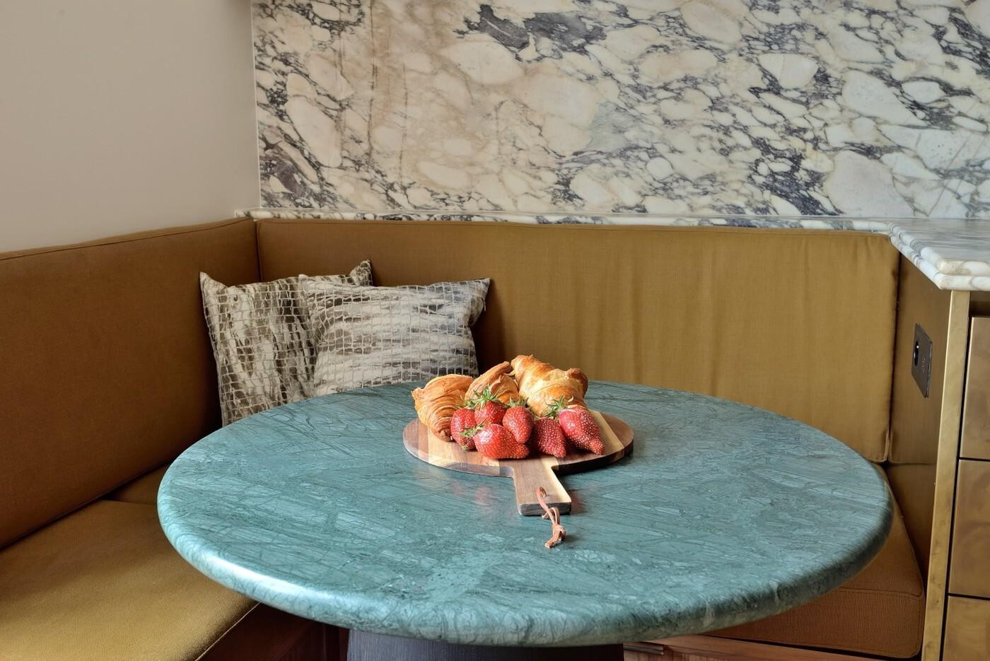 Posebnu pozornost privlači kuhinja po mjeri, opremljena najnovijim kućanskim aparatima, bogatom drvenom stolarijom i luksuznim mramornim radnim površinama. Osim funkcionalnosti, prostor odiše estetskom savršenošću i zamišljen je kao prava mala kulinarska pozornica. Tu se nalazi i manji kutak za neformalne obroke, idealan za jutarnju kavu ili večernju čašu vina.