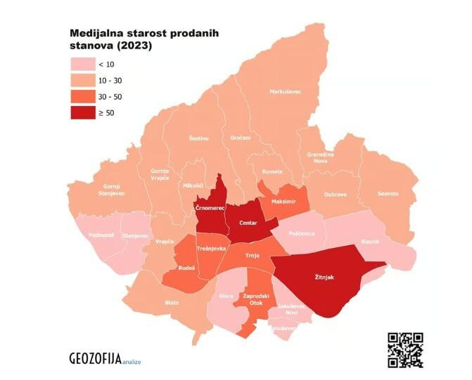 Prema rezultatima analize, u većem dijelu Zagreba medijalna starost prodanih stanova 2023. godine kretala se između 10 i 20 godina. No, razlike među katastarskim općinama bile su izrazite. Najstariji stanovi nalaze se u središtu grada te u Črnomercu i Žitnjaku, gdje medijalna starost prelazi 50 godina, a u samom Centru čak 90 godina. Ove zgrade svjedoče o povijesti Zagreba i ostaju tražene zbog karaktera, visokih stropova, detalja starih parketa i jedinstvenog gradskog identiteta koji nude.