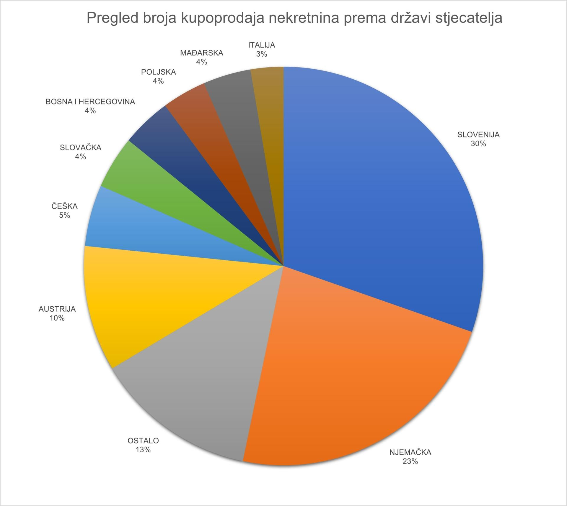Tako su stranci 2023. godine, od ukupno 137.454 transakcije, kupili 12.278 nekretnina, što je oko 8 posto manje nego prethodne godine. Najviše se kupoprodaja odnosilo na kategoriju "različite nekretnine" (3786), slijede stanovi i apartmani (3185), građevinska zemljišta (2728), kuće (830), poljoprivredna zemljišta (551)... Dakle, stranci su činili 8,93 posto prometa u toj godini.